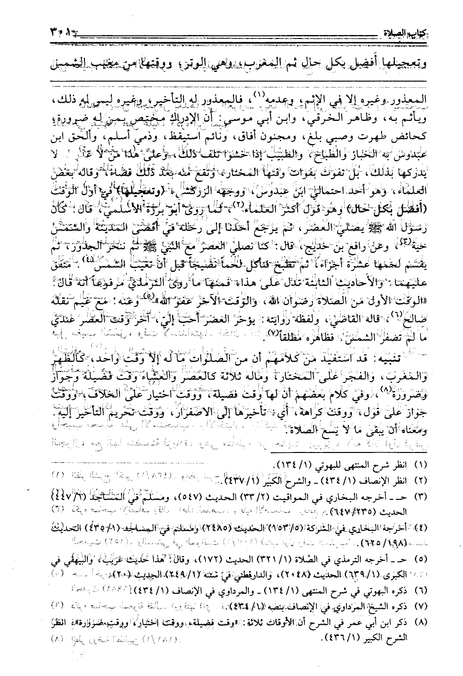 ـــــــــــــــــــــــــــــQالْمَعْذُورِ وَغَيْرِهِ إِلَّا فِي الْإِثْمِ، وَعَدَمِهِ، فَالْمَعْذُورُ لَهُ التَّأْخِيرُ، وَغَيْرُهُ لَيْسَ لَهُ ذَلِكَ، وَيَأْثَمُ بِهِ، وَظَاهِرُ الْخِرَقِيِّ، وَابْنِ أَبِي مُوسَى أَنَّ الْإِدْرَاكَ مُخْتَصٌّ بِمَنْ لَهُ ضَرُورَةٌ، كَحَائِضٍ طَهُرَتْ، وَصَبِيٍّ بَلَغَ، وَمَجْنُونٍ أَفَاقَ، وَنَائِمٍ اسْتَيْقَظَ، وَذِمِّيٍّ أَسْلَمَ، وَألْحقَ ابن عبدوس بِهِ الْخَبَّازُ، وَالطَّبَّاخُ، وَالطَّبِيبُ إِذَا خَشَوْا تَلَفَ ذَلِكَ، وَعَلَى هَذَا مَنْ لَا عُذْرَ لَهُ لَا يُدْرِكُهَا بِذَلِكَ، بَلْ تَفُوتُ بِفَوَاتِ وَقْتِهَا الْمُخْتَارِ، وَتَقَعُ مِنْهُ بَعْدَ ذَلِكَ قَضَاءً، وَقَالَهُ بَعْضُ الْعُلَمَاءِ، وَهُوَ أَحَدُ احْتِمَالَيِ ابْنِ عَبْدُوسٍ، وَوَجَّهَهُ الزَّرْكَشِيُّ (وَتَعْجِيلُهَا) فِي أَوَّلِ الْوَقْتِ (أَفْضَلُ بِكُلِّ حَالٍ) وَهُوَ قَوْلُ أَكْثَرِ الْعُلَمَاءِ لِمَا رَوَى أَبُو بَرْزَةَ الْأَسْلَمِيُّ قَالَ: «كَانَ رَسُولُ اللَّهِ - صَلَّى اللَّهُ عَلَيْهِ وَسَلَّمَ - يُصَلِّي الْعَصْرَ، ثُمَّ يَرْجِعُ أَحَدُنَا إِلَى رَحْلِهِ فِي أَقْصَى الْمَدِينَةِ، وَالشَّمْسُ حَيَّةٌ» وَعَنْ رَافِعِ بْنِ خَدِيجٍ قَالَ: «كُنَّا نُصَلِّي الْعَصْرَ مَعَ النَّبِيِّ - صَلَّى اللَّهُ عَلَيْهِ وَسَلَّمَ - ثُمَّ نَنْحَرُ الْجَزُورَ، ثُمَّ يُقَسَّمُ لَحْمُهَا عَشَرَةَ أَجْزَاءٍ، ثُمَّ تُطْبَخُ فَنَأْكُلُ لَحْمًا نَضِيجًا قَبْلَ أَنْ تَغِيبَ الشَّمْسُ» مُتَّفَقٌ عَلَيْهِمَا، وَالْأَحَادِيثُ الثَّابِتَةُ تَدُلُّ عَلَى هَذَا، فَمِنْهَا: مَا رَوَى التِّرْمِذِيُّ مَرْفُوعًا أَنَّهُ قَالَ: «الْوَقْتُ الْأَوَّلُ مِنَ الصَّلَاةِ رِضْوَانُ اللَّهِ، وَالْوَقْتُ الْآخِرُ عَفْوُ اللَّهِ» وَعَنْهُ: مَعَ غَيْمٍ نَقَلَهُ صَالِحٌ، قَالَهُ الْقَاضِي، وَلَفْظُ رِوَايَتِهِ: يُؤَخَّرُ الْعَصْرُ أَحَبُّ إِلَيَّ، آخِرُ وَقْتِ الْعَصْرِ عِنْدِي مَا لَمْ تَصْفَرَّ الشَّمْسُ. فَظَاهِرُهُ مُطْلَقًا.