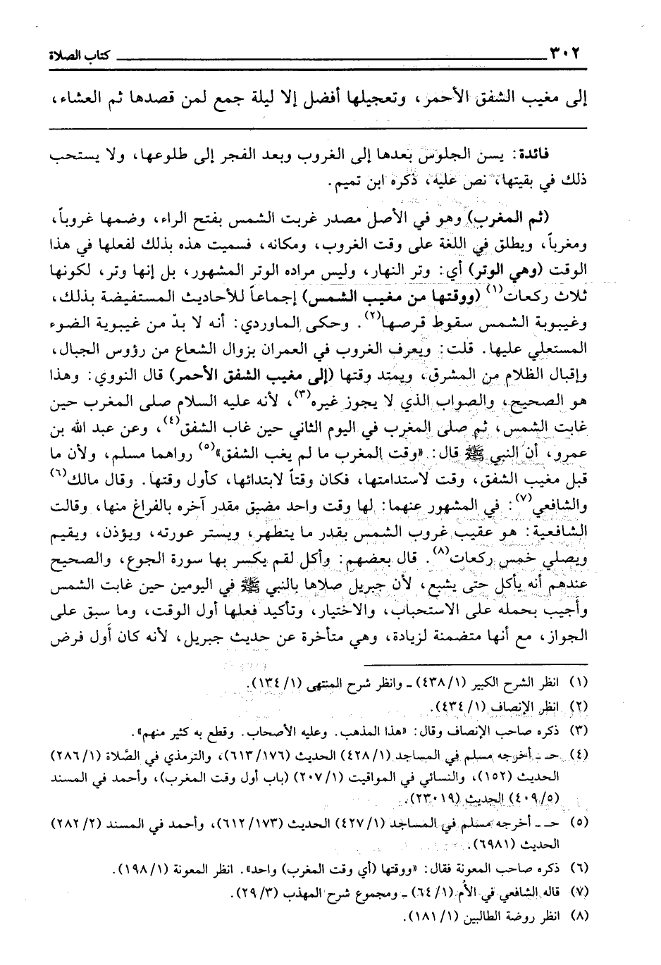 (ثُمَّ الْمَغْرِبُ) وَهُوَ فِي الْأَصْلِ مَصْدَرُ غَرَبَتِ الشَّمْسُ بِفَتْحِ الرَّاءِ، وَضَمِّهَا غُرُوبًا، وَمَغْرِبًا، وَيُطْلَقُ فِي اللُّغَةِ عَلَى وَقْتِ الْغُرُوبِ، وَمَكَانِهِ، فَسُمِّيَتْ هَذِهِ بِذَلِكَ لِفِعْلِهَا فِي هَذَا الْوَقْتِ (وَهِيَ الْوِتْرُ) أَيْ وِتْرُ النَّهَارِ، وَلَيْسَ مُرَادُهُ الْوِتْرَ الْمَشْهُورَ، بَلْ إنَّهَا وِتْرٌ لِكَوْنِهَا ثَلَاثَ رَكَعَاتٍ (وَوَقْتُهَا مِنْ مَغِيبِ الشَّمْسِ) إِجْمَاعًا لِلْأَحَادِيثِ الْمُسْتَفِيضَةِ بِذَلِكَ، وَغَيْبُوبَةُ الشَّمْسِ سُقُوطُ قُرْصِهَا، وَحَكَى الْمَاوَرْدِيُّ أَنَّهُ لَا بُدَّ مِنْ غَيْبُوبَةِ الضَّوْءِ الْمُسْتَعْلِي عَلَيْهَا، قُلْتُ: وَيُعْرَفُ الْغُرُوبُ فِي الْعُمْرَانِ بِزَوَالِ الشُّعَاعِ مِنْ رُءُوسِ الْجِبَالِ، وَإِقْبَالِ الظَّلَامِ مِنَ الْمَشْرِقِ، وَيَمْتَدُّ وَقْتُهَا (إِلَى مَغِيبِ الشَّفَقِ الْأَحْمَرِ) قَالَ النَّوَوِيُّ: وَهَذَا هُوَ الصَّحِيحُ، وَالصَّوَابُ الَّذِي لَا يَجُوزُ غَيْرُهُ، لِأَنَّهُ - عَلَيْهِ السَّلَامُ - «صَلَّى الْمَغْرِبَ حِينَ غَابَتِ الشَّمْسُ، ثُمَّ صَلَّى الْمَغْرِبَ فِي الْيَوْمِ الثَّانِي حِينَ غَابَ الشَّفَقُ» ، وَعَنْ عَبْدِ اللَّهِ بْنِ عَمْرٍو أَنَّ النَّبِيَّ - صَلَّى اللَّهُ عَلَيْهِ وَسَلَّمَ - قَالَ: «وَقْتُ الْمَغْرِبِ مَا لَمْ يَغِبِ الشَّفَقُ» رَوَاهُمَا مُسْلِمٌ، وَلِأَنَّ مَا قَبْلَ مَغِيبِ الشَّفَقِ وَقْتٌ لِاسْتِدَامَتِهَا فَكَانَ وَقْتًا لِابْتِدَائِهَا كَأَوَّلِ وَقْتِهَا، وَقَالَ مَالِكٌ وَالشَّافِعِيُّ فِي الْمَشْهُورِ عَنْهُمَا: لَهَا وَقْتٌ وَاحِدٌ مُضَيَّقٌ مُقَدَّرٌ آخِرُهُ بِالْفَرَاغِ مِنْهَا، وَقَالَتِ الشَّافِعِيَّةُ: هُوَ عُقَيْبَ غُرُوبِ الشَّمْسِ بِقَدْرِ مَا يَتَطَهَّرُ وَيَسْتُرُ عَوْرَتَهُ، وَيُؤَذِّنُ، وَيُقِيمُ، وَيُصَلِّي خَمْسَ رَكَعَاتٍ، قَالَ بَعْضُهُمْ: وَأَكْلِ لُقَمٍ يَكْسِرُ بِهَا سَوْرَةَ الْجُوعِ، وَالصَّحِيحُ عِنْدَهُمْ أَنَّهُ يَأْكُلُ حَتَّى يَشْبَعَ، لِأَنَّ جِبْرِيلَ صَلَّاهَا بِالنَّبِيِّ - صَلَّى اللَّهُ عَلَيْهِ وَسَلَّمَ - فِي الْيَوْمَيْنِ حِينَ غَابَتِ الشَّمْسُ، وَأُجِيبَ بِحَمْلِهِ عَلَى الِاسْتِحْبَابِ، وَالِاخْتِيَارِ، وَتَأْكِيدِ فِعْلِهَا أَوَّلَ الْوَقْتِ، وَمَا سَبَقَ عَلَى الْجَوَازِ، مَعَ أَنَّهَا مُتَضَمِّنَةٌ لِزِيَادَةٍ، وَهِيَ مُتَأَخِّرَةٌ عَنْ حَدِيثِ جِبْرِيلَ، لِأَنَّهُ كَانَ أَوَّلَ فَرْضِ