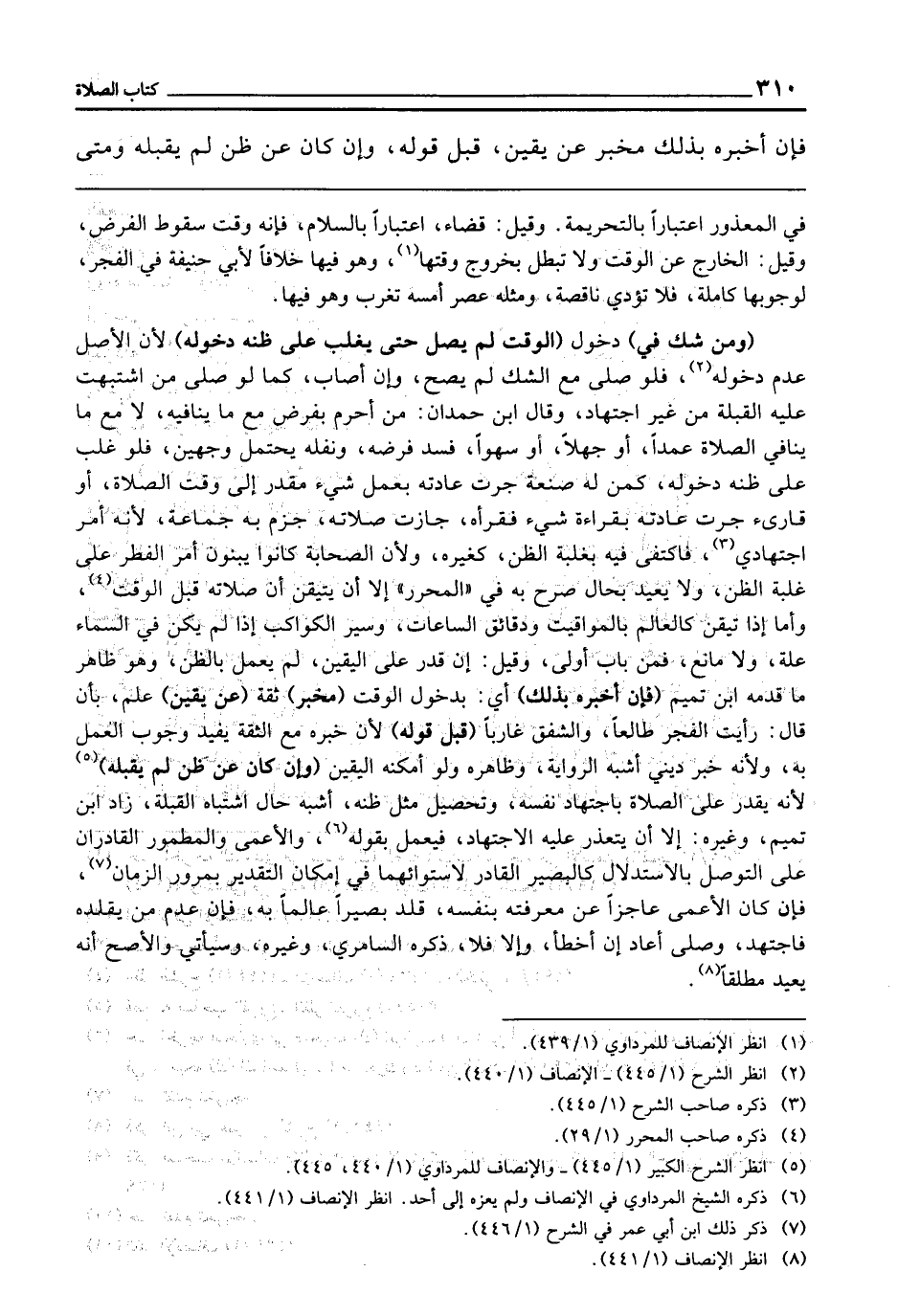 (وَمَنْ شَكَّ فِي) دُخُولِ (الْوَقْتِ لَمْ يُصَلِّ حَتَّى يَغْلِبَ عَلَى ظَنِّهِ دُخُولُهُ) لِأَنَّ الْأَصْلَ عَدَمُ دُخُولِهِ، فَلَوْ صَلَّى مَعَ الشَّكِّ لَمْ يَصِحَّ وَإِنْ أَصَابَ، كَمَا لَوْ صَلَّى مَنِ اشْتَبَهَتْ عَلَيْهِ الْقِبْلَةُ مِنْ غَيْرِ اجْتِهَادٍ، وَقَالَ ابْنُ حَمْدَانَ: مَنْ أَحْرَمَ بِفَرْضٍ مَعَ مَا يُنَافِيهِ، لَا مَعَ مَا يُنَافِي الصَّلَاةَ عَمْدًا، أَوْ جَهْلًا أَوْ سَهْوًا، فَسَدَ فَرْضُهُ وَنَفْلُهُ يَحْتَمِلُ وَجْهَيْنِ، فَلَوْ غَلَبَ عَلَى ظَنِّهِ دُخُولُهُ كَمَنْ لَهُ صَنْعَةٌ جَرَتْ عَادَتُهُ بِعَمَلِ شَيْءٍ مُقَدَّرٍ إِلَى وَقْتِ الصَّلَاةِ، أَوْ قَارِئٍ جَرَتْ عَادَتُهُ بِقِرَاءَةِ شَيْءٍ فَقَرَأَهُ، جَازَتْ صَلَاتُهُ، جَزَمَ بِهِ جَمَاعَةٌ، لِأَنَّهُ أَمْرٌ اجْتِهَادِيٌّ، فَاكْتُفِيَ فِيهِ بِغَلَبَةِ الظَّنِّ كَغَيْرِهِ، وَلِأَنَّ الصَّحَابَةَ كَانُوا يَبْنُونَ أَمْرَ الْفِطْرِ عَلَى غَلَبَةِ الظَّنِّ، وَلَا يُعِيدُ بِحَالٍ، صَرَّحَ بِهِ فِي " الْمُحَرَّرِ " إِلَّا أَنْ يَتَيَقَّنَ أَنَّ صَلَاتَهُ قَبْلَ الْوَقْتِ، وَأَمَّا إِذَا تَيَقَّنَ كَالْعَالِمِ بِالْمَوَاقِيتِ وَدَقَائِقِ السَّاعَاتِ، وَسَيْرِ الْكَوَاكِبِ إِذَا لَمْ يَكُنْ فِي السَّمَاءِ عِلَّةٌ، وَلَا مَانِعَ فَمِنْ بَابِ أَوْلَى، وَقِيلَ: إِنْ قَدَرَ عَلَى الْيَقِينِ لَمْ يَعْمَلْ بِالظَّنِّ، وَهُوَ ظَاهِرُ مَا قَدَّمَهُ ابْنُ تَمِيمٍ (فَإِنْ أَخْبَرَهُ بِذَلِكَ) أَيْ: بِدُخُولِ الْوَقْتِ (مُخْبِرٌ) ثِقَةٌ (عَنْ يَقِينٍ) عِلْمٍ بِأَنْ قَالَ: رَأَيْتُ الْفَجْرَ طَالِعًا، وَالشَّفَقَ غَارِبًا (قَبِلَ قَوْلَهُ) لِأَنَّ خَبَرَهُ مَعَ الثِّقَةِ يُفِيدُ وُجُوبَ الْعَمَلِ بِهِ، وَلِأَنَّهُ خَبَرٌ دِينِيٌّ أَشْبَهَ الرِّوَايَةَ، وَظَاهِرُهُ وَلَوْ أَمْكَنَهُ الْيَقِينُ (وَإِنْ كَانَ عَنْ ظَنٍّ لَمْ يَقْبَلْهُ) لِأَنَّهُ يَقْدِرُ عَلَى الصَّلَاةِ بِاجْتِهَادِ نَفْسِهِ، وَتَحْصِيلِ مِثْلِ ظَنِّهِ أَشْبَهَ حَالَ اشْتِبَاهِ الْقِبْلَةِ، زَادَ ابْنُ تَمِيمٍ، وَغَيْرُهُ: إِلَّا أَنْ يَتَعَذَّرَ عَلَيْهِ الِاجْتِهَادُ فَيَعْمَلَ بِقَوْلِهِ، وَالْأَعْمَى وَالْمَطْمُورُ الْقَادِرَانِ عَلَى التَّوَصُّلِ بِالِاسْتِدْلَالِ كَالْبَصِيرِ الْقَادِرِ لِاسْتِوَائِهِمَا فِي إِمْكَانِ التَّقْدِيرِ بِمُرُورِ الزَّمَانِ، فَإِنْ كَانَ الْأَعْمَى عَاجِزًا عَنْ مَعْرِفَتِهِ بِنَفْسِهِ، قَلَّدَ بَصِيرًا عَالِمًا بِهِ، فَإِنْ عَدِمَ مَنْ يُقَلِّدُهُ فَاجْتَهَدَ، وَصَلَّى أَعَادَ إِنْ أَخْطَأَ، وَإِلَّا فَلَا، ذَكَرَهُ السَّامِرِيُّ، وَغَيْرُهُ، وَسَيَأْتِي، وَالْأَصَحُّ أَنَّهُ يُعِيدُ مُطْلَقًا.