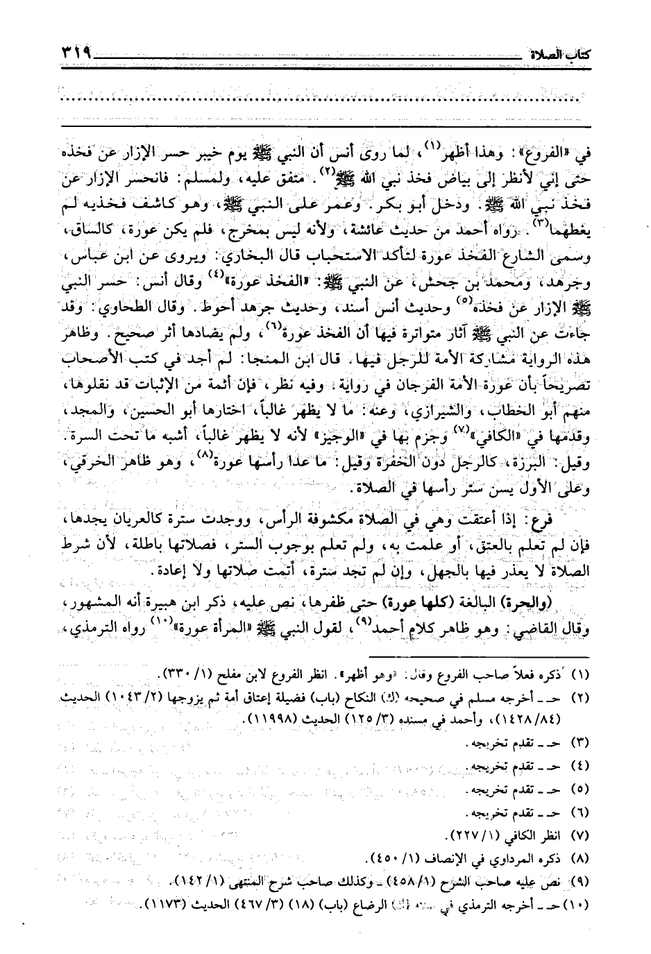 ـــــــــــــــــــــــــــــQفِي " الْفُرُوعِ ": وَهَذَا أَظْهَرُ لِمَا رَوَى أَنَسٌ: «أَنَّ النَّبِيَّ - صَلَّى اللَّهُ عَلَيْهِ وَسَلَّمَ - يَوْمَ خَيْبَرَ حَسَرَ الْإِزَارَ عَنْ فَخِذِهِ، حَتَّى إِنِّي لَأَنْظُرُ إِلَى بَيَاضِ فَخِذِ نَبِيِّ اللَّهِ - صَلَّى اللَّهُ عَلَيْهِ وَسَلَّمَ -» مُتَّفَقٌ عَلَيْهِ، وَلِمُسْلِمٍ: «فَانْحَسَرَ الْإِزَارُ عَنْ فَخْذِ نَبِيِّ اللَّهِ - صَلَّى اللَّهُ عَلَيْهِ وَسَلَّمَ - وَدَخَلَ أَبُو بَكْرٍ وَعُمَرُ عَلَى النَّبِيِّ - صَلَّى اللَّهُ عَلَيْهِ وَسَلَّمَ - وَهُوَ كَاشِفٌ فَخْذَيْهِ لَمْ يُغَطِّهِمَا» رَوَاهُ أَحْمَدُ مِنْ حَدِيثِ عَائِشَةَ، وَلِأَنَّهُ لَيْسَ بِمُخَرَّجٍ، فَلَمْ يَكُنْ عَوْرَةً كَالسَّاقِ، وَسَمَّى الشَّارِعُ الْفَخِذَ عَوْرَةً لِتَأَكُّدِ الِاسْتِحْبَابِ قَالَ الْبُخَارِيُّ: وَيُرْوَى عَنِ ابْنِ عَبَّاسٍ، وَجَرْهَدٍ، وَمُحَمَّدِ بْنِ جَحْشٍ عَنِ النَّبِيِّ - صَلَّى اللَّهُ عَلَيْهِ وَسَلَّمَ - «الْفَخِذُ عَوْرَةٌ» وَقَالَ أَنَسٌ: «حَسَرَ النَّبِيُّ - صَلَّى اللَّهُ عَلَيْهِ وَسَلَّمَ - الْإِزَارَ عَنْ فَخْذِهِ» وَحَدِيثُ أَنَسٍ أَسْنَدُ، وَحَدِيثُ جَرْهَدٍ أَحْوَطُ، وَقَالَ الطَّحَاوِيُّ: وَقَدْ جَاءَتْ عَنِ النَّبِيِّ - صَلَّى اللَّهُ عَلَيْهِ وَسَلَّمَ - آثَارٌ مُتَوَاتِرَةٌ فِيهَا: أَنَّ الْفَخِذَ عَوْرَةٌ، وَلَمْ يُضَادَّهَا أَثَرٌ صَحِيحٌ، وَظَاهِرُ هَذِهِ الرِّوَايَةِ مُشَارَكَةُ الْأَمَةِ لِلرَّجُلِ فِيهَا، قَالَ ابْنُ الْمُنَجَّا: لَمْ أَجِدْ فِي كُتُبِ الْأَصْحَابِ تَصْرِيحًا بِأَنَّ عَوْرَةَ الْأَمَةِ الْفَرْجَانِ فِي رِوَايَةٍ، وَفِيهِ نَظَرٌ، فَإِنَّ أَئِمَّةً مِنَ الْأَثْبَاتِ قَدْ نَقَلُوهَا مِنْهُمْ أَبُو الْخَطَّابِ، وَالشِّيرَازِيُّ، وَعَنْهُ: مَا لَا يَظْهَرُ غَالِبًا، اخْتَارَهَا أَبُو الْحُسَيْنِ، وَالْمَجْدُ، وَقَدَّمَهَا فِي " الْكَافِي " وَجَزَمَ بِهَا فِي " الْوَجِيزِ " لِأَنَّهُ لَا يَظْهَرُ غَالِبًا، أَشْبَهَ مَا تَحْتَ السُّرَّةِ، وَقِيلَ: الْبَرْزَةُ كَالرَّجُلِ دُونَ الْخَفْرَةِ، وَقِيلَ: مَا عَدَا رَأْسَهَا عَوْرَةٌ، وَهُوَ ظَاهِرُ الْخِرَقِيِّ، وَعَلَى الْأَوَّلِ: يُسَنُّ سَتْرُ رَأْسِهَا فِي الصَّلَاةِ.