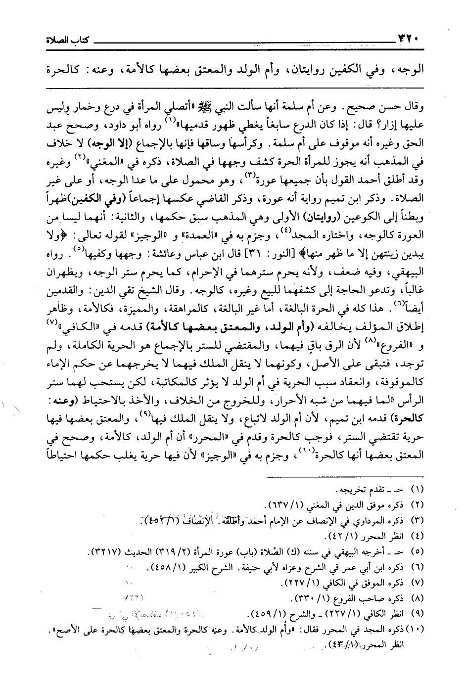 ـــــــــــــــــــــــــــــQوَقَالَ: حَسَنٌ صَحِيحٌ، وَعَنْ أُمِّ سَلَمَةَ: «أَنَّهَا سَأَلَتِ النَّبِيَّ - صَلَّى اللَّهُ عَلَيْهِ وَسَلَّمَ - أَتُصَلِّي الْمَرْأَةُ فِي دِرْعٍ وَخِمَارٍ، وَلَيْسَ عَلَيْهَا إِزَارٌ؛ قَالَ: إِذَا كَانَ الدِّرْعُ سَابِغًا يُغَطِّي ظُهُورَ قَدَمَيْهَا» رَوَاهُ أَبُو دَاوُدَ، وَصَحَّحَ عَبْدُ الْحَقِّ، وَغَيْرُهُ أَنَّهُ مَوْقُوفٌ عَلَى أُمِّ سَلَمَةَ، وَكَرَأْسِهَا وَسَاقِهَا فَإِنَّهَا بِالْإِجْمَاعِ (إِلَّا الْوَجْهَ) لَا خِلَافَ فِي الْمَذْهَبِ أَنَّهُ يَجُوزُ لِلْمَرْأَةِ الْحُرَّةِ كَشْفُ وَجْهِهَا فِي الصَّلَاةِ، ذَكَرَهُ فِي " الْمُغْنِي " وَغَيْرِهِ، وَقَدْ أَطْلَقَ أَحْمَدُ الْقَوْلَ بِأَنَّ جَمِيعَهَا عَوْرَةٌ، وَهُوَ مَحْمُولٌ عَلَى مَا عَدَا الْوَجْهَ، أَوْ عَلَى غَيْرِ الصَّلَاةِ، وَذَكَرَ ابْنُ تَمِيمٍ رِوَايَةَ أَنَّهُ عَوْرَةٌ، وَذَكَرَ الْقَاضِي عَكْسَهَا إِجْمَاعًا (وَفِي الْكَفَّيْنِ) ظَهْرًا وَبَطْنًا إِلَى الْكُوعَيْنِ (رِوَايَتَانِ) الْأُولَى، وَهِيَ الْمَذْهَبُ، سَبَقَ حُكْمُهَا، وَالثَّانِيَةُ: أَنَّهُمَا لَيْسَا مِنَ الْعَوْرَةِ كَالْوَجْهِ، وَاخْتَارَهُ الْمَجْدُ، وَجَزَمَ بِهِ فِي الْعُمْدَةِ و" الْوَجِيزِ " لِقَوْلِهِ تَعَالَى {وَلا يُبْدِينَ زِينَتَهُنَّ إِلا مَا ظَهَرَ مِنْهَا} [النور: 31] قَالَ ابْنُ عَبَّاسٍ، وَعَائِشَةُ: وَجْهَهَا وَكَفَّيْهَا، رَوَاهُ الْبَيْهَقِيُّ، وَفِيهِ ضَعْفٌ، وَلِأَنَّهُ يَحْرُمُ سَتْرُهُمَا فِي الْإِحْرَامِ كَمَا يَحْرُمُ سَتْرُ الْوَجْهِ، وَيَظْهَرَانِ غَالِبًا، وَتَدْعُو الْحَاجَةُ إِلَى كَشْفِهِمَا لِلْبَيْعِ، وَغَيْرِهِ كَالْوَجْهِ، وَقَالَ الشَّيْخُ تَقِيُّ الدِّينِ: وَالْقَدَمَيْنِ أَيْضًا. هَذَا كُلُّهُ فِي الْحُرَّةِ الْبَالِغَةِ أَمَّا غَيْرُ الْبَالِغَةِ، كَالْمُرَاهِقَةِ وَالْمُمَيِّزَةِ فَكَالْأَمَةِ، وَظَاهِرُ إِطْلَاقِ الْمُؤَلِّفِ يُخَالِفُهُ (وَأُمُّ الْوَلَدِ، وَالْمُعْتَقُ بَعْضُهَا كَالْأَمَةِ) قَدَّمَهُ فِي " الْكَافِي " و" الْفُرُوعِ " لِأَنَّ الرِّقَّ بَاقٍ فِيهِمَا، وَالْمُقْتَضِي لِلسَّتْرِ بِالْإِجْمَاعِ هُوَ الْحُرِّيَّةُ الْكَامِلَةُ، وَلَمْ تُوجَدْ فَتَبْقَى عَلَى الْأَصْلِ، وَكَوْنُهُمَا لَا يُنْقَلُ الْمِلْكُ فِيهِمَا لَا يُخْرِجُهُمَا عَنْ حُكْمِ الْإِمَاءِ كَالْمَوْقُوفَةِ، وَانْعِقَادُ سَبَبِ الْحُرِّيَّةِ فِي أُمِّ الْوَلَدِ لَا يُؤَثِّرُ كَالْمُكَاتَبَةِ، لَكِنْ يُسْتَحَبُّ لَهُمَا سَتْرُ الرَّأْسِ لِمَا فِيهِمَا مِنْ شَبَهِ الْأَحْرَارِ، وَلِلْخُرُوجِ مِنَ الْخِلَافِ، وَالْأَخْذِ بِالِاحْتِيَاطِ (وَعَنْهُ: كَالْحُرَّةِ) قَدَّمَهُ ابْنُ تَمِيمٍ، لِأَنَّ أُمَّ الْوَلَدِ لَا تُبَاعُ، وَلَا يُنْقَلُ الْمِلْكُ فِيهَا، وَالْمُعْتَقُ بَعْضُهَا فِيهَا حُرِّيَّةٌ تَقْتَضِي السَّتْرَ، فَوَجَبَ كَالْحُرَّةِ، وَقُدِّمَ فِي " الْمُحَرَّرِ " أَنَّ أُمَّ الْوَلَدِ كَالْأَمَةِ، وَصَحَّحَ فِي الْمُعْتَقِ بَعْضُهَا أَنَّهَا كَالْحُرَّةِ، وَجَزَمَ بِهِ فِي " الْوَجِيزِ " لِأَنَّ فِيهَا حُرِّيَّةً يَغْلِبُ حُكْمُهَا احْتِيَاطًا