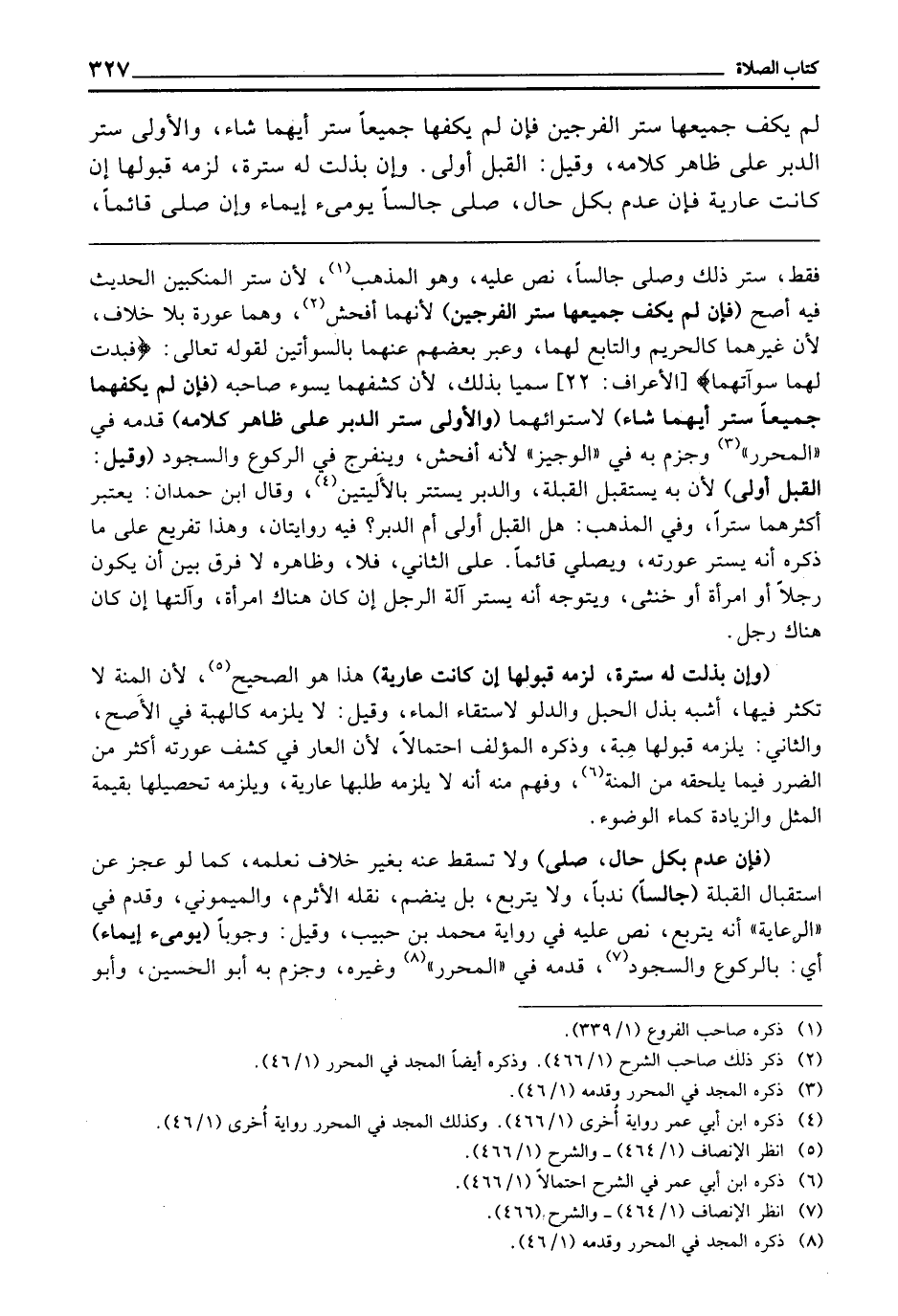 ـــــــــــــــــــــــــــــQفَقَطْ، سَتَرَ ذَلِكَ، وَصَلَّى جَالِسًا، نُصَّ عَلَيْهِ، وَهُوَ الْمَذْهَبُ، لِأَنَّ سَتْرَ الْمَنْكِبَيْنِ الْحَدِيثُ فِيهِ أَصَحُّ (فَإِنْ لَمْ يَكْفِ جَمِيعَهَا سَتَرَ الْفَرْجَيْنِ) لِأَنَّهُمَا أَفْحَشُ، وَهُمَا عَوْرَةٌ بِلَا خِلَافٍ، لِأَنَّ غَيْرَهُمَا كَالْحَرِيمِ، وَالتَّابِعِ لَهُمَا، وَعَبَّرَ بَعْضُهُمْ عَنْهُمَا بِالسَّوْأَتَيْنِ لِقَوْلِهِ تَعَالَى {فَبَدَتْ لَهُمَا سَوْآتُهُمَا} [طه: 121] سُمِّيَا بِذَلِكَ، لِأَنَّ كَشْفَهُمَا يَسُوءُ صَاحِبَهُ (فَإِنْ لَمْ يَكْفِهِمَا جَمِيعًا سَتَرَ أَيَّهُمَا شَاءَ) لِاسْتِوَائِهِمَا (وَالْأَوْلَى سَتْرُ الدُّبُرِ عَلَى ظَاهِرِ كَلَامِهِ) قَدَّمَهُ فِي " الْمُحَرَّرِ " وَجَزَمَ بِهِ فِي " الْوَجِيزِ " لِأَنَّهُ أَفْحَشُ، وَيَنْفَرِجُ فِي الرُّكُوعِ وَالسُّجُودِ (وَقِيلَ: الْقُبُلُ أَوْلَى) لِأَنَّ بِهِ يَسْتَقْبِلُ الْقِبْلَةَ، وَالدُّبُرُ يَسْتَتِرُ بِالْأَلْيَتَيْنِ، وَقَالَ ابْنُ حَمْدَانَ: يُعْتَبَرُ أَكْثَرُهُمَا سَتْرًا، وَفِي الْمَذْهَبِ: هَلِ الْقُبُلُ أَوْلَى أَمِ الدُّبُرُ؛ فِيهِ رِوَايَتَانِ، وَهَذَا تَفْرِيعٌ عَلَى مَا ذَكَرَهُ أَنَّهُ يسْترُ عورته ويصلي قَائِمًا، عَلَى الثَّانِي: فَلَا، وَظَاهِرُهُ لَا فَرْقَ بَيْنَ أَنْ يَكُونَ رَجُلًا أَوِ امْرَأَةً أَوْ خُنْثَى، وَيُتَوَجَّهُ أَنَّهُ يُسْتَرُ آلَةُ الرَّجُلِ إِنْ كَانَ هُنَاكَ امْرَأَةٌ، وَآلَتُهَا إِنْ كَانَ هُنَاكَ رَجُلٌ.