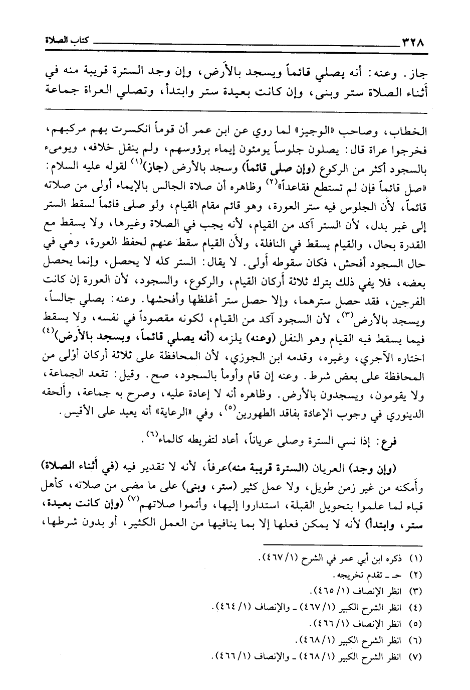ـــــــــــــــــــــــــــــQالْخَطَّابِ، وَصَاحِبُ " الْوَجِيزِ " لِمَا رُوِيَ عَنِ ابْنِ عُمَرَ أَنَّ قَوْمًا انْكَسَرَتْ بِهِمْ مَرْكِبُهُمْ فَخَرَجُوا عُرَاةً، قَالَ: يُصَلُّونَ جُلُوسًا يُومِئُونَ إِيمَاءً بِرُءُوسِهِمْ، وَلَمْ يُنْقَلْ خِلَافُهُ، وَيُومِئُ بِالسُّجُودِ أَكْثَرَ مِنَ الرُّكُوعِ (وَإِنْ صَلَّى قَائِمًا) وَسَجَدَ بِالْأَرْضِ (جَازَ) لِقَوْلِهِ - عَلَيْهِ السَّلَامُ -: «صَلِّ قَائِمًا، فَإِنْ لَمْ تَسْتَطِعْ فَقَاعِدًا» وَظَاهِرُهُ أَنَّ صَلَاةَ الْجَالِسِ بِالْإِيمَاءِ أَوْلَى مِنْ صَلَاتِهِ قَائِمًا، لِأَنَّ الْجُلُوسَ فِيهِ سَتْرُ الْعَوْرَةِ، وَهُوَ قَائِمٌ مَقَامَ الْقِيَامِ، وَلَوْ صَلَّى قَائِمًا لَسَقَطَ السَّتْرُ إِلَى غَيْرِ بَدَلٍ، لِأَنَّ السَّتْرَ آكَدُ مِنَ الْقِيَامِ، لِأَنَّهُ يَجِبُ فِي الصَّلَاةِ وَغَيْرِهَا، وَلَا يَسْقُطُ مَعَ الْقُدْرَةِ بِحَالٍ، وَالْقِيَامُ يَسْقُطُ فِي النَّافِلَةِ، وَلِأَنَّ الْقِيَامَ سَقَطَ عَنْهُمْ لِحِفْظِ الْعَوْرَةِ، وَهِيَ فِي حَالِ السُّجُودِ أَفْحَشُ، فَكَانَ سُقُوطُهُ أَوْلَى، لَا يُقَالُ: السَّتْرُ كُلُّهُ لَا يَحْصُلُ، وَإِنَّمَا يَحْصُلُ بَعْضُهُ، فَلَا يَفِي ذَلِكَ بِتَرْكِ ثَلَاثَةِ أَرْكَانٍ: الْقِيَامُ، وَالرُّكُوعُ، وَالسُّجُودُ، لِأَنَّ الْعَوْرَةَ إِنْ كَانَتِ الْفَرْجَيْنِ فَقَدْ حَصَلَ سَتْرُهُمَا، وَإِلَّا حَصَلَ سَتْرُ أَغْلَظِهَا وَأَفْحَشِهَا، وَعَنْهُ: يُصَلِّي جَالِسًا، وَيَسْجُدُ بِالْأَرْضِ، لِأَنَّ السُّجُودَ آكَدُ مِنَ الْقِيَامِ لِكَوْنِهِ مَقْصُودًا فِي نَفْسِهِ، وَلَا يَسْقُطُ فِيمَا يَسْقُطُ فِيهِ الْقِيَامُ، وَهُوَ النَّفْلُ (وَعَنْهُ:) يَلْزَمُهُ (أَنَّهُ يُصَلِّي قَائِمًا، وَيَسْجُدُ بِالْأَرْضِ) اخْتَارَهُ الْآجُرِّيُّ، وَغَيْرُهُ، وَقَدَّمَهُ ابْنُ الْجَوْزِيِّ، لِأَنَّ الْمُحَافَظَةَ عَلَى ثَلَاثَةِ أَرْكَانٍ أَوْلَى مِنَ الْمُحَافَظَةِ عَلَى بَعْضِ شَرْطٍ، وَعَنْهُ: إِنْ قَامَ وَأَوْمَأَ بِالسُّجُودِ صَحَّ، وَقِيلَ: تَقْعُدُ الْجَمَاعَةُ، وَلَا يَقُومُونَ، وَيَسْجُدُونَ بِالْأَرْضِ، وَظَاهِرُهُ أَنَّهُ لَا إِعَادَةَ عَلَيْهِ، وَصَرَّحَ بِهِ جَمَاعَةٌ، وَأَلْحَقَهُ الدِّينَوَرِيُّ فِي وُجُوبِ الْإِعَادَةِ بِفَاقِدِ الطَّهُورَيْنِ، وَفِي " الرِّعَايَةِ " أَنَّهُ يُعِيدُ عَلَى الْأَقْيَسِ.