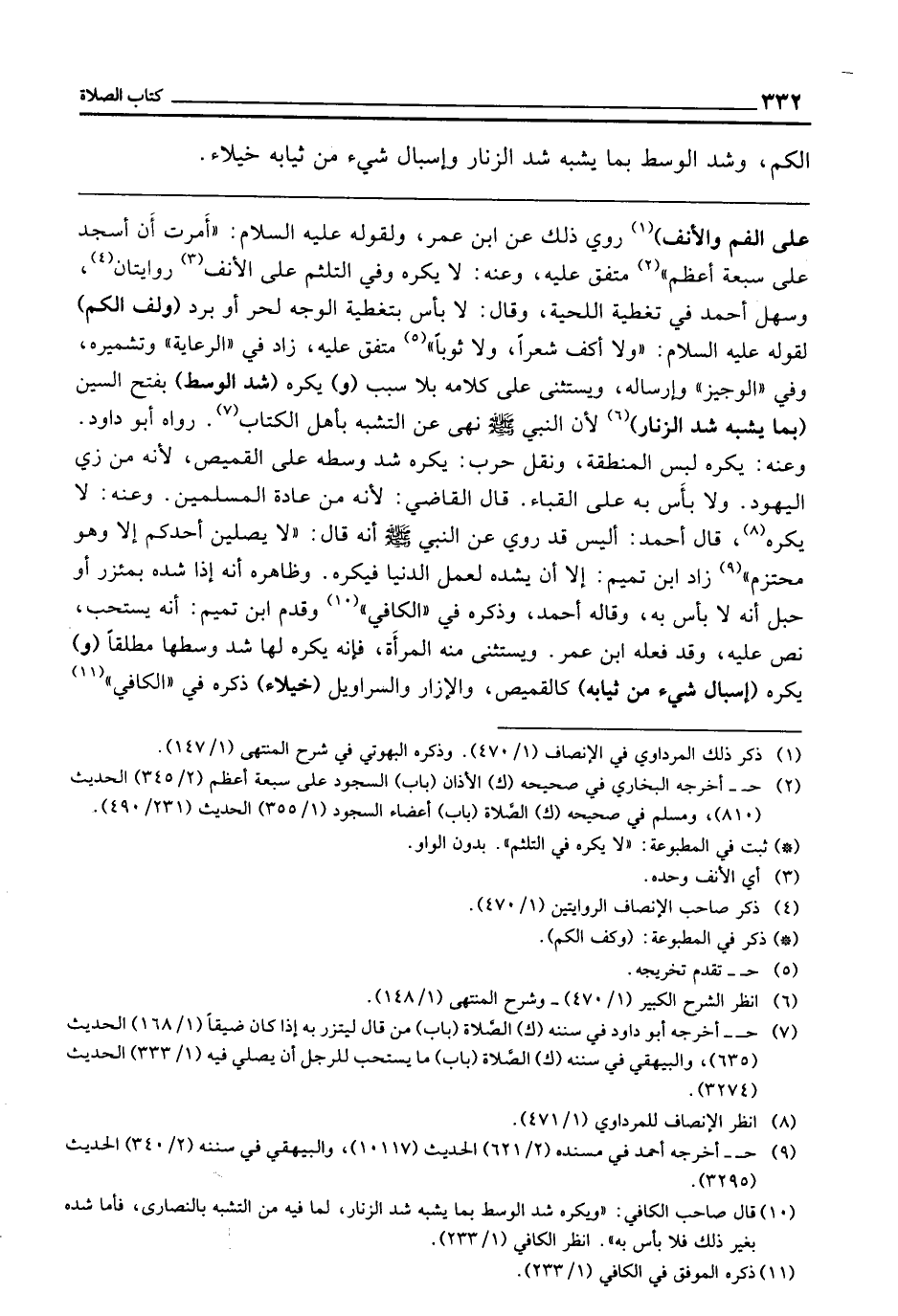 ـــــــــــــــــــــــــــــQعَلَى الْفَمِ، وَالْأَنْفِ) رُوِيَ ذَلِكَ عَنِ ابْنِ عُمَرَ، وَلِقَوْلِهِ - عَلَيْهِ السَّلَامُ -: «أُمِرْتُ أَنْ أَسْجُدَ عَلَى سَبْعَةِ أَعْظُمٍ» مُتَّفَقٌ عَلَيْهِ. وَعَنْهُ: لَا يُكْرَهُ. وَفِي التَّلَثُّمِ عَلَى الْأَنْفِ رِوَايَتَانِ، وَسَهَّلَ أَحْمَدُ فِي تَغْطِيَةِ اللِّحْيَةِ، وَقَالَ لَا بَأْسَ بِتَغْطِيَةِ الْوَجْهِ لِحَرٍّ أَوْ بَرْدٍ (وَلَفُّ الْكُمِّ) لِقَوْلِهِ - عَلَيْهِ السَّلَامُ -: «وَلَا أَكُفُّ شَعْرًا، وَلَا ثَوْبًا» مُتَّفَقٌ عَلَيْهِ. زَادَ فِي " الرِّعَايَةِ " وَتَشْمِيرُهُ، وَفِي " الْوَجِيزِ " وَإِرْسَالُهُ، وَيُسْتَثْنَى عَلَى كَلَامِهِ بِلَا سَبَبٍ (و) يُكْرَهُ (شَدُّ الْوَسَطِ) بِفَتْحِ السِّينِ (بِمَا يُشْبِهُ شَدَّ الزُّنَّارِ) «لِأَنَّ النَّبِيَّ - صَلَّى اللَّهُ عَلَيْهِ وَسَلَّمَ - نَهَى عَنِ التَّشَبُّهِ بِأَهْلِ الْكِتَابِ» رَوَاهُ أَبُو دَاوُدَ، وَعَنْهُ: يُكْرَهُ لُبْسُ الْمِنْطَقَةِ، وَنَقَلَ حَرْبٌ: يُكْرَهُ شَدُّ وَسَطِهِ عَلَى الْقَمِيصِ، لِأَنَّهُ مِنْ زِيِّ الْيَهُودِ، وَلَا بَأْسَ بِهِ عَلَى الْقُبَاءِ، قَالَ الْقَاضِي: لِأَنَّهُ مِنْ عَادَةِ الْمُسْلِمِينَ، وَعَنْهُ: لَا يُكْرَهُ، قَالَ أَحْمَدُ: أَلَيْسَ قَدْ رُوِيَ عَنِ النَّبِيِّ - صَلَّى اللَّهُ عَلَيْهِ وَسَلَّمَ - أَنَّهُ قَالَ: «لَا يُصَلِّيَنَّ أَحَدُكُمْ إِلَّا وَهُوَ مُحْتَزِمٌ» زَادَ ابْنُ تَمِيمٍ إِلَّا أَنْ يَشُدَّهُ لِعَمَلِ الدُّنْيَا فَيُكْرَهُ، وَظَاهِرُهُ أَنَّهُ إِذَا شَدَّهُ بِمِئْزَرٍ أَوْ حَبْلٍ أَنَّهُ لَا بَأْسَ بِهِ، وَقَالَهُ أَحْمَدُ، وَذَكَرَهُ فِي " الْكَافِي " وَقَدَّمَ ابْنُ تَمِيمٍ أَنَّهُ يُسْتَحَبُّ، نُصَّ عَلَيْهِ، وَقَدْ فَعَلَهُ ابْنُ عُمَرَ، وَيُسْتَثْنَى مِنْهُ الْمَرْأَةُ، فَإِنَّهُ يُكْرَهُ لَهَا شَدُّ وَسَطِهَا مُطْلَقًا (و) يُكْرَهُ (إِسْبَالُ شَيْءٍ مِنْ ثِيَابِهِ) كَالْقَمِيصِ وَالْإِزَارِ وَالسَّرَاوِيلِ (خُيَلَاءَ) ذَكَرَهُ فِي " الْكَافِي "