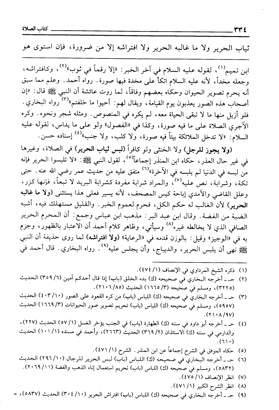 (وَلَا يَجُوزُ لِلرَّجُلِ) وَلَا الْخُنْثَى وَلَوْ كَافِرًا (لُبْسُ ثِيَابِ الْحَرِيرِ) فِي الصَّلَاةِ وَغَيْرِهَا فِي غَيْرِ حَالِ الْعُذْرِ. حَكَاهُ ابْنُ الْمُنْذِرِ إِجْمَاعًا لِقَوْلِ النَّبِيِّ - صَلَّى اللَّهُ عَلَيْهِ وَسَلَّمَ -: «لَا تَلْبِسُوا الْحَرِيرَ، فَإِنَّهُ مَنْ لَبِسَهُ فِي الدُّنْيَا لَمْ يَلْبَسْهُ فِي الْآخِرَةِ» مُتَّفَقٌ عَلَيْهِ مِنْ حَدِيثِ عُمَرَ - رَضِيَ اللَّهُ عَنْهُ - حَتَّى تِكَّةٍ، وَشَرَابَةٍ، نُصَّ عَلَيْهِ، وَالْمُرَادُ شَرَابَةٌ مُفْرَدَةٌ كَشَرَابَةِ الْبَرِيدِ لَا تَبَعًا فَإِنَّهَا كَزِرِّ، وَعَلَّلَ الْقَاضِي وَالْآمِدِيُّ إِبَاحَةَ كِيسِ الْمُصْحَفِ لِأَنَّهُ يَسِيرٌ، فَعَلَى هَذَا يُسْتَثْنَى (وَلَا مَا غَالِبُهُ الْحَرِيرُ) لِأَنَّ الْغَالِبَ لَهُ حُكْمُ الْكُلِّ، فَحُرِّمَ لِعُمُومِ الْخَبَرِ، وَالْقَلِيلُ مُسْتَهْلَكٌ فِيهِ، أَشْبَهَ الضَّبَّةَ مِنَ الْفِضَّةِ، وَقَالَ ابْنُ عَبْدِ الْبَرِّ: مَذْهَبُ ابْنِ عَبَّاسٍ وَجَمْعٍ أَنَّ الْمُحَرَّمَ الْحَرِيرُ الصَّافِي الَّذِي لَا يُخَالِطُهُ غَيْرُهُ، وَسَيَأْتِي، وَظَاهِرُ كَلَامِ أَحْمَدَ أَنَّ الِاعْتِبَارَ بِالظُّهُورِ، وَجَزَمَ بِهِ فِي " الْوَجِيزِ " وَقِيلَ: بِالْوَزْنِ قَدَّمَهُ فِي " الرِّعَايَةِ " (وَلَا افْتِرَاشُهُ) لِمَا رَوَى حُذَيْفَةُ: «أَنَّ النَّبِيَّ - صَلَّى اللَّهُ عَلَيْهِ وَسَلَّمَ - نَهَى أَنْ يُلْبَسَ الْحَرِيرُ وَالدِّيبَاجُ، وَأَنْ يُجْلَسَ عَلَيْهِ» رَوَاهُ الْبُخَارِيُّ. قَالَ أَحْمَدُ فِي