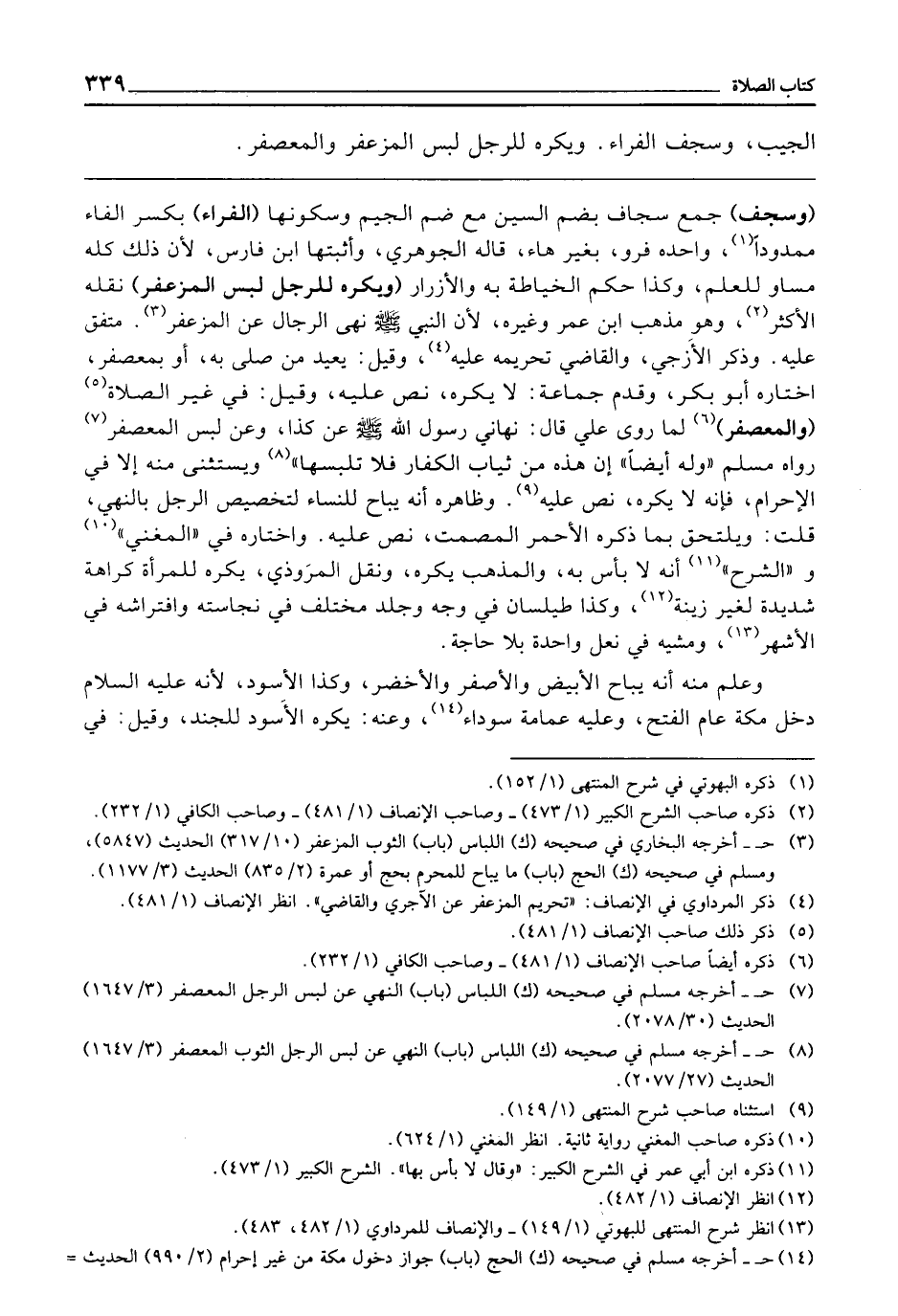 (وَيُكْرَهُ لِلرَّجُلِ لُبْسُ الْمُزَعْفَرِ) نَقَلَهُ الْأَكْثَرُ، وَهُوَ مَذْهَبُ ابْنِ عُمَرَ وَغَيْرِهِ «لِأَنَّ النَّبِيَّ - صَلَّى اللَّهُ عَلَيْهِ وَسَلَّمَ - نَهَى الرِّجَالَ عَنِ الْمُزَعْفَرِ» مُتَّفَقٌ عَلَيْهِ، وَذَكَرَ الْأَزَجِّيُّ، وَالْقَاضِي تَحْرِيمَهُ عَلَيْهِ، وَقِيلَ: يُعِيدُ مَنْ صَلَّى بِهِ أَوْ بِمُعَصْفَرٍ، اخْتَارَهُ أَبُو بَكْرٍ، وَقَدَّمَ جَمَاعَةٌ: لَا يُكْرَهُ، نُصَّ عَلَيْهِ، وَقِيلَ: فِي غَيْرِ الصَّلَاةِ (وَالْمُعَصْفَرُ) لِمَا رَوَى عَلِيٌّ: «قَالَ نَهَانِي رَسُولُ اللَّهِ - صَلَّى اللَّهُ عَلَيْهِ وَسَلَّمَ - عَنْ كَذَا، وَعَنْ لُبْسِ الْمُعَصْفَرِ» رَوَاهُ مُسْلِمٌ، وَلَهُ أَيْضًا: «إِنَّ هَذِهِ مِنْ ثِيَابِ الْكُفَّارِ فَلَا تَلْبَسْهَا» وَيُسْتَثْنَى مِنْهُ إِلَّا فِي الْإِحْرَامِ فَإِنَّهُ لَا يُكْرَهُ، نُصَّ عَلَيْهِ، وَظَاهِرُهُ أَنَّهُ يُبَاحُ لِلنِّسَاءِ لِتَخْصِيصِ الرَّجُلِ بِالنَّهْيِ، قُلْتُ: وَيَلْتَحِقُ بِمَا ذَكَرَهُ الْأَحْمَرُ الْمُصْمَتُ، نُصَّ عَلَيْهِ، وَاخْتَارَه فِي " الْمُغْنِي " و " الشَّرْحِ " أَنَّهُ لَا بَأْسَ بِهِ، وَالْمَذْهَبُ: يُكْرَهُ، وَنَقَلَ الْمَرُّوذِيُّ يُكْرَهُ لِلْمَرْأَةِ كَرَاهَةً شَدِيدَةً لِغَيْرِ زِينَةٍ، وَكَذَا طَيْلَسَانٌ فِي وَجْهٍ، وَجِلْدٌ مُخْتَلَفٌ فِي نَجَاسَتِهِ وَافْتِرَاشِهِ فِي الْأَشْهَرِ، وَمَشْيُهُ فِي نَعْلٍ وَاحِدَةٍ بِلَا حَاجَةٍ.