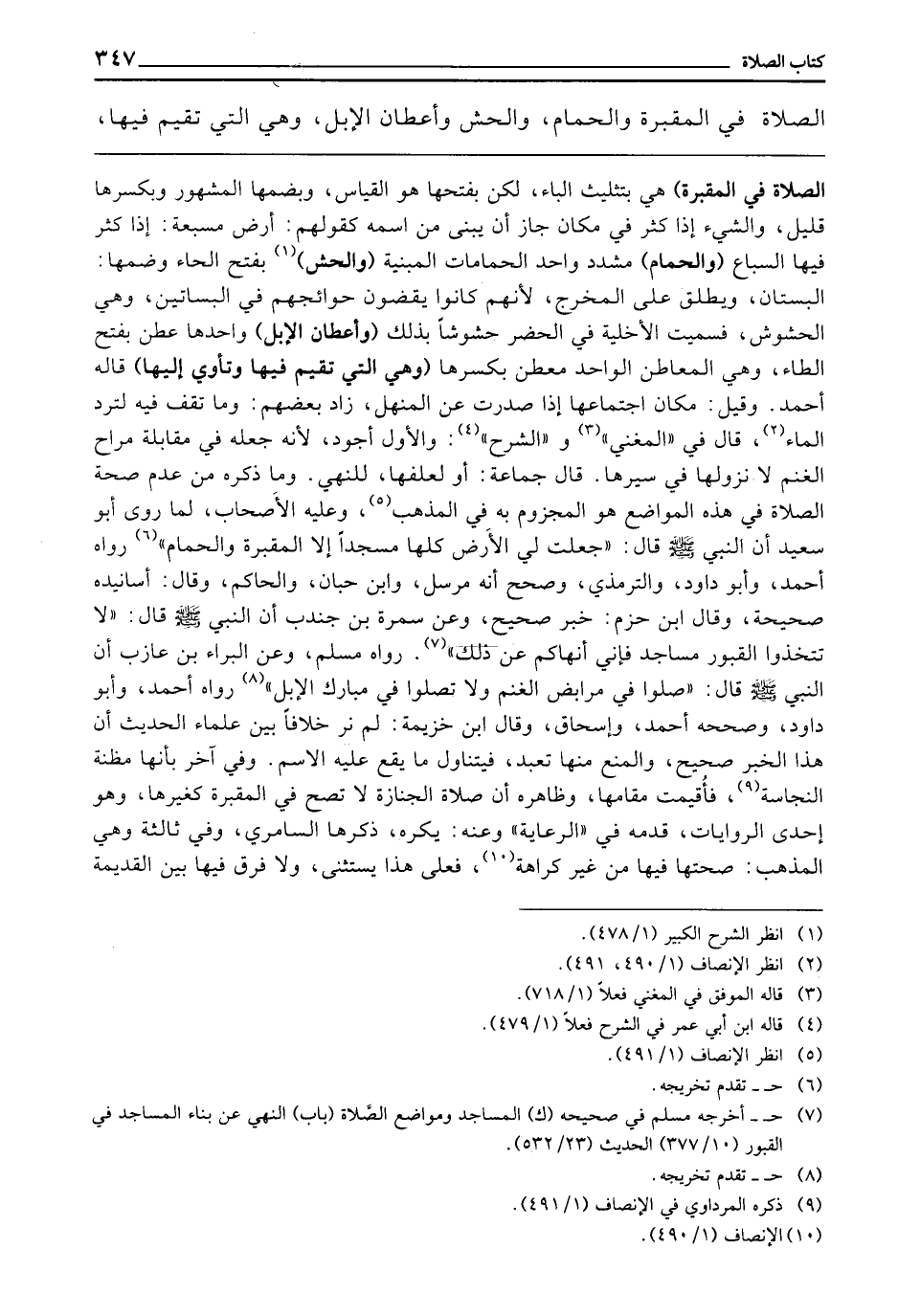ـــــــــــــــــــــــــــــQالصَّلَاةُ فِي الْمَقْبَرَةِ) هِيَ بِتَثْلِيثِ الْبَاءِ، لَكِنْ بِفَتْحِهَا هُوَ الْقِيَاسُ، وَبِضَمِّهَا الْمَشْهُورُ، وَبِكَسْرِهَا قَلِيلٌ، وَالشَّيْءُ إِذَا كَثُرَ فِي مَكَانٍ جَازَ أَنْ يُبْنَى مِنِ اسْمِهِ كَقَوْلِهِمْ: أَرْضٌ مَسْبَعَةٌ إِذَا كَثُرَ فِيهَا السِّبَاعُ (وَالْحَمَّامُ) مُشَدَّدٌ وَاحِدُ الْحَمَّامَاتِ الْمَبْنِيَّةِ (وَالْحَشُّ) بِفَتْحِ الْحَاءِ وَضَمَّهَا الْبُسْتَانُ، وَيُطْلَقُ عَلَى الْمَخْرَجِ، لِأَنَّهُمْ كَانُوا يَقْضُونَ حَوَائِجَهُمْ فِي الْبَسَاتِينِ، وَهِيَ الْحُشُوشُ، فَسُمِّيَتِ الْأَخْلِيَةُ فِي الْحَضَرِ حُشُوشًا بِذَلِكَ (وَأَعْطَانُ الْإِبِلِ) وَاحِدُهَا عَطَنٌ بِفَتْحِ الطَّاءِ، وَهِيَ الْمَعَاطِنُ الْوَاحِدُ مَعْطِنٌ بِكَسْرِهَا (وَهِيَ الَّتِي تُقِيمُ فِيهَا، وَتَأْوِي إِلَيْهَا) قَالَهُ أَحْمَدُ، وَقِيلَ: مَكَانُ اجْتِمَاعِهَا إِذَا صَدَرَتْ عَنِ الْمَنْهَلِ، زَادَ بَعْضُهُمْ: وَمَا تَقِفُ فِيهِ لِتَرِدَ الْمَاءَ، قَالَ فِي " الْمُغْنِي " و " الشَّرْحِ ": وَالْأَوَّلُ أَجْوَدُ، لِأَنَّهُ جَعَلَهُ فِي مُقَابَلَةِ مَرَاحِ الْغَنَمِ لَا نُزُولِهَا فِي سَيْرِهَا. قَالَ جَمَاعَةٌ: أَوْ لِعَلَفِهَا لِلنَّهْيِ، وَمَا ذَكَرَهُ مِنْ عَدَمِ صِحَّةِ الصَّلَاةِ فِي هَذِهِ الْمَوَاضِعِ هُوَ الْمَجْزُومُ بِهِ فِي الْمَذْهَبِ، وَعَلَيْهِ الْأَصْحَابُ، لِمَا رَوَى أَبُو سَعِيدٍ أَنَّ النَّبِيَّ - صَلَّى اللَّهُ عَلَيْهِ وَسَلَّمَ - قَالَ: «جُعِلَتْ لِيَ الْأَرْضُ كُلُّهَا مَسْجِدًا، إِلَّا الْمَقْبَرَةَ وَالْحَمَّامَ» رَوَاهُ أَحْمَدُ، وَأَبُو دَاوُدَ، وَالتِّرْمِذِيُّ وَصَحَّحَ أَنَّهُ مُرْسَلٌ، وَابْنُ حِبَّانَ، وَالْحَاكِمُ، وَقَالَ: أَسَانِيدُهُ صَحِيحَةٌ، وَقَالَ ابْنُ حَزْمٍ: خَبَرٌ صَحِيحٌ، وَعَنْ سَمُرَةَ بْنِ جُنْدُبٍ أَنَّ النَّبِيَّ - صَلَّى اللَّهُ عَلَيْهِ وَسَلَّمَ - قَالَ: «لَا تَتَّخِذُوا الْقُبُورَ مَسَاجِدَ فَإِنِّي أَنْهَاكُمْ عَنْ ذَلِكَ» رَوَاهُ مُسْلِمٌ، وَعَنِ الْبَرَاءِ بْنِ عَازِبٍ أَنَّ النَّبِيَّ - صَلَّى اللَّهُ عَلَيْهِ وَسَلَّمَ - قَالَ: «صَلُّوا فِي مَرَابِضِ الْغَنَمِ، وَلَا تُصَلُّوا فِي مَبَارِكِ الْإِبِلِ» رَوَاهُ أَحْمَدُ، وَأَبُو دَاوُدَ، وَصَحَّحَهُ أَحْمَدُ، وَإِسْحَاقُ، وَقَالَ ابْنُ خُزَيْمَةَ: لَمْ نَرَ خِلَافًا بَيْنَ عُلَمَاءِ الْحَدِيثِ أَنَّ هَذَا الْخَبَرَ صَحِيحٌ، وَالْمَنْعُ مِنْهَا تَعَبُّدٌ، فَيَتَنَاوَلُ مَا يَقَعُ عَلَيْهِ الِاسْمُ، وَفِي آخَرَ بِأَنَّهَا مَظِنَّةُ النَّجَاسَةِ، فَأُقِيمَتْ مَقَامَهَا، وَظَاهِرُهُ أَنَّ صَلَاةَ الْجِنَازَةِ لَا تَصِحُّ فِي الْمَقْبَرَةِ كَغَيْرِهَا، وَهُوَ إِحْدَى الرِّوَايَاتِ، قَدَّمَهُ فِي " الرِّعَايَةِ " وَعَنْهُ: يُكْرَهُ، ذَكَرَهَا السَّامِرِيُّ، وَفِي ثَالِثَةٍ، وَهِيَ الْمَذْهَبُ: صِحَّتُهَا فِيهَا مِنْ غَيْرِ كَرَاهَةٍ، فَعَلَى هَذَا يُسْتَثْنَى، وَلَا فَرْقَ فِيهَا بَيْنَ الْقَدِيمَةِ