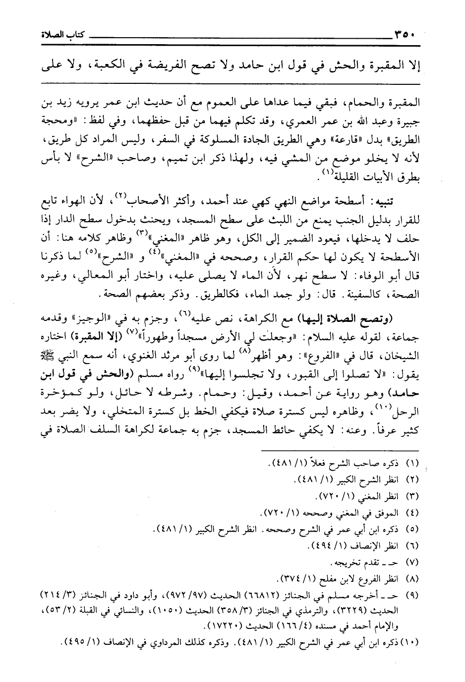 ـــــــــــــــــــــــــــــQالْمَقْبَرَةَ وَالْحَمَّامَ، فَبقي فِيمَا عَدَاهَا عَلَى الْعُمُومِ، مَعَ أَنَّ حَدِيثَ ابْنِ عُمَرَ يَرْوِيهِ زَيْدُ بْنُ جُبَيْرَةَ، وَعَبْدُ اللَّهِ بْنُ عُمَرَ الْعُمَرِيُّ، وَقَدْ تَكَلَّمَ فِيهِمَا مِنْ قِبَلِ حِفْظِهِمَا، وَفِي لَفْظٍ وَمَحَجَّةِ الطَّرِيقِ بَدَلَ قَارِعَةٍ، وَهِيَ الطَّرِيقُ الْجَادَّةُ الْمَسْلُوكَةُ فِي السَّفَرِ، وَلَيْسَ الْمُرَادُ كُلَّ طَرِيقٍ، لِأَنَّهُ لَا يَخْلُو مَوْضِعٌ مِنَ الْمَشْيِ فِيهِ، وَلِهَذَا ذَكَرَ ابْنُ تَمِيمٍ، وَصَاحِبُ " الشَّرْحِ " لَا بَأْسَ بِطُرُقِ الْأَبْيَاتِ الْقَلِيلَةِ.