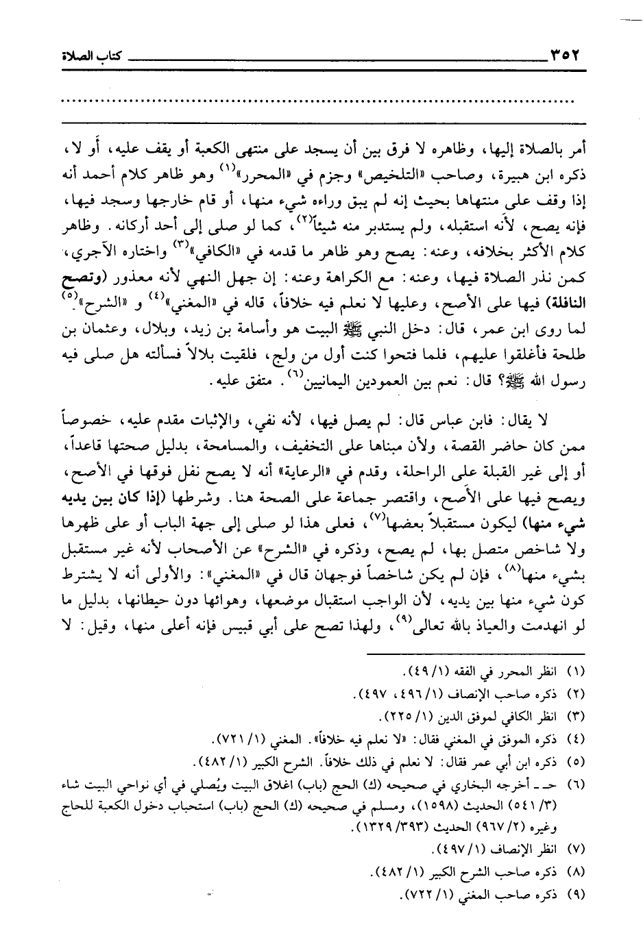 ـــــــــــــــــــــــــــــQأَمَرَ بِالصَّلَاةِ إِلَيْهَا، وَظَاهِرُهُ لَا فَرْقَ بَيْنَ أَنْ يَسْجُدَ عَلَى مُنْتَهَى الْكَعْبَةِ أَوْ يَقِفَ عَلَيْهِ أَوْ لَا، ذَكَرَهُ ابْنُ هُبَيْرَةَ، وَصَاحِبُ " التَّلْخِيصِ " وَجَزَمَ فِي " الْمُحَرَّرِ " وَهُوَ ظَاهِرُ كَلَامِ أَحْمَدَ أَنَّهُ إِذَا وَقَفَ عَلَى مُنْتَهَاهَا، بِحَيْثُ إِنَّهُ لَمْ يَبْقَ وَرَاءَهُ شَيْءٌ مِنْهَا أَوْ قَامَ خَارِجَهَا وَسَجَدَ فِيهَا فَإِنَّهُ يَصِحُّ، لِأَنَّهُ اسْتَقْبَلَهُ، وَلَمْ يَسْتَدْبِرْ مِنْهُ شَيْئًا، كَمَا لَوْ صَلَّى إِلَى أَحَدِ أَرْكَانِهِ، وَظَاهِرُ كَلَامِ الْأَكْثَرِ بِخِلَافِهِ، وَعَنْهُ: يَصِحُّ، وَهُوَ ظَاهِرُ مَا قَدَّمَهُ فِي " الْكَافِي " وَاخْتَارَهُ الْآجُرِّيُّ كَمَنْ نَذَرَ الصَّلَاةَ فِيهَا، وَعَنْهُ: مَعَ الْكَرَاهَةِ، وَعَنْهُ: إِنْ جَهَلَ النَّهْيَ لِأَنَّهُ مَعْذُورٌ (وَتَصِحُّ النَّافِلَةُ) فِيهَا عَلَى الْأَصَحِّ، وَعَلَيْهَا لَا نَعْلَمُ فِيهِ خِلَافًا قَالَهُ فِي " الْمُغْنِي " و " الشَّرْحِ " لِمَا رَوَى ابْنُ عُمَرَ قَالَ: «دَخَلَ النَّبِيُّ - صَلَّى اللَّهُ عَلَيْهِ وَسَلَّمَ - الْبَيْتَ هُوَ، وَأُسَامَةُ بْنُ زَيْدٍ، وَبِلَالٌ، وَعُثْمَانُ بْنُ طَلْحَةَ فَأَغْلَقُوا عَلَيْهِمْ، فَلَمَّا فَتَحُوا كُنْتُ أَوَّلَ مَنْ وَلَجَ، فَلَقِيتُ بِلَالًا فَسَأَلْتُهُ: هَلْ صَلَّى فِيهِ رَسُولُ اللَّهِ - صَلَّى اللَّهُ عَلَيْهِ وَسَلَّمَ -؛ قَالَ: نَعَمْ، بَيْنَ الْعَمُودَيْنِ الْيَمَانِيَّيْنِ» مُتَّفَقٌ عَلَيْهِ.