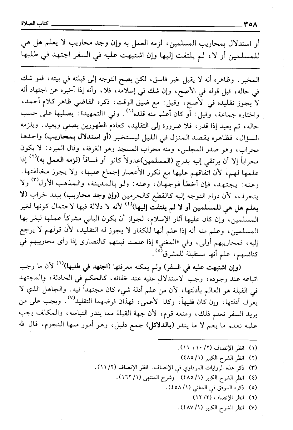 (وَإِنِ اشْتَبَهَتْ عَلَيْهِ فِي السَّفَرِ) وَلَمْ يُمْكِنْهُ مَعْرِفَتُهَا (اجْتَهَدَ فِي طَلَبِهَا) لِأَنَّ مَا وَجَبَ اتِّبَاعُهُ عِنْدَ وُجُودِهِ وَجَبَ الِاسْتِدْلَالُ عَلَيْهِ عِنْدَ خَفَائِهِ كَالْحُكْمِ فِي الْحَادِثَةِ، وَالْمُجْتَهِدُ فِي الْقِبْلَةِ هُوَ الْعَالِمُ بِأَدِلَّتِهَا، لِأَنَّ مَنْ عَلِمَ أَدِلَّةَ شَيْءٍ كَانَ مُجْتَهِدًا فِيهِ، وَالْجَاهِلُ الَّذِي لَا يَعْرِفُ أَدِلَّتَهَا وَإِنْ كَانَ فَقِيهًا، وَكَذَا الْأَعْمَى فَهَذَانِ فَرَضَهُمَا التَّقْلِيدُ، وَيَجِبُ عَلَى مَنْ يُرِيدُ السَّفَرَ تَعَلُّمُ ذَلِكَ، وَمَنَعَهُ قَوْمٌ، لِأَنَّ جِهَةَ الْقِبْلَةِ مِمَّا يَنْدُرُ الْتِبَاسُهُ، وَالْمُكَلَّفُ يَجِبُ عَلَيْهِ تَعَلُّمُ مَا يَعُمُّ لَا مَا يَنْدُرُ (بِالدَّلَائِلِ) جَمْعُ دَلِيلٍ، وَهُوَ أُمُورٌ مِنْهَا: النُّجُومُ قَالَ اللَّهُ