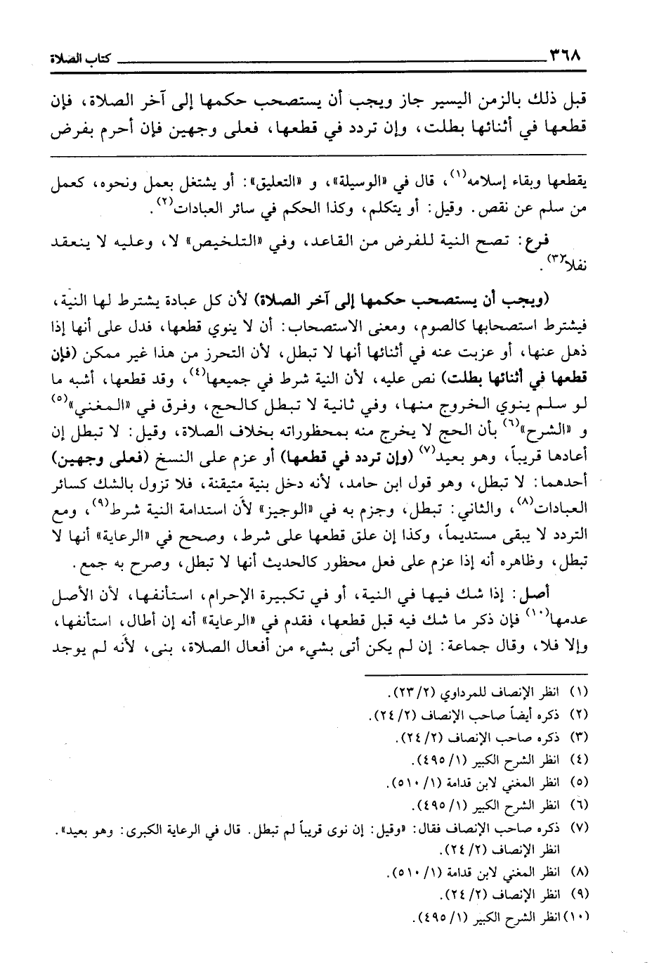 (وَيَجِبُ أَنْ يَسْتَصْحِبَ حُكْمَهَا إِلَى آخِرِ الصَّلَاةِ) لِأَنَّ كُلَّ عِبَادَةٍ يُشْتَرَطُ لَهَا النِّيَّةُ، فَيُشْتَرَطُ اسْتِصْحَابُهَا كَالصَّوْمِ، وَمَعْنَى الِاسْتِصْحَابِ: أَنْ لَا يَنْوِيَ قَطْعَهَا، فَدَلَّ عَلَى أَنَّهَا إِذَا ذَهَلَ عَنْهَا أَوْ عَزُبَتْ عَنْهُ فِي أَثْنَائِهَا أَنَّهَا لَا تَبْطُلُ، لِأَنَّ التَّحَرُّزَ مِنْ هَذَا غَيْرُ مُمْكِنٍ (فَإِنْ قَطَعَهَا فِي أَثْنَائِهَا بَطَلَتْ) نُصَّ عَلَيْهِ، لِأَنَّ النِّيَّةَ شَرْطٌ في جميعها، وَقَدْ قَطَعَهَا، أَشْبَهَ مَا لَوْ سَلَّمَ يَنْوِي الْخُرُوجَ مِنْهَا، وَفِي ثَانِيَةٍ: لَا تَبْطُلُ كَالْحَجِّ، وَفَرَّقَ فِي " الْمُغْنِي " و" الشَّرْحِ " بِأَنَّ الْحَجَّ لَا يُخْرَجُ مِنْهُ بِمَحْظُورَاتِهِ بِخِلَافِ الصَّلَاةِ، وَقِيلَ: لَا تَبْطُلُ إِنْ أَعَادَهَا قَرِيبًا، وَهُوَ بِعِيدٌ (وَإِنْ تَرَدَّدَ فِي قَطْعِهَا) أَوْ عَزَمَ عَلَى النَّسْخِ (فَعَلَى وَجْهَيْنِ) أَحَدُهُمَا: لَا تَبْطُلُ، وَهُوَ قَوْلُ ابْنِ حَامِدٍ، لِأَنَّهُ دَخَلَ بِنِيَّةٍ مُتَيَقِّنَةٍ، فَلَا تَزُولُ بِالشَّكِّ كَسَائِرِ الْعِبَادَاتِ، وَالثَّانِي: تَبْطُلُ، وَجَزَمَ بِهِ فِي " الْوَجِيزِ " لِأَنَّ اسْتِدَامَةَ النِّيَّةِ شَرْطٌ، وَمَعَ التَّرَدُّدِ لَا يَبْقَى مُسْتَدِيمًا، وَكَذَا إِنْ عَلَّقَ قَطْعَهَا عَلَى شَرْطٍ، وَصَحَّحَ فِي " الرِّعَايَةِ " أَنَّهَا لَا تَبْطُلُ، وَظَاهِرُهُ أَنَّهُ إِذَا عَزَمَ عَلَى فِعْلِ مَحْظُورٍ كَالْحَدِيثِ أَنَّهَا لَا تَبْطُلُ، وَصَرَّحَ بِهِ جَمْعٌ.
