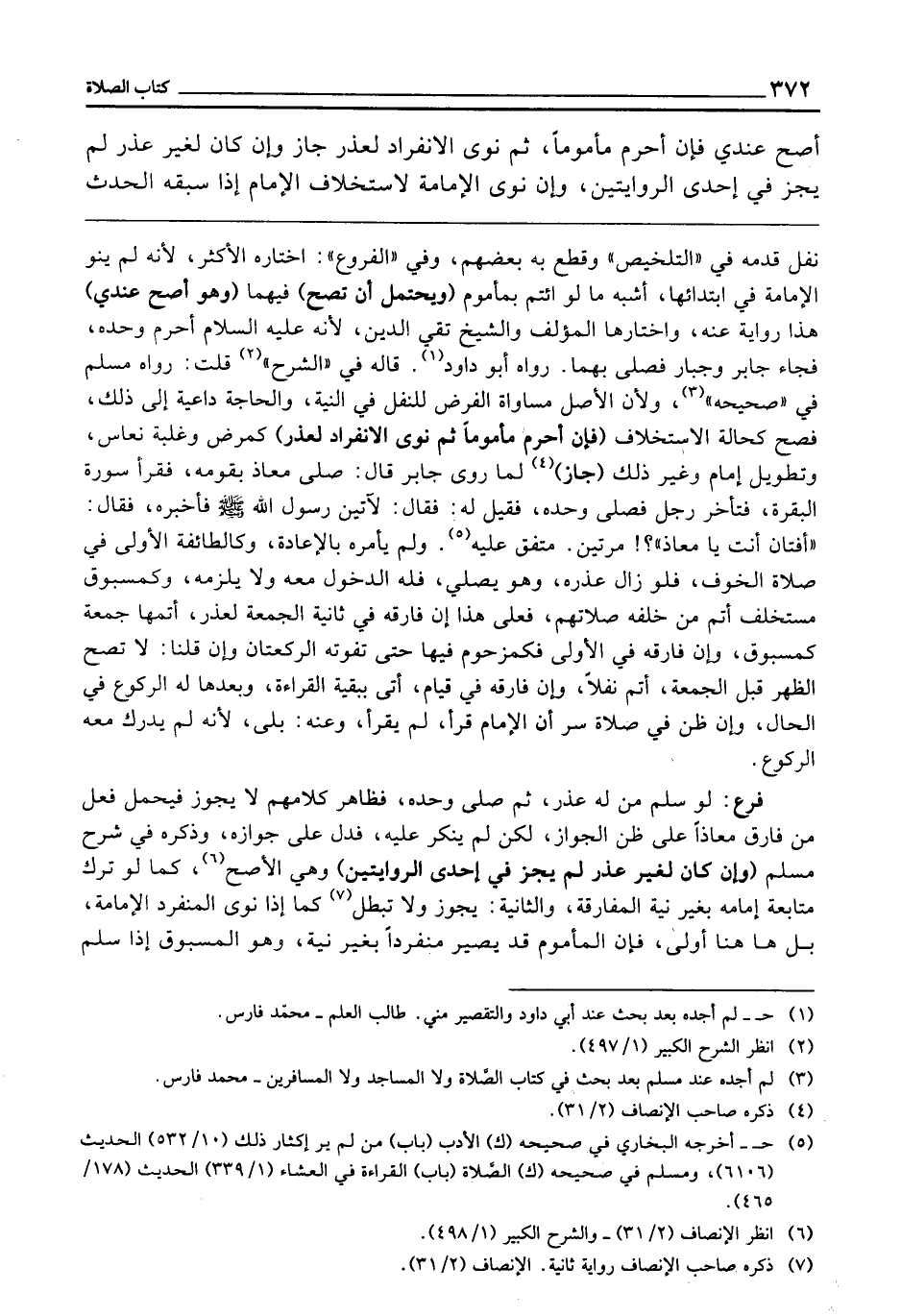 أَصَحُّ عِنْدِي. فَإِنْ أَحْرَمَ مَأْمُومًا، ثُمَّ نَوَى الِانْفِرَادَ لِعُذْرٍ جَازَ، وَإِنْ كَانَ لِغَيْرِ عُذْرٍ لَمْ يَجُزْ فِي إِحْدَى الرِّوَايَتَيْنِ، وَإِنْ نَوَى الْإِمَامَةَ لِاسْتِخْلَافِ الْإِمَامِ إِذَا سَبَقَهُ الْحَدَثُ