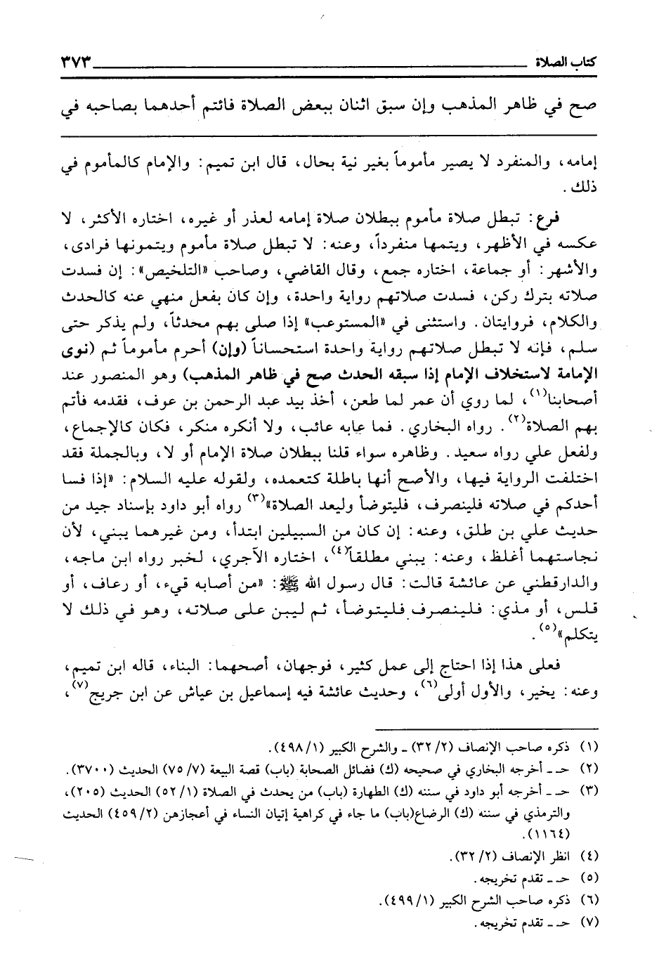 فَرْعٌ: تَبْطُلُ صَلَاةُ مَأْمُومٍ بِبُطْلَانِ صَلَاةِ إِمَامِهِ لِعُذْرٍ أَوْ غَيْرِهِ، اخْتَارَهُ الْأَكْثَرُ لَا عَكْسَهُ فِي الْأَظْهَرِ، وَيُتِمُّهَا مُنْفَرِدًا، وَعَنْهُ: لَا تَبْطُلُ صَلَاةُ مَأْمُومٍ، وَيُتِمُّونَهَا فُرَادَى، وَالْأَشْهَرُ: أَوْ جَمَاعَةً، اخْتَارَهُ جَمْعٌ، وَقَالَ الْقَاضِي، وَصَاحِبُ " التَّلْخِيصِ ": إِنْ فَسَدَتْ صَلَاتُهُ بِتَرْكِ رُكْنٍ فَسَدَتْ صَلَاتُهُمْ رِوَايَةً وَاحِدَةً، وَإِنْ كَانَ بِفِعْلٍ مَنْهِيٍّ عَنْهُ كَالْحَدَثِ والكلام، فَرِوَايَتَانِ، وَاسْتَثْنَى فِي " الْمُسْتَوْعِبِ " إِذَا صَلَّى بِهِمْ مُحْدِثًا، وَلَمْ يَذْكُرْ حَتَّى سَلَّمَ، فَإِنَّهُ لَا تَبْطُلُ صَلَاتُهُمْ، رِوَايَةً وَاحِدَةً، اسْتِحْسَانًا (وَإِنْ) أَحْرَمَ مَأْمُومًا، ثُمَّ (نَوَى الْإِمَامَةَ لِاسْتِخْلَافِ الْإِمَامِ إِذَا سَبَقَهُ الْحَدَثُ صَحَّ فِي ظَاهِرِ الْمَذْهَبِ) وَهُوَ الْمَنْصُورُ عِنْدَ أَصْحَابِنَا، لِمَا رُوِيَ أَنَّ عُمَرَ لِمَّا طُعِنَ، أَخَذَ بِيَدِ عَبْدِ الرَّحْمَنِ بْنِ عَوْفٍ فَقَدَّمَهُ، فَأَتَمَّ بِهِمُ الصَّلَاةَ. رَوَاهُ الْبُخَارِيُّ. فَمَا عَابَهُ عَائِبٌ، وَلَا أَنْكَرَهُ مُنْكِرٌ، فَكَانَ كَالْإِجْمَاعِ، وَلِفِعْلِ عَلِيٍّ رَوَاهُ سَعِيدٌ. وَظَاهِرُهُ سَوَاءٌ قُلْنَا بِبُطْلَانِ صَلَاةِ الْإِمَامِ أَو لَا، وَبِالْجُمْلَةِ فَقَدِ اخْتَلَفَتِ الرِّوَايَةُ فِيهَا، وَالْأَصَحُّ أَنَّهَا بَاطِلَةٌ كَتَعَمُّدِهِ، وَلِقَوْلِهِ - عَلَيْهِ السَّلَامُ -: «إِذَا فَسَا أَحَدُكُمْ فِي صَلَاتِهِ فَلْيَنْصَرِفْ، فَلْيَتَوَضَّأْ، وَلِيُعِدِ الصَّلَاةَ» رَوَاهُ أَبُو دَاوُدَ بِإِسْنَادٍ جَيِّدٍ مِنْ حَدِيثِ عَلِيِّ بْنِ طَلْقٍ، وَعَنْهُ: إِنْ كَانَ مِنَ السَّبِيلَيْنِ ابْتَدَأَ، وَمِنْ غَيْرِهِمَا يَبْنِي، لِأَنَّ نَجَاسَتَهُمَا أَغْلَظُ، وَعَنْهُ: يَبْنِي مُطْلَقًا اخْتَارَهُ الْآجُرِّيُّ لِخَبَرٍ رَوَاهُ ابْنُ مَاجَهْ، وَالدَّارَقُطْنِيُّ عَنْ عَائِشَةَ قَالَتْ: قَالَ رَسُولُ اللَّهِ - صَلَّى اللَّهُ عَلَيْهِ وَسَلَّمَ -: «مَنْ أَصَابَهُ قَيْءٌ أَوْ رُعَافٌ أَوْ قَلَسٌ أَوْ مَذْيٌ فَلْيَنْصَرِفْ فَلْيَتَوَضَّأْ، ثُمَّ لْيَبْنِ عَلَى صَلَاتِهِ، وَهُوَ فِي ذَلِكَ لَا يَتَكَلَّمُ» .