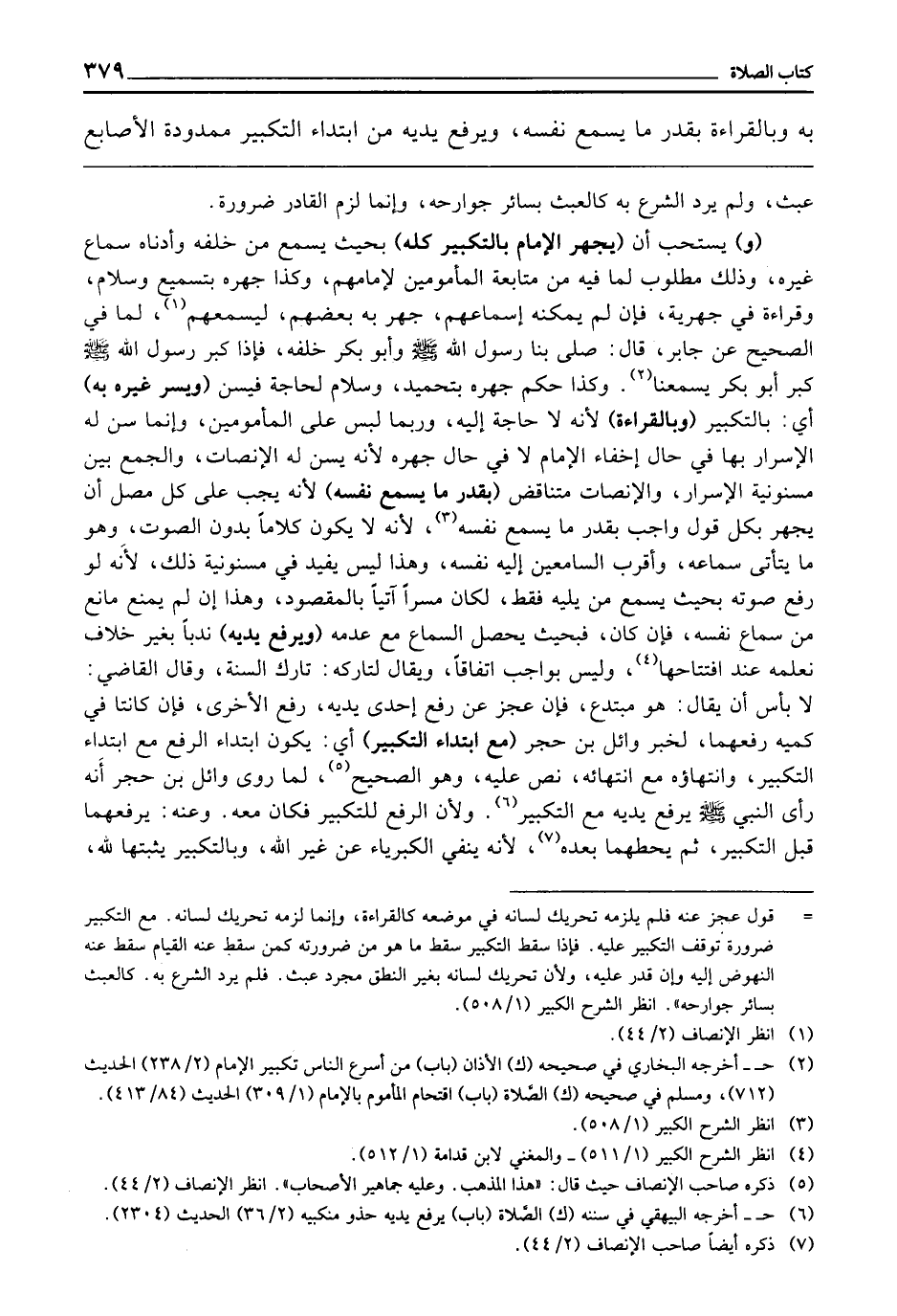 (و) يُسْتَحَبُّ أَنْ (يَجْهَرَ الْإِمَامُ بِالتَّكْبِيرِ كُلِّهِ) بِحَيْثُ يُسْمِعُ مَنْ خَلْفَهُ، وَأَدْنَاهُ سَمَاعُ غَيْرِهِ، وَذَلِكَ مَطْلُوبٌ لِمَا فِيهِ مِنْ مُتَابَعَةِ الْمَأْمُومِينَ لِإِمَامِهِمْ، وَكَذَا جَهْرُهُ بِتَسْمِيعٍ وَسَلَامٍ، وَقِرَاءَةٍ فِي جَهْرِيَّةٍ، فَإِنْ لَمْ يُمْكِنْهُ إِسْمَاعُهُمْ، جَهَرَ بِهِ بَعْضُهُمْ لِيُسْمِعَهُمْ، لِمَا فِي الصَّحِيحِ عَنْ جَابِرٍ قَالَ: «صَلَّى بِنَا رَسُولُ اللَّهِ - صَلَّى اللَّهُ عَلَيْهِ وَسَلَّمَ - وَأَبُو بَكْرٍ خَلْفَهُ، فَإِذَا كَبَّرَ رَسُولُ اللَّهِ - صَلَّى اللَّهُ عَلَيْهِ وَسَلَّمَ - كَبَّرَ أَبُو بَكْرٍ يُسْمِعُنَا» وَكَذَا حُكْمُ جَهْرِهِ بِتَحْمِيدٍ، وَسَلَامٍ لِحَاجَةٍ فَيُسَنُّ (وَيُسَرُّ غَيْرُهُ بِهِ) أَيْ: بِالتَّكْبِيرِ (وَبِالْقِرَاءَةِ) لِأَنَّهُ لَا حَاجَةَ إِلَيْهِ، وَرُبَّمَا لُبِسَ عَلَى الْمَأْمُومِينَ، وَإِنَّمَا سُنَّ لَهُ الْإِسْرَارُ بِهَا فِي حَالِ إِخْفَاءِ الْإِمَامِ لَا فِي حَالِ جَهْرِهِ، لِأَنَّهُ يُسَنُّ لَهُ الْإِنْصَاتُ، وَالْجَمْعُ بَيْنَ مَسْنُونَيَّةِ الْإِسْرَارِ وَالْإِنْصَاتِ مُتَنَاقِضٌ (بِقَدْرِ مَا يُسْمِعُ نَفْسَهُ) لِأَنَّهُ يَجِبُ عَلَى كُلِّ مُصَلٍّ أَنْ يَجْهَرَ بِكُلِّ قَوْلٍ وَاجِبٍ بِقَدْرِ مَا يُسْمِعُ نَفْسَهُ، لِأَنَّهُ لَا يَكُونُ كَلَامًا بِدُونِ الصَّوْتِ، وَهُوَ مَا يَتَأَتَّى سَمَاعُهُ، وَأَقْرَبُ السَّامِعِينَ إِلَيْهِ نَفْسُهُ، وَهَذَا لَيْسَ يُفِيدُ فِي مَسْنُونِيَّةِ ذَلِكَ، لِأَنَّهُ لَوْ رَفَعَ صَوْتَهُ بِحَيْثُ يَسْمَعُ مَنْ يَلِيهِ فَقَطْ لَكَانَ مُسِرًّا آتِيًا بِالْمَقْصُودِ، وَهَذَا إِنْ لَمْ يَمْنَعْ مَانِعٌ مِنْ سَمَاعِ نَفْسِهِ، فَإِنْ كَانَ، فَبِحَيْثُ يَحْصُلُ السَّمَاعُ مَعَ عَدَمِهِ (وَيَرْفَعُ يَدَيْهِ) نُدِبَا بِغَيْرِ خِلَافٍ نَعْلَمُهُ عِنْدَ افْتِتَاحِهَا، وَلَيْسَ بِوَاجِبٍ اتِّفَاقًا، وَيُقَالُ لِتَارِكِهِ: تَارِكُ السُّنَّةِ، وَقَالَ الْقَاضِي: لَا بَأْسَ أَنْ يُقَالَ: هُوَ مُبْتَدِعٌ; فَإِنْ عَجَزَ عَنْ رَفْعِ إِحْدَى يَدَيْهِ رَفَعَ الْأُخْرَى; فَإِنْ كَانَتَا فِي كُمَّيْهِ رَفْعَهُمَا لِخَبَرِ وَائِلِ بْنِ حَجَرٍ (مَعَ ابْتِدَاءِ التَّكْبِيرِ) أَيْ: يَكُونُ ابْتِدَاءُ الرَّفْعِ مَعَ ابْتِدَاءِ التَّكْبِيرِ، وَانْتِهَاؤُهُ مَعَ انْتِهَائِهِ، نُصَّ عَلَيْهِ، وَهُوَ الصَّحِيحُ لِمَا رَوَى وَائِلُ بْنُ حَجَرٍ: «أَنَّهُ رَأَى النَّبِيَّ - صَلَّى اللَّهُ عَلَيْهِ وَسَلَّمَ - يَرْفَعُ يَدَيْهِ مَعَ التَّكْبِيرِ» وَلِأَنَّ الرَّفْعَ لِلتَّكْبِيرِ فَكَانَ مَعَهُ، وَعَنْهُ: يَرْفَعُهُمَا قَبْلَ التَّكْبِيرِ، ثُمَّ يَحُطُّهُمَا بَعْدَهُ، لِأَنَّهُ يَنْفِي الْكِبْرِيَاءَ عَنْ غَيْرِ اللَّهِ، وَبِالتَّكْبِيرِ يُثْبِتُهَا لِلَّهِ،