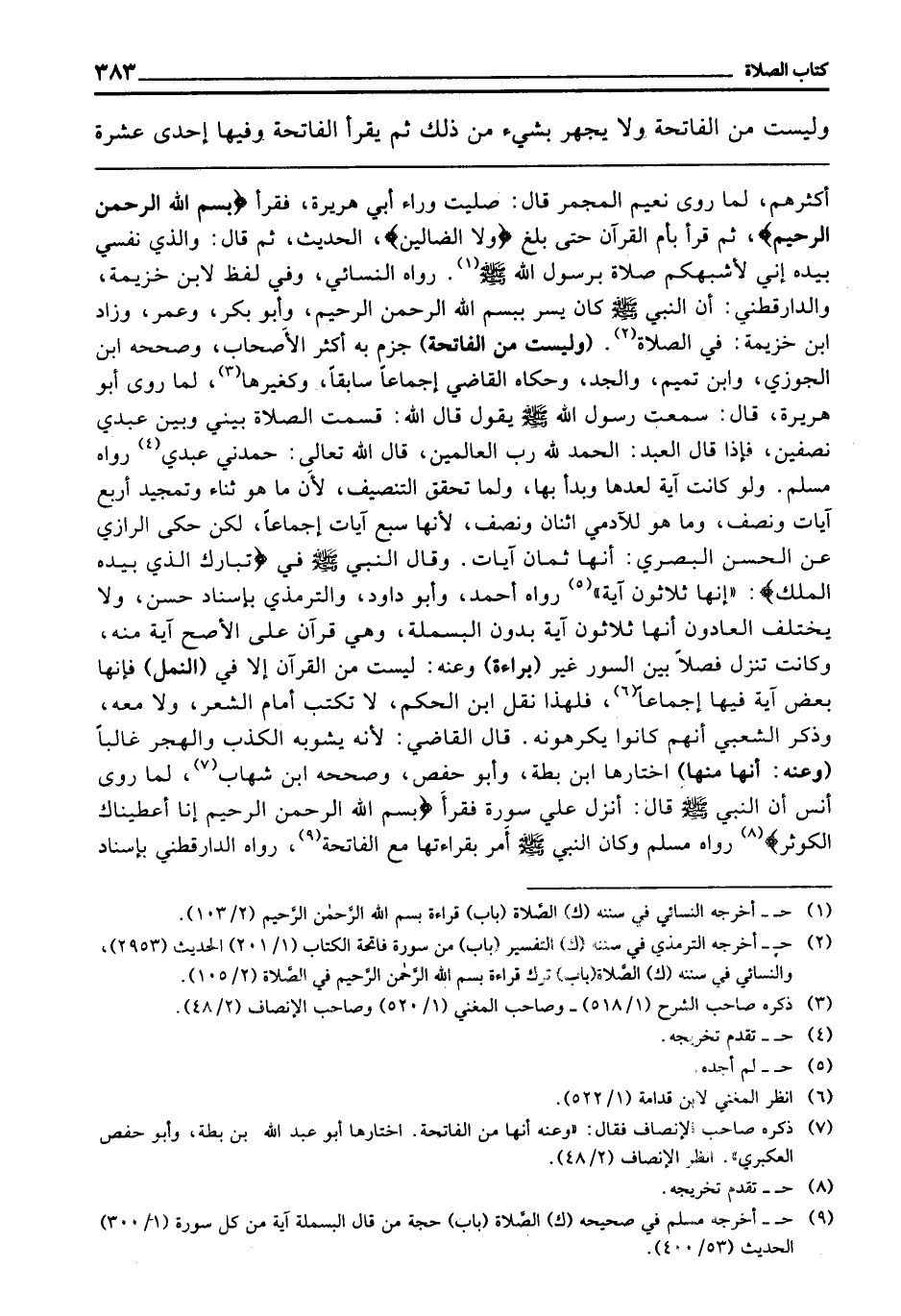 ـــــــــــــــــــــــــــــQأَكْثَرِهِمْ، لِمَا رَوَى نُعَيْمٌ الْمُجْمِرُ قَالَ: «صَلَّيْتُ وَرَاءَ أَبِي هُرَيْرَةَ فَقَرَأَ بِسْمِ اللَّهِ الرَّحْمَنِ الرَّحِيمِ، ثُمَّ قَرَأَ بِأُمِّ الْقُرْآنِ حَتَّى بَلَغَ {وَلا الضَّالِّينَ} [الفاتحة: 7] الْحَدِيثَ، ثُمَّ قَالَ: وَالَّذِي نَفْسِي بِيَدِهِ إِنِّي لَأَشْبَهُكُمْ صَلَاةً بِرَسُولِ اللَّهِ - صَلَّى اللَّهُ عَلَيْهِ وَسَلَّمَ -» رَوَاهُ النَّسَائِيُّ، وَفِي لَفْظٍ لِابْنِ خُزَيْمَةَ، وَالدَّارَقُطْنِيِّ: «أَنَّ النَّبِيَّ - صَلَّى اللَّهُ عَلَيْهِ وَسَلَّمَ - كَانَ يُسِرُّ بِبِسْمِ اللَّهِ الرَّحْمَنِ الرَّحِيمِ، وَأَبُو بَكْرٍ، وَعُمَرُ» وَزَادَ ابْنُ خُزَيْمَةَ: فِي الصَّلَاةِ (وَلَيْسَتْ مِنَ الْفَاتِحَةِ) جَزَمَ بِهِ أَكْثَرُ الْأَصْحَابِ، وَصَحَّحَهُ ابْنُ الْجَوْزِيِّ،، وَابْنُ تَمِيمٍ وَالْجَدُّ، وَحَكَاهُ الْقَاضِي إِجْمَاعًا سَابِقًا، وَكَغَيْرِهَا؛ لِمَا رَوَى أَبُو هُرَيْرَةَ قَالَ: سَمِعْتُ رَسُولَ اللَّهِ - صَلَّى اللَّهُ عَلَيْهِ وَسَلَّمَ - يَقُولُ: «قَالَ اللَّهُ: قَسَمْتُ الصَّلَاةَ بَيْنِي وَبَيْنَ عَبْدِي نِصْفَيْنِ، فَإِذَا قَالَ الْعَبْدُ: الْحَمْدُ لِلَّهِ رَبِّ الْعَالَمِينَ قَالَ اللَّهُ تَعَالَى: حَمِدَنِي عَبْدِي» رَوَاهُ مُسْلِمٌ، وَلَوْ كَانَتْ آيَةً لَعَدَّهَا، وَبَدَأَ بِهَا، وَلَمَا تَحَقَّقَ التَّنْصِيفُ؛ لِأَنَّ مَا هُوَ ثَنَاءٌ وَتَمْجِيدٌ أَرْبَعُ آيَاتٍ وَنِصْفٌ، وَمَا هُوَ لِلْآدَمِيِّ اثْنَانِ وَنِصْفٌ، لِأَنَّهَا سَبْعُ آيَاتٍ إِجْمَاعًا، لَكِنْ حَكَى الرَّازِيُّ عَنِ الْحَسَنِ الْبَصْرِيِّ أَنَّهَا ثَمَانِ آيَاتٍ، «وَقَالَ النَّبِيُّ - صَلَّى اللَّهُ عَلَيْهِ وَسَلَّمَ - فِي {تَبَارَكَ الَّذِي بِيَدِهِ الْمُلْكُ} [الملك: 1] إِنَّهَا ثَلَاثُونَ آيَةً» رَوَاهُ أَحْمَدُ، وَأَبُو دَاوُدَ، وَالتِّرْمِذِيُّ بِإِسْنَادٍ حَسَنٍ، وَلَا يَخْتَلِفُ الْعَادُّونَ أَنَّهَا ثَلَاثُونَ آيَةً بِدُونِ الْبَسْمَلَةِ، وَهِيَ قُرْآنٌ عَلَى الْأَصَحِّ آيَةٌ مِنْهُ، وَكَانَتْ تَنْزِلُ فَصْلًا بَيْنَ السُّورِ غَيْرَ (بَرَاءَةَ) وَعَنْهُ: لَيْسَتْ مِنَ الْقُرْآنِ إِلَّا فِي (النَّمْلِ) فَإِنَّهَا بَعْضُ آيَةٍ فِيهَا إِجْمَاعًا، فَلِهَذَا نَقَلَ ابْنُ الْحَكَمِ: لَا تُكْتَبُ أَمَامَ الشِّعْرِ، وَلَا مَعَهُ، وَذَكَرَ الشَّعْبِيُّ أَنَّهُمْ كَانُوا يَكْرَهُونَهُ، قَالَ الْقَاضِي: لِأَنَّهُ يَشُوبُهُ الْكَذِبُ وَالْهُجْرُ غَالِبًا (وَعَنْهُ: أَنَّهَا مِنْهَا) اخْتَارَهَا ابْنُ بَطَّةَ، وَأَبُو حَفْصٍ، وَصَحَّحَهُ ابْنُ شِهَابٍ لِمَا رَوَى أَنَسٌ أَنَّ النَّبِيَّ - صَلَّى اللَّهُ عَلَيْهِ وَسَلَّمَ - قَالَ: «أُنْزِلَ عَلَيَّ سُورَةٌ فَقَرَأَ بِسْمِ اللَّهِ الرَّحْمَنِ الرَّحِيمِ {إِنَّا أَعْطَيْنَاكَ الْكَوْثَرَ} [الكوثر: 1] رَوَاهُ مُسْلِمٌ، وَكَانَ النَّبِيُّ - صَلَّى اللَّهُ عَلَيْهِ وَسَلَّمَ - أَمَرَ بِقِرَاءَتِهَا مَعَ الْفَاتِحَةِ» رَوَاهُ الدَّارَقُطْنِيُّ بِإِسْنَادٍ