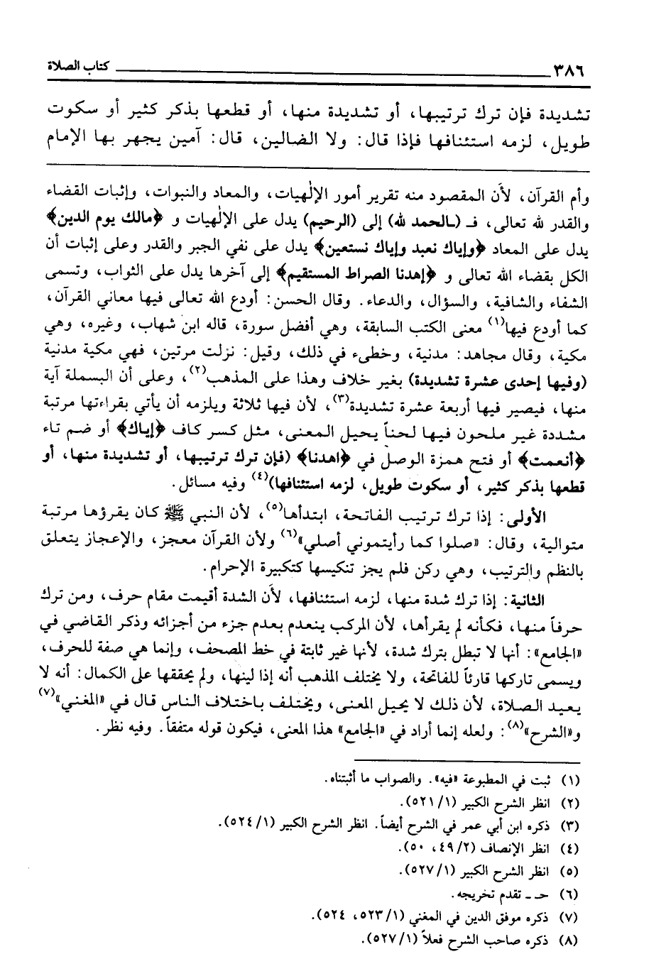 تَشْدِيدَةً، فَإِنْ تَرَكَ تَرْتِيبَهَا، أَوْ تَشْدِيدَةً مِنْهَا، أَوْ قَطَعَهَا بِذِكْرٍ كَثِيرٍ، أَوْ سُكُوتٍ طَوِيلٍ، لَزِمَهُ اسْتِئْنَافُهَا، فَإِذَا قَالَ: {وَلا الضَّالِّينَ} [الفاتحة: 7] قَالَ: آمِينَ يَجْهَرُ بِهَا الْإِمَامُ