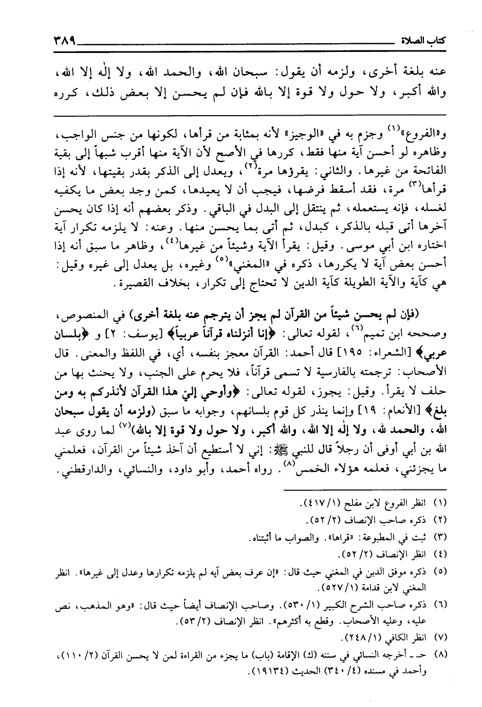 (فَإِنْ لَمْ يُحْسِنْ شَيْئًا مِنَ الْقُرْآنِ لَمْ يَجُزْ أَنْ يُتَرْجَمَ عَنْهُ بِلُغَةٍ أُخْرَى) فِي الْمَنْصُوصِ، وَصَحَّحَهُ ابْنُ تَمِيمٍ لِقَوْلِهِ تَعَالَى {إِنَّا أَنْزَلْنَاهُ قُرْآنًا عَرَبِيًّا} [يوسف: 2] وَ {بِلِسَانٍ عَرَبِيٍّ} [الشعراء: 195] قَالَ أَحْمَدُ: الْقُرْآنُ مُعْجِزٌ بِنَفْسِهِ أَيْ: فِي اللَّفْظِ وَالْمَعْنَى، قَالَ الْأَصْحَابُ: تَرْجَمَتُهُ بِالْفَارِسِيَّةِ لَا تُسَمَّى قُرْآنًا، فَلَا يَحْرُمُ عَلَى الْجُنُبِ، وَلَا يَحْنَثُ بِهَا مَنْ حَلَفَ لَا يَقْرَأُ، وَقِيلَ: يَجُوزُ لِقَوْلِهِ تَعَالَى {وَأُوحِيَ إِلَيَّ هَذَا الْقُرْآنُ لأُنْذِرَكُمْ بِهِ وَمَنْ بَلَغَ} [الأنعام: 19] وَإِنَّمَا يُنْذَرُ كُلُّ قَوْمٍ بِلِسَانِهِمْ، وَجَوَابُهُ مَا سَبَقَ (وَلَزِمَهُ أَنْ يَقُولَ: سُبْحَانَ اللَّهِ، وَالْحَمْدُ لِلَّهِ، وَلَا إِلَهَ إِلَّا اللَّهِ، وَاللَّهُ أَكْبَرُ، وَلَا حَوْلَ وَلَا قُوَّةَ إِلَّا بِاللَّهِ) لِمَا رَوَى عَبْدُ اللَّهِ بْنُ أَبِي أَوْفَى «أَنَّ رَجُلًا قَالَ لِلنَّبِيِّ - صَلَّى اللَّهُ عَلَيْهِ وَسَلَّمَ - إِنِّي لَا أَسْتَطِيعُ أَنْ آخُذَ شَيْئًا مِنَ الْقُرْآنِ، فَعَلِّمْنِي مَا يُجْزِئُنِي، فَعَلَّمَهُ هَؤُلَاءِ الْخَمْسَ» رَوَاهُ أَحْمَدُ، وَأَبُو دَاوُدَ، وَالنَّسَائِيُّ، وَالدَّارَقُطْنِيُّ،