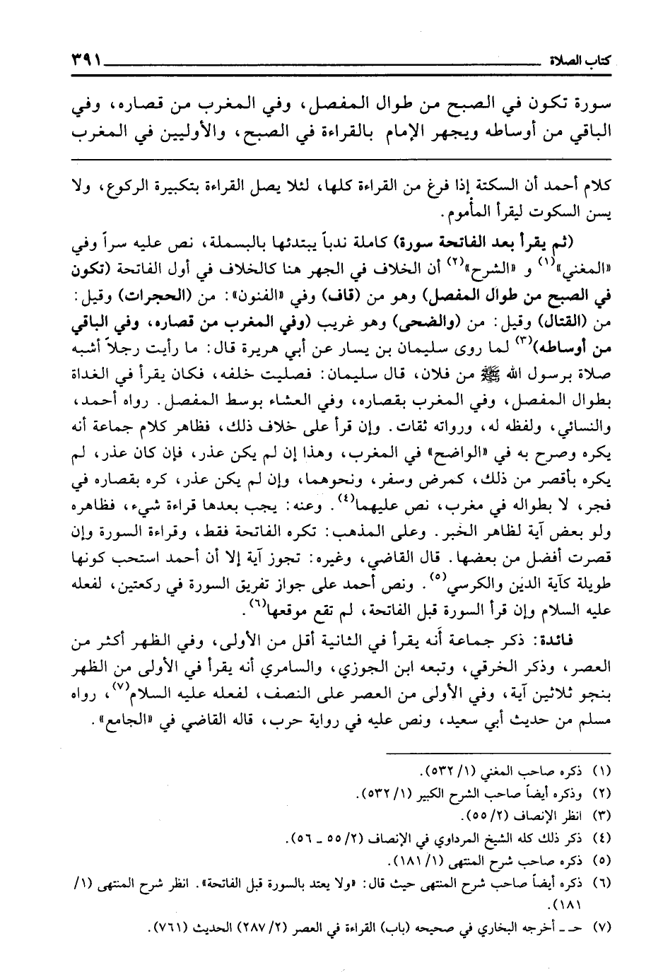 (ثُمَّ يَقْرَأُ بَعْدَ الْفَاتِحَةِ سُورَةً) كَامِلَةً نَدْبًا يَبْتَدِئُهَا بِالْبَسْمَلَةِ، نُصَّ عَلَيْهِ سِرًّا، وَفِي " الْمُغْنِي " و" الشَّرْحِ " أَنَّ الْخِلَافَ فِي الْجَهْرِ هُنَا كَالْخِلَافِ فِي أَوَّلِ الْفَاتِحَةِ (تَكُونُ فِي الصُّبْحِ مِنْ طُوَالِ الْمُفَصَّلِ) وَهُوَ مِنْ (قَافٍ) وَفِي الْفُنُونِ مِنْ (الْحُجُرَاتِ) وَقِيلَ: مِنَ (الْقِتَالِ) وَقِيلَ: مِنَ (وَالضُّحَى) وَهُوَ غَرِيبٌ (وَفِي الْمَغْرِبِ مِنْ قِصَارِهِ، وَفِي الْبَاقِي مِنْ أَوْسَاطِهِ) لِمَا رَوَى سُلَيْمَانُ بْنُ يَسَارٍ عَنْ أَبِي هُرَيْرَةَ قَالَ: «مَا رَأَيْتُ رَجُلًا أَشْبَهَ صَلَاةً بِرَسُولِ اللَّهِ - صَلَّى اللَّهُ عَلَيْهِ وَسَلَّمَ - مِنْ فُلَانٍ، قَالَ سُلَيْمَانُ: فَصَلَّيْتُ خَلْفَهُ فَكَانَ يَقْرَأُ فِي الْغَدَاةِ بِطُوَالِ الْمُفَصَّلِ، وَفِي الْمَغْرِبِ بِقِصَارِهِ، وَفِي الْعِشَاءِ بِوَسَطِ الْمُفَصَّلِ» رَوَاهُ أَحْمَدُ، وَالنَّسَائِيُّ، وَلَفْظُهُ لَهُ، وَرُوَاتُهُ ثِقَاتٌ، وَإِنْ قَرَأَ عَلَى خِلَافِ ذَلِكَ فَظَاهِرُ كَلَامِ جَمَاعَةٍ أَنَّهُ يُكْرَهُ، وَصَرَّحَ بِهِ فِي " الْوَاضِحِ " فِي الْمَغْرِبِ، وَهَذَا إِنْ لَمْ يَكُنْ عُذْرٌ، فَإِنْ كَانَ عُذْرٌ لَمْ يُكْرَهْ بِأَقْصَرَ مِنْ ذَلِكَ كَمَرَضٍ، وَسَفَرٍ، وَنَحْوِهِمَا، وَإِنْ لَمْ يَكُنْ عُذْرٌ كُرِهَ بِقِصَارِهِ فِي فَجْرٍ، لَا بِطُوَالِهِ فِي مَغْرِبٍ، نُصَّ عَلَيْهِمَا، وَعَنْهُ: يَجِبُ بَعْدَهَا قِرَاءَةُ شَيْءٍ، فَظَاهِرُهُ، وَلَوْ بَعْضُ آية لظاهر الْخَبَرِ، وَعَلَى الْمَذْهَبِ: تُكْرَهُ الْفَاتِحَةُ فَقَطْ، وَقِرَاءَةُ السُّورَةِ، وَإِنْ قَصُرَتْ أَفْضَلُ مِنْ بَعْضِهَا. قَالَ الْقَاضِي، وَغَيْرُهُ: تَجُوزُ آيَةٌ إِلَّا أَنَّ أَحْمَدَ اسْتَحَبَّ كَوْنَهَا طَوِيلَةً كَآيَةِ الدَّيْنِ، وَالْكُرْسِيِّ، وَنَصَّ أَحْمَدُ عَلَى جَوَازِ تَفْرِيقِ السُّورَةِ فِي رَكْعَتَيْنِ لِفِعْلِهِ - عَلَيْهِ السَّلَامُ -، وَإِنْ قَرَأَ السُّورَةَ قَبْلَ الْفَاتِحَةِ لَمْ تَقَعْ مَوْقِعَهَا.