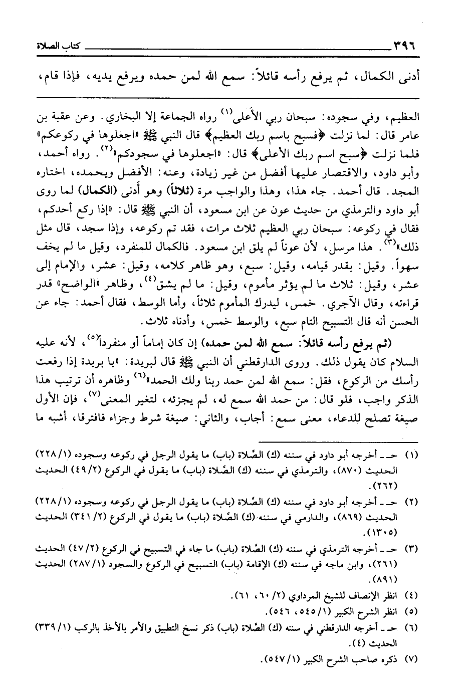 ـــــــــــــــــــــــــــــQالْعَظِيمِ، وَفِي سُجُودِهِ سُبْحَانَ رَبِّي الْأَعْلَى» رَوَاهُ الْجَمَاعَةُ إِلَّا الْبُخَارِيَّ، وَعَنْ عُقْبَةَ بْنِ عَامِرٍ قَالَ: «لَمَّا نَزَلَتْ {فَسَبِّحْ بِاسْمِ رَبِّكَ الْعَظِيمِ} [الواقعة: 74] قَالَ النَّبِيُّ - صَلَّى اللَّهُ عَلَيْهِ وَسَلَّمَ -: اجْعَلُوهَا فِي رُكُوعِكُمْ، فَلَمَّا نَزَلَتْ {سَبِّحِ اسْمَ رَبِّكَ الأَعْلَى} [الأعلى: 1] قَالَ: اجْعَلُوهَا فِي سُجُودِكُمْ» رَوَاهُ أَحْمَدُ، وَأَبُو دَاوُدَ، وَالِاقْتِصَارُ عَلَيْهَا أَفْضَلُ مِنْ غَيْرِ زِيَادَةٍ، وَعَنْهُ: الْأَفْضَلُ وَيَحْمَدُهُ، اخْتَارَهُ الْمَجْدُ، قَالَ أَحْمَدُ: جَاءَ هَذَا وَهَذَا، وَالْوَاجِبُ مَرَّةً (ثَلَاثًا) وَهُوَ أَدْنَى (الْكَمَالِ) لِمَا رَوَى أَبُو دَاوُدَ، وَالتِّرْمِذِيُّ مِنْ حَدِيثِ عَوْنٍ عَنِ ابْنِ مَسْعُودٍ أَنَّ النَّبِيَّ - صَلَّى اللَّهُ عَلَيْهِ وَسَلَّمَ - قَالَ: «إِذَا رَكَعَ أَحَدُكُمْ فَقَالَ فِي رُكُوعِهِ: سُبْحَانَ رَبِّيَ الْعَظِيمِ ثَلَاثَ مَرَّاتٍ فَقَدْ تَمَّ رُكُوعُهُ، وَإِذَا سَجَدَ قَالَ مِثْلَ ذَلِكَ» هَذَا مُرْسَلٌ، لِأَنَّ عَوْنًا لَمْ يَلْقَ ابْنَ مَسْعُودٍ. فَالْكَمَالُ لِلْمُنْفَرِدِ، وَقِيلَ: مَا لَمْ يَخَفْ سَهْوًا، وَقِيلَ: بِقَدْرِ قِيَامِهِ، وَقِيلَ: سَبْعٌ، وَهُوَ ظَاهِرُ كَلَامِهِ، وَقِيلَ: عَشْرٌ، وَالْإِمَامُ إِلَى عَشْرٍ، وَقِيلَ: ثَلَاثٌ مَا لَمْ يُؤَثِّرْ مَأْمُومٌ، وَقِيلَ: مَا لم يشق، وَظَاهِرُ الْوَاضِحِ قَدْرَ قِرَاءَتِهِ، وَقَالَ الْآجُرِّيُّ خَمْسًا لِيُدْرِكَ الْمَأْمُومُ ثَلَاثًا، وَأَمَّا الْوَسَطُ فَقَالَ أَحْمَدُ جَاءَ عَنِ الْحَسَنِ أَنَّهُ قَالَ التَّسْبِيحُ التَّامُّ سَبْعٌ، وَالْوَسَطُ خَمْسٌ، وَأَدْنَاهُ ثَلَاثٌ.