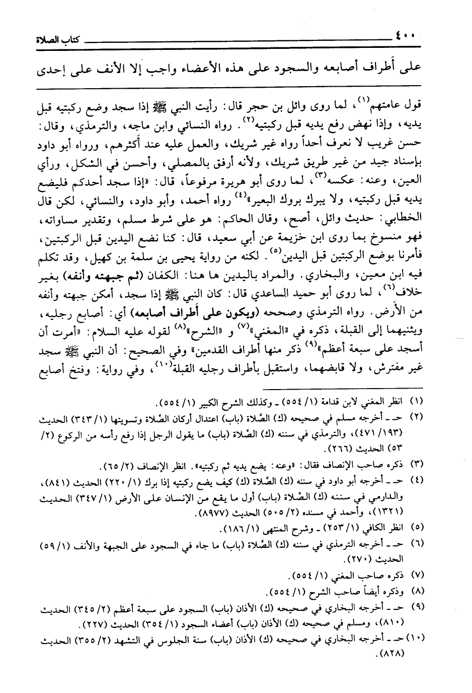 عَلَى أَطْرَافِ أَصَابِعِهِ، وَالسُّجُودُ عَلَى هَذِهِ الْأَعْضَاءِ وَاجِبٌ، إِلَّا الْأَنْفَ عَلَى إِحْدَى