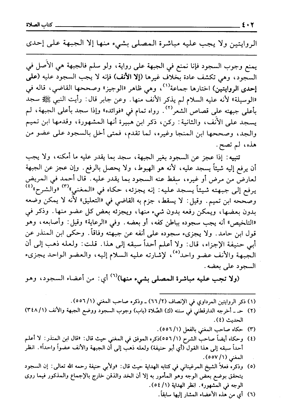 ـــــــــــــــــــــــــــــQيَمْنَعُ وُجُوبَ السُّجُودِ، فَإِنَّا نَمْنَعُ فِي الْجَبْهَةِ عَلَى رِوَايَةٍ، وَلَوْ سَلِمَ فَالْجَبْهَةُ هِيَ الْأَصْلُ فِي السُّجُودِ، وَهِيَ تُكْشَفُ عَادَةً بِخِلَافِ غَيْرِهَا (إِلَّا الْأَنْفَ) فَإِنَّهُ لَا يَجِبُ السُّجُودُ عَلَيْهِ (عَلَى إِحْدَى الرِّوَايَتَيْنِ) اخْتَارَهَا جَمَاعَةٌ، وَهِيَ ظَاهِرُ " الْوَجِيزِ " وَصَحَّحَهَا الْقَاضِي قَالَهُ فِي الْوَسِيلَةِ، لِأَنَّهُ - عَلَيْهِ السَّلَامُ - لَمْ يَذْكُرِ الْأَنْفَ مِنْهَا، وَعَنْ جَابِرٍ قَالَ: «رَأَيْتُ النَّبِيَّ - صَلَّى اللَّهُ عَلَيْهِ وَسَلَّمَ - سَجَدَ بِأَعْلَى جَبْهَتِهِ عَلَى قُصَاصِ الشَّعْرِ» رَوَاهُ تَمَّامُ فِي " فَوَائِدِهِ " وَإِذَا سَجَدَ بِأَعْلَى الْجَبْهَةِ لَمْ يَسْجُدْ عَلَى الْأَنْفِ، وَالثَّانِيَةُ: " رُكْنٌ " ذَكرَ ابْنُ هُبَيْرَةَ أَنَّهَا الْمَشْهُورَةُ، وَقَدَّمَهَا ابْنُ تَمِيمٍ وَالْجَدُّ، وَصَحَّحَهَا ابْنُ الْمُنَجَّا وَغَيْرُهُ لِمَا تَقَدَّمَ، فَمَتَى أَخَلَّ بِالسُّجُودِ عَلَى عُضْوٍ مِنْ هَذِهِ لَمْ تَصِحَّ.