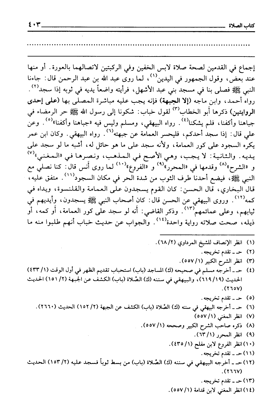 ـــــــــــــــــــــــــــــQإِجْمَاعٌ فِي الْقَدَمَيْنِ، لِصِحَّةِ صَلَاةِ لَابِسِ الْخُفَّيْنِ، وَفِي الرُّكْبَتَيْنِ لِاتِّصَالِهِمَا بِالْعَوْرَةِ أَوْ مِنْهَا، عِنْدَ بَعْضٍ، وَقَوْلُ الْجُمْهُورِ فِي الْيَدَيْنِ لِمَا رَوَى عَبْدُ اللَّهِ بْنُ عَبْدِ الرَّحْمَنِ قَالَ: «جَاءَنَا النَّبِيُّ - صَلَّى اللَّهُ عَلَيْهِ وَسَلَّمَ - فَصَلَّى بِنَا فِي مَسْجِدِ بَنِي عَبْدِ الْأَشْهَلِ، فَرَأَيْتُهُ وَاضِعًا يَدَيْهِ فِي ثَوْبِهِ إِذَا سَجَدَ» رَوَاهُ أَحْمَدُ، وَابْنُ مَاجَهْ (إِلَّا الْجَبْهَةَ) فَإِنَّهُ يَجِبُ عَلَيْهِ مُبَاشَرَةُ الْمُصَلَّى بِهَا (عَلَى إِحْدَى الرِّوَايَتَيْنِ) ذَكَرَهَا أَبُو الْخَطَّابِ لِقَوْلِ خَبَّابٍ: «شَكَوْنَا إِلَى رَسُولِ اللَّهِ - صَلَّى اللَّهُ عَلَيْهِ وَسَلَّمَ - حَرَّ الرَّمْضَاءِ فِي جِبَاهِنَا وَأَكُفِّنَا، فَلَمْ يُشْكِنَا» رَوَاهُ الْبَيْهَقِيُّ، وَمُسْلِمٌ، وَلَيْسَ فِيهِ جِبَاهُنَا وَأَكُفُّنَا، وَعَنْ عَلِيٍّ قَالَ: إِذَا سَجَدَ أَحَدُكُمْ فَلْيَحْسِرِ الْعِمَامَةَ عَنْ جَبْهَتِهِ. رَوَاهُ الْبَيْهَقِيُّ، وَكَانَ ابْنُ عُمَرَ يَكْرَهُ السُّجُودَ عَلَى كَوْرِ الْعِمَامَةَ، وَلِأَنَّهُ سَجَدَ عَلَى مَا هُوَ حَائِلٌ لَهُ، أَشْبَهَ مَا لَوْ سَجَدَ عَلَى يَدَيْهِ، وَالثَّانِيَةُ: لَا يَجِبُ، وَهِيَ الْأَصَحُّ فِي الْمَذْهَبِ، وَنَصَرَهَا فِي " الْمُغْنِي " و" الشَّرْحِ " وَقَدَّمَهَا فِي " الْمُحَرَّرِ " و" الْفُرُوعِ " لِمَا رَوَى أَنَسٌ قَالَ: «كُنَّا نُصَلِّي مَعَ النَّبِيِّ - صَلَّى اللَّهُ عَلَيْهِ وَسَلَّمَ - فَيَضَعُ أَحَدُنَا طَرَفَ الثَّوْبِ مِنْ شِدَّةِ الْحَرِّ فِي مَكَانِ السُّجُودِ» مُتَّفَقٌ عَلَيْهِ. قَالَ الْبُخَارِيُّ: قَالَ الْحَسَنُ: كَانَ الْقَوْمُ يَسْجُدُونَ عَلَى الْعِمَامَةِ وَالْقَلَنْسُوَةِ، وَيَدَاهُ فِي كُمِّهِ. وَرَوَى الْبَيْهَقِيُّ عَنِ الْحَسَنِ قَالَ: كَانَ أَصْحَابُ النَّبِيِّ - صَلَّى اللَّهُ عَلَيْهِ وَسَلَّمَ - يَسْجُدُونَ، وَأَيْدِيهِمْ فِي ثِيَابِهِمْ، وَعَلَى عَمَائِمِهِمْ. وَذَكَرَ الْقَاضِي أَنَّهُ لَوْ سَجَدَ عَلَى كَوْرِ الْعِمَامَةِ أَوْ كُمِّهِ أَوْ ذَيْلِهِ صَحَّتْ صَلَاتُهُ رِوَايَةً وَاحِدَةً، وَالْجَوَابُ عَنْ حَدِيثِ خَبَّابٍ أَنَّهُمْ طَلَبُوا مِنْهُ مَا