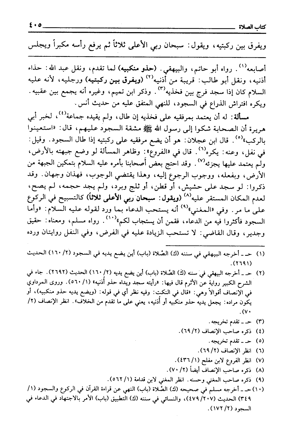 ـــــــــــــــــــــــــــــQأَصَابِعَهُ» رَوَاهُ أَبُو حَاتِمٍ، وَالْبَيْهَقِيُّ (حَذْوَ مَنْكِبَيْهِ) لِمَا تَقَدَّمَ، وَنَقَلَ عَبْدُ اللَّهِ: حِذَاءَ أُذُنَيْهِ، وَنَقَلَ أَبُو طَالِبٍ: قَرِيبَةً مِنْ أُذُنَيْهِ (وَيُفَرِّقُ بَيْنَ رُكْبَتَيْهِ) وَرِجْلَيْهِ، لِأَنَّهُ - عَلَيْهِ السَّلَامُ - كَانَ إِذَا سَجَدَ فَرَّجَ بَيْنَ فَخْذَيْهِ، وَذَكَرَ ابْنُ تَمِيمٍ، وَغَيْرُهُ أَنَّهُ يَجْمَعُ بَيْنَ عَقِبَيْهِ، وَيُكَرَهُ افْتِرَاشُ الذِّرَاعِ فِي السُّجُودِ لِلنَّهْيِ الْمُتَّفَقِ عَلَيْهِ مِنْ حَدِيثِ أَنَسٍ.