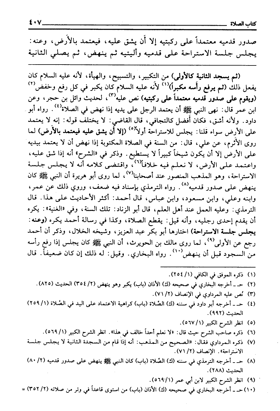 صُدُورِ قَدَمَيْهِ مُعْتَمِدًا عَلَى رُكْبَتَيْهِ إِلَّا أَنْ يَشُقَّ عَلَيْهِ، فَيَعْتَمِدُ بِالْأَرْضِ، وَعَنْهُ: يَجْلِسُ جِلْسَةَ الِاسْتِرَاحَةِ عَلَى قَدَمَيْهِ وَأَلْيَتَيْهِ، ثُمَّ يَنْهَضُ، ثُمَّ يُصَلِّي الثَّانِيَةَ
