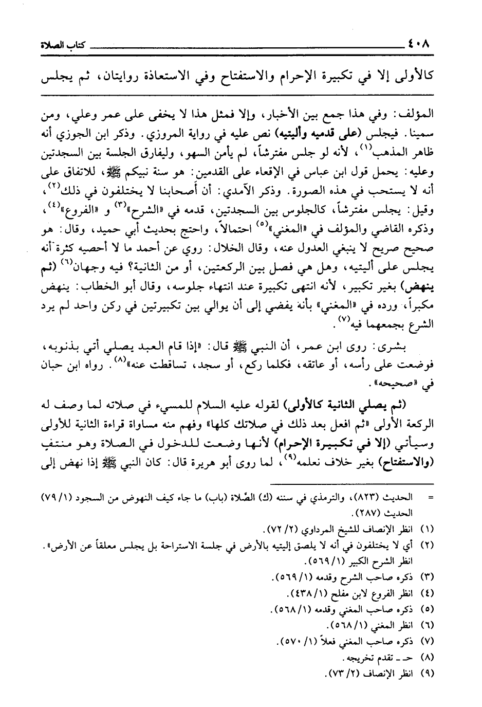 ـــــــــــــــــــــــــــــQالْمُؤَلِّفَ: وَفِي هَذَا جَمْعٌ بَيْنَ الْأَخْبَارِ، وَإِلَّا فَمِثْلُ هَذَا لَا يَخْفَى عَلَى عُمَرَ، وَعَلِيٍّ، وَمَنْ سَمَّيْنَا، فَيَجْلِسُ (عَلَى قَدَمَيْهِ، وَأَلْيَتَيْهِ) نُصَّ عَلَيْهِ فِي رِوَايَةِ الْمَرْوَزِيِّ، وَذَكَرَ ابْنُ الْجَوْزِيِّ أَنَّهُ ظَاهِرُ الْمَذْهَبِ، لِأَنَّهُ لَوْ جَلَسَ مُفْتَرِشًا لَمْ يَأْمَنِ السَّهْوَ، وَلْيُفَارِقِ الْجِلْسَةَ بَيْنَ السَّجْدَتَيْنِ وَعَلَيْهِ يُحْمَلُ قَوْلُ ابْنِ عَبَّاسٍ فِي الْإِقْعَاءِ عَلَى الْقَدَمَيْنِ: هُوَ سُنَّةُ نَبِيِّكُمْ - صَلَّى اللَّهُ عَلَيْهِ وَسَلَّمَ - لِلِاتِّفَاقِ عَلَى أَنَّهُ لَا يُسْتَحَبُّ فِي هَذِهِ الصُّورَةِ، وَذَكَرَ الْآمِدِيُّ أَنَّ أَصْحَابَنَا لَا يَخْتَلِفُونَ فِي ذَلِكَ، وَقِيلَ: يَجْلِسُ مُفْتَرِشًا كَالْجُلُوسِ بَيْنَ السَّجْدَتَيْنِ، قَدَّمَهُ فِي " الشَّرْحِ " و" الْفُرُوعِ " وَذَكَرَهُ الْقَاضِي، وَالْمُؤَلِّفُ فِي " الْمُغْنِي " احْتِمَالًا، وَاحْتَجَّ بِحَدِيثِ أَبِي حُمَيْدٍ، وَقَالَ: هُوَ صَحِيحٌ صَرِيحٌ لَا يَنْبَغِي الْعُدُولُ عَنْهُ، وَقَالَ الْخَلَّالُ: رُوِيَ عَنْ أَحْمَدَ مَا لَا أُحْصِيهِ كَثْرَةً أَنَّهُ يَجْلِسُ عَلَى أَلْيَتَيْهِ، وَهَلْ هِيَ فَصْلٌ بَيْنَ الرَّكْعَتَيْنِ أَوْ مِنَ الثَّانِيَةِ، فِيهِ وَجْهَانِ (ثُمَّ يَنْهَضُ) بِغَيْرِ تَكْبِيرٍ، لِأَنَّهُ انْتَهَى تَكْبِيرُهُ عِنْدَ انْتِهَاءِ جُلُوسِهِ، وَقَالَ أَبُو الْخَطَّابِ: يَنْهَضُ مُكَبِّرًا، وَرَدَّهُ فِي " الْمُغْنِي " بِأَنَّهُ يُفْضِي إِلَى أَنْ يُوَالِيَ بَيْنَ تَكْبِيرَتَيْنِ فِي رُكْنٍ وَاحِدٍ لَمْ يَرِدِ الشَّرْعُ بِجَمْعِهِمَا فِيهِ.