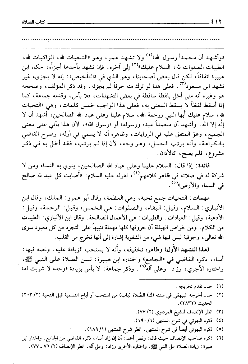 ـــــــــــــــــــــــــــــQ «وَأَشْهَدُ أَنَّ مُحَمَّدًا رَسُولُ اللَّهِ» وَلَا تَشَهُّدَ عُمَرَ، وَهُوَ: التَّحِيَّاتُ لِلَّهِ الزَّاكِيَاتُ لِلَّهِ الطَّيِّبَاتُ الصَّلَوَاتُ لِلَّهِ السَّلَامُ عَلَيْكَ إِلَى آخِرِهِ، فَإِنْ تَشَهَّدَ بِأَحَدِهَا أَجَزَأَهُ، حَكَاهُ ابْنُ هُبَيْرَةَ اتِّفَاقًا، لَكِنْ قَالَ بَعْضُ أَصْحَابِنَا: وَهُوَ الَّذِي فِي " التَّلْخِيصِ " إِنَّهُ لَا يُجْزِئُ غَيْرُ تَشَهُّدِ ابْنِ مَسْعُودٍ، فَعَلَى هَذَا لَوْ تَرَكَ مِنْهُ حَرْفًا لَمْ يُجْزِئْهُ، وَقَدْ ذَكَرَ الْمُؤَلِّفُ، وَصَحَّحَهُ هُوَ وَغَيْرُهُ: أَنَّهُ مَتَى أَخَلَّ بِلَفْظَةٍ سَاقِطَةٍ فِي بَعْضِ التَّشَهُّدَاتِ فَلَا بَأْسَ، وَقَدَّمَهُ جَمَاعَةٌ، كَمَا إِذَا أَسْقَطَ لَفْظًا لَا يَسْقُطُ الْمَعْنَى بِهِ، فَعَلَى هَذَا الْوَاجِبُ خَمْسُ كَلِمَاتٍ، وَهِيَ: التَّحِيَّاتُ لِلَّهِ، سَلَامٌ عَلَيْكَ أَيُّهَا النَّبِيُّ وَرَحْمَةُ اللَّهِ، سَلَامٌ عَلَيْنَا وَعَلَى عِبَادِ اللَّهِ الصَّالِحِينَ، أَشْهَدُ أَنْ لَا إِلَهَ إِلَّا اللَّهُ، وَأَشْهَدُ أَنَّ مُحَمَّدًا عَبْدُهُ وَرَسُولُهُ، أَوْ (رَسُولُ اللَّهِ) ، لِأَنَّ هَذَا يَأْتِي عَلَى مَعْنَى الْجَمِيعِ، وَهُوَ الْمُتَّفَقُ عَلَيْهِ فِي الرِّوَايَاتِ، وَظَاهِرُهُ أَنَّهُ لَا يُسَمِّي فِي أَوَّلِهِ، وَصَرَّحَ الْقَاضِي بِالْكَرَاهَةِ، وَأَنَّهُ يُرَتِّبُ الْجُمَلَ، وَهُوَ وَجْهٌ، لِأَنَّ إِذَا لَمْ يُرَتِّبْ فَقَدْ أَخَلَّ بِهِ فِي ذِكْرٍ مَشْرُوعٍ، فَلَمْ يَصِحَّ كَالْأَذَانِ.
