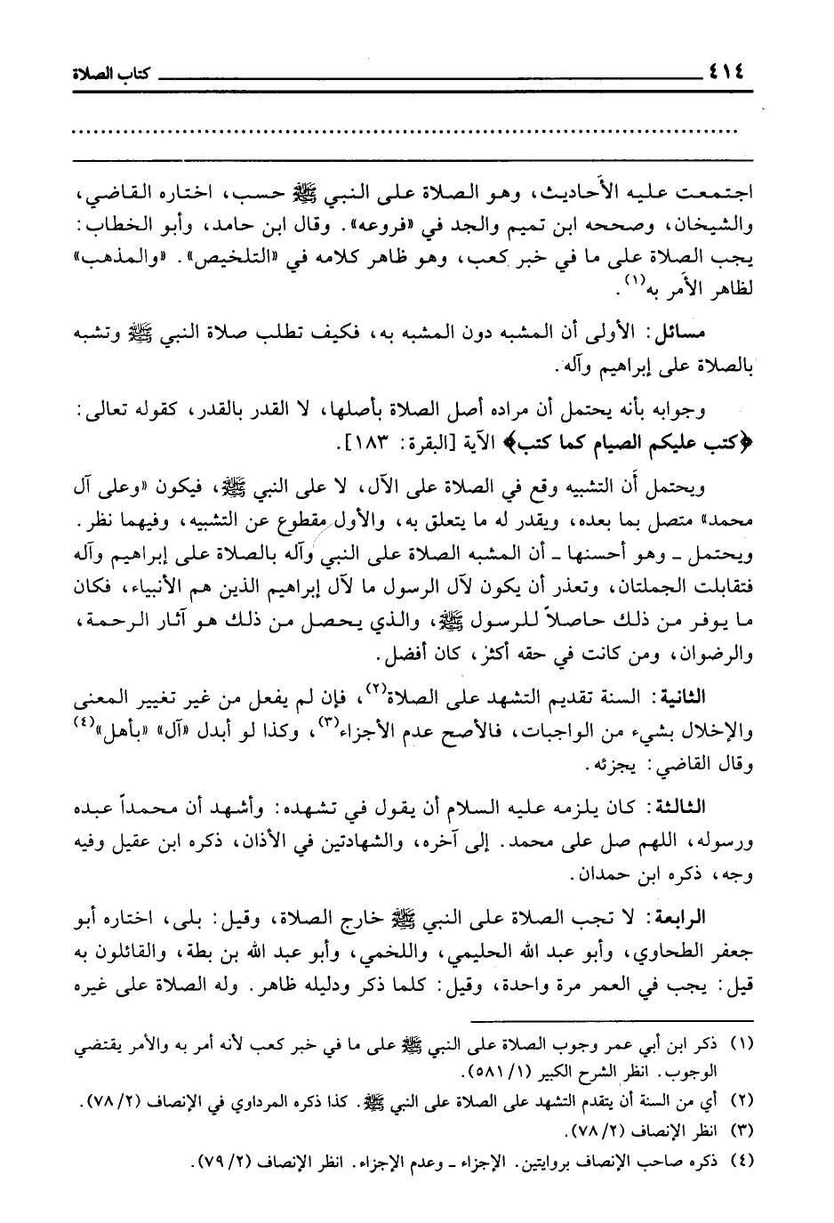 ـــــــــــــــــــــــــــــQاجْتَمَعَتْ عَلَيْهِ الْأَحَادِيثُ، وَهُوَ الصَّلَاةُ عَلَى النَّبِيِّ - صَلَّى اللَّهُ عَلَيْهِ وَسَلَّمَ - حَسَبَ مَا اخْتَارَهُ الْقَاضِي وَالشَّيْخَانِ، وَصَحَّحَهُ ابْنُ تَمِيمٍ وَالْجَدُّ فِي " فُرُوعِهِ "، وَقَالَ ابْنُ حَامِدٍ، وَأَبُو الْخَطَّابِ: يَجِبُ الصَّلَاةُ عَلَى مَا فِي خَبَرِ كَعْبٍ، وَهُوَ ظَاهِرُ كَلَامِهِ فِي " التَّلْخِيصِ " و" الْمَذْهَبِ " لِظَاهِرِ الْأَمْرِ بِهِ.