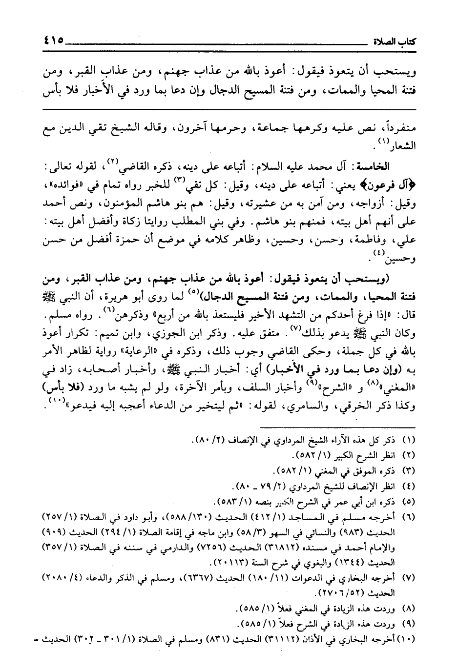 الْخَامِسَةُ: آلُ مُحَمَّدٍ - عَلَيْهِ السَّلَامُ -: أَتْبَاعُهُ عَلَى دِينِهِ، ذَكَرَهُ الْقَاضِي لِقَوْلِهِ تَعَالَى (آلِ فِرْعَوْنَ) يَعْنِي أَتْبَاعَهُ عَلَى دِينِهِ، وَقِيلَ: كُلُّ تَقِيٍّ لِلْخَبَرِ، رَوَاهُ تَمَّامٌ فِي " فَوَائِدِهِ " وَقِيلَ: أَزْوَاجُهُ، وَمَنْ آمَنَ بِهِ مِنْ عَشِيرَتِهِ، وَقِيلَ: هُمْ بَنُو هَاشِمٍ الْمُؤْمِنُونَ، وَنَصَّ أَحْمَدُ عَلَى أَنَّهُمْ أَهْلُ بَيْتِهِ، فَمِنْهُمْ بَنُو هَاشِمٍ، وَفِي بَنِي الْمُطَّلِبِ رِوَايَتَا زَكَاةٍ، وَأَفْضَلُ أَهْلِ بَيْتِهِ عَلِيٌّ، وَفَاطِمَةُ، وَحَسَنٌ، وَحُسَيْنٌ، وَظَاهِرُ كَلَامِهِ فِي مَوْضِعٍ أَنَّ حَمْزَةَ أَفْضَلُ مِنْ حَسَنٍ وَحُسَيْنٍ.