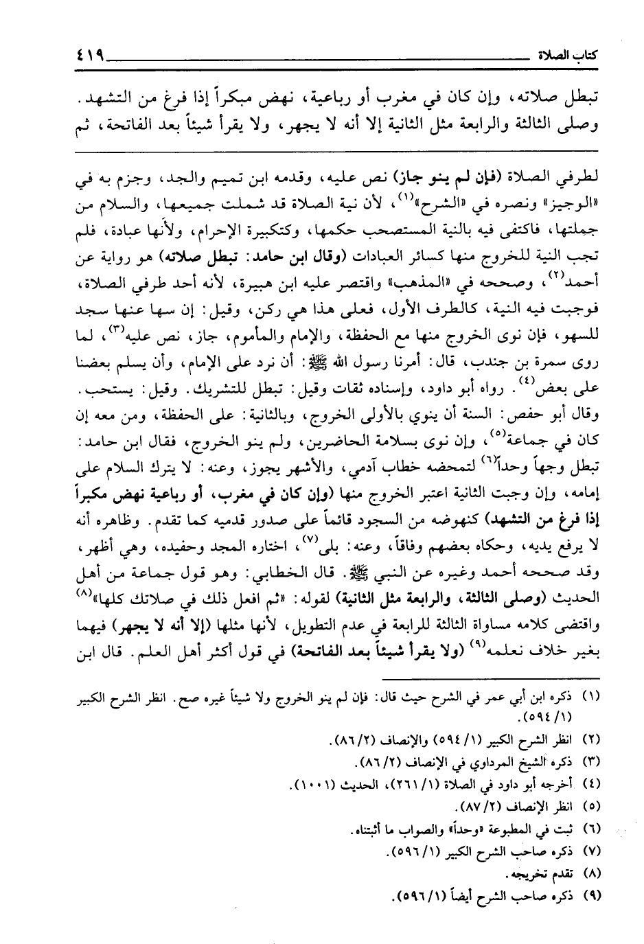 ـــــــــــــــــــــــــــــQلِطَرَفَيِ الصَّلَاةِ (فَإِنْ لَمْ يَنْوِ جَازَ) نُصَّ عَلَيْهِ، وَقَدَّمَهُ ابْنُ تَمِيمٍ وَالْجَدُّ، وَجَزَمَ بِهِ فِي " الْوَجِيزِ " وَنَصَرَهُ فِي " الشَّرْحِ " لِأَنَّ نِيَّةَ الصَّلَاةِ قَدْ شَمِلَتْ جَمِيعَهَا، وَالسَّلَامُ مِنْ جُمْلَتِهَا، فَاكْتفى فِيهِ بِالنِّيَّةِ الْمُسْتَصْحَبِ حُكْمُهَا، وَكَتَكْبِيرَةِ الْإِحْرَامِ، وَلِأَنَّهَا عِبَادَةٌ فَلَمْ تَجِبِ النِّيَّةُ لِلْخُرُوجِ مِنْهَا كَسَائِرِ الْعِبَادَاتِ (وَقَالَ ابْنُ حَامِدٍ: تَبْطُلُ صَلَاتُهُ) هُوَ رِوَايَةٌ عَنْ أَحْمَدَ، وَصَحَّحَهُ فِي الْمَذْهَبِ، وَاقْتَصَرَ عَلَيْهِ ابْنُ هُبَيْرَةَ، لِأَنَّهُ أَحَدُ طَرَفَيِ الصَّلَاةِ، فَوَجَبَتْ فِيهِ النِّيَّةُ كَالطَّرَفِ الْأَوَّلِ، فَعَلَى هَذَا هِيَ رُكْنٌ، وَقِيلَ: إِنْ سَهَا عَنْهَا سَجَدَ لِلسَّهْوِ، فَإِنْ نَوَى الْخُرُوجَ مِنْهَا مَعَ الْحَفَظَةِ وَالْإِمَامِ وَالْمَأْمُومِ جَازَ، نُصَّ عَلَيْهِ، لِمَا رَوَى سَمُرَةُ بْنُ جُنْدُبٍ قَالَ: «أَمَرَنَا رَسُولُ اللَّهِ - صَلَّى اللَّهُ عَلَيْهِ وَسَلَّمَ - أَنْ نَرُدَّ عَلَى الْإِمَامِ، وَأَنْ يُسَلِّمَ بَعْضُنَا عَلَى بَعْضٍ» رَوَاهُ أَبُو دَاوُدَ، وَإِسْنَادُهُ ثِقَاتٌ، وَقِيلَ: تَبْطُلُ لِلتَّشْرِيكِ، وَقِيلَ: يُسْتَحَبُّ، وَقَالَ أَبُو حَفْصٍ: السُّنَّةُ أَنْ يَنْوِيَ بِالْأُولَى الْخُرُوجَ، وَبِالثَّانِيَةِ عَلَى الْحَفَظَةِ وَمَنْ مَعَهُ إِنْ كَانَ فِي جَمَاعَةٍ، وَإِنْ نَوَى بِسَلَامِهِ الْحَاضِرِينَ، وَلَمْ يَنْوِ الْخُرُوجَ، فَقَالَ ابْنُ حَامِدٍ: تَبْطُلُ وَجْهًا وَاحِدًا لِتَمَحُّضِهِ خِطَابَ آدَمِيٍّ، وَالْأَشْهَرُ يَجُوزُ، وَعَنْهُ: لَا يَتْرُكُ السَّلَامَ عَلَى إِمَامِهِ، وَإِنْ وَجَبَتِ الثَّانِيَةُ اعْتَبَرَ الْخُرُوجَ مِنْهَا (وَإِنْ كَانَ فِي مَغْرِبٍ أَوْ رُبَاعِيَّةٍ نَهَضَ مُكَبِّرًا إِذَا فَرَغَ مِنَ التَّشَهُّدِ) كَنُهُوضِهِ مِنَ السُّجُودِ قَائِمًا عَلَى صُدُورِ قَدَمَيْهِ كَمَا تَقَدَّمَ، وَظَاهِرُهُ أَنَّهُ لَا يَرْفَعُ يَدَيْهِ، وَحَكَاهُ بَعْضُهُمْ وِفَاقًا، وَعَنْهُ: بَلَى، اخْتَارَهُ الْمَجْدُ، وَحَفِيدُهُ، وَهِيَ أَظْهَرُ، وَقَدْ صَحَّحَهُ أَحْمَدُ، وَغَيْرُهُ عَنِ النَّبِيِّ - صَلَّى اللَّهُ عَلَيْهِ وَسَلَّمَ - قَالَ الْخَطَّابِيُّ: وَهُوَ قَوْلُ جَمَاعَةٍ مِنْ أَهْلِ الْحَدِيثِ (وَصَلَّى الثَّالِثَةَ، وَالرَّابِعَةَ مِثْلَ الثَّانِيَةِ) لِقَوْلِهِ: «ثُمَّ افْعَلْ ذَلِكَ فِي صَلَاتِكَ كُلِّهَا» وَاقْتَضَى كَلَامُهُ مُسَاوَاةَ الثَّالِثَةِ لِلرَّابِعَةِ فِي عَدَمِ التَّطْوِيلِ، لِأَنَّهَا مِثْلُهَا (إِلَّا أَنَّهُ لَا يَجْهَرُ) فِيهِمَا بِغَيْرِ خِلَافٍ نَعْلَمُهُ (وَلَا يَقْرَأُ شَيْئًا بَعْدَ الْفَاتِحَةِ) فِي قَوْلِ أَكْثَرِ أَهْلِ الْعِلْمِ، قَالَ ابْنُ