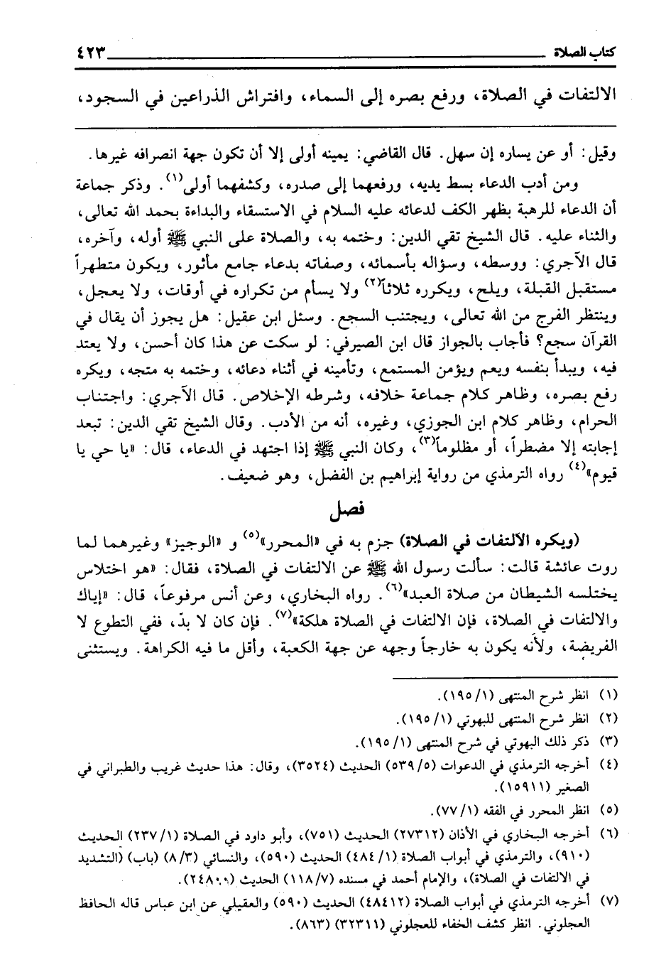 الِالْتِفَاتُ فِي الصَّلَاةِ، وَرَفْعُ بَصَرِهِ إِلَى السَّمَاءِ، وَافْتِرَاشُ الذِّرَاعَيْنِ فِي السُّجُودِ،