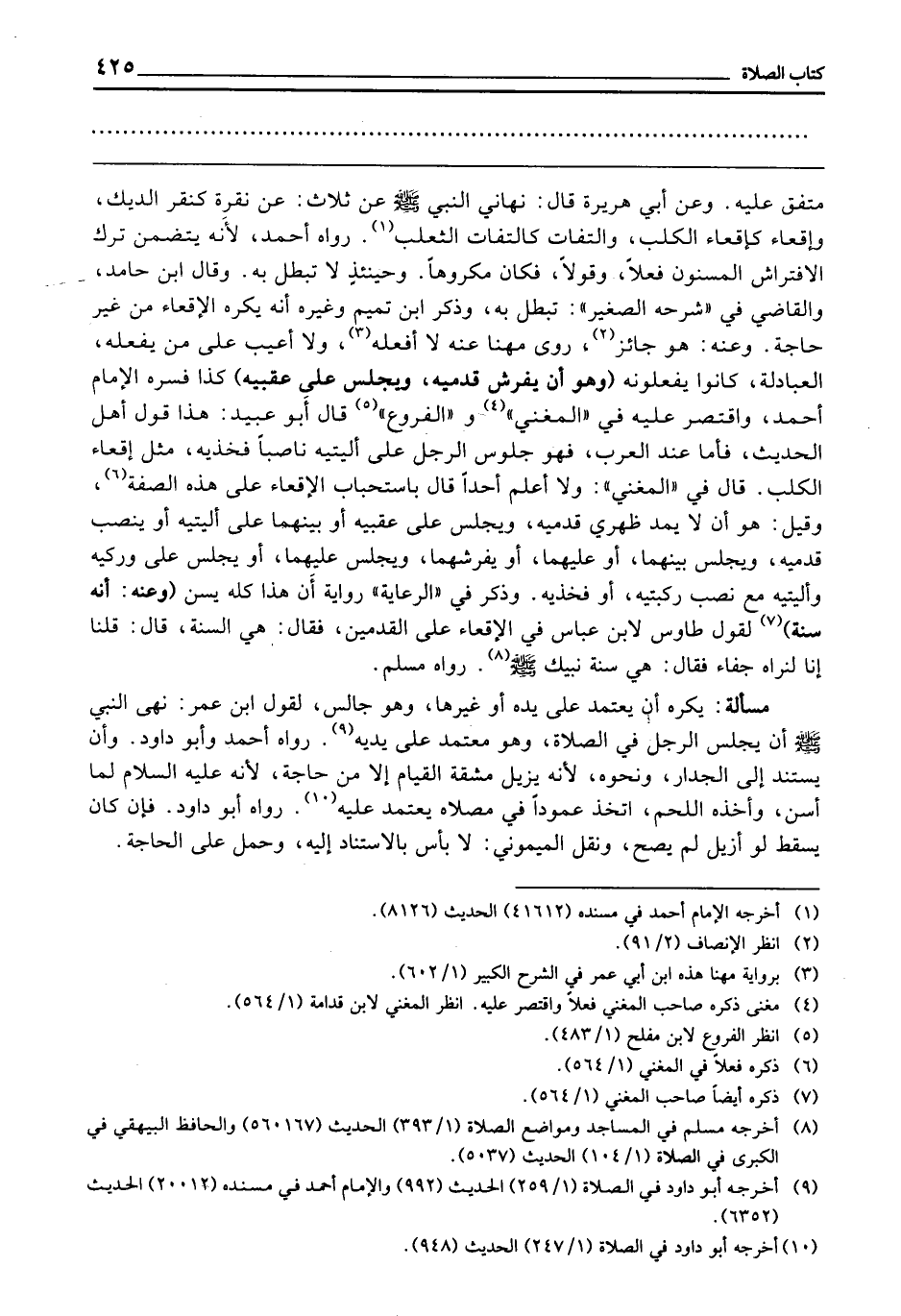 ـــــــــــــــــــــــــــــQمُتَّفَقٌ عَلَيْهِ، وَعَنْ أَبِي هُرَيْرَةَ قَالَ: «نَهَانِي النَّبِيُّ - صَلَّى اللَّهُ عَلَيْهِ وَسَلَّمَ - عَنْ ثَلَاثٍ: عَنْ نَقْرَةٍ كَنَقْرِ الدِّيكِ، وَإِقْعَاءٍ كَإِقْعَاءِ الْكَلْبِ، وَالْتِفَاتٍ كَالْتِفَاتِ الثَّعْلَبِ» رَوَاهُ أَحْمَدُ، لِأَنَّهُ يَتَضَمَّنُ تَرْكَ الِافْتِرَاشِ الْمَسْنُونِ فِعْلًا، وَقَوْلًا، فَكَانَ مَكْرُوهًا، وَحِينَئِذٍ لَا تَبْطُلُ بِهِ، وَقَالَ ابْنُ حَامِدٍ، وَالْقَاضِي فِي " شَرْحِهِ الصَّغِيرِ ": تَبْطُلُ بِهِ، وَذَكَرَ ابْنُ تَمِيمٍ، وَغَيْرُهُ أَنَّهُ يُكْرَهُ الْإِقْعَاءُ مِنْ غَيْرِ حَاجَةٍ، وَعَنْهُ: هُوَ جَائِزٌ، رَوَى مُهَنًّا عَنْهُ: لَا أَفْعَلُهُ، وَلَا أَعِيبُ عَلَى مَنْ يَفْعَلُهُ، الْعَبَادِلَةُ كَانُوا يَفْعَلُونَهُ (وَهُوَ أَنْ يَفْرِشَ قَدَمَيْهِ، وَيَجْلِسَ عَلَى عَقِبَيْهِ) كَذَا فَسَّرَهُ الْإِمَامُ أَحْمَدُ، وَاقْتَصَرَ عَلَيْهِ فِي " الْمُغْنِي " و" الْفُرُوعِ " قَالَ أَبُو عُبَيْدٍ: هَذَا قَوْلُ أَهْلِ الْحَدِيثِ، فَأَمَّا عِنْدَ الْعَرَبِ: فَهُوَ جُلُوسُ الرَّجُلِ عَلَى أَلْيَتَيْهِ نَاصِبًا فَخْذَيْهِ مِثْلَ إِقْعَاءِ الْكَلْبِ، قَالَ فِي " الْمُغْنِي ": وَلَا أَعْلَمُ أَحَدًا قَالَ بِاسْتِحْبَابِ الْإِقْعَاءِ عَلَى هَذِهِ الصِّفَةِ، وَقِيلَ: هُوَ أَنْ لَا يَمُدَّ ظَهْرَيْ قَدَمَيْهِ، وَيَجْلِسَ عَلَى عَقِبَيْهِ أَوْ بَيْنَهُمَا عَلَى أَلْيَتَيْهِ أَوْ يَنْصِبَ قَدَمَيْهِ، وَيَجْلِسَ بَيْنَهُمَا، أَوْ عَلَيْهِمَا، أَوْ يَفْرِشُهُمَا، وَيَجْلِسُ عَلَيْهِمَا، أَوْ يَجْلِسُ عَلَى وَرِكَيْهِ، وَأَلْيَتَيْهِ مَعَ نَصْبِ رُكْبَتَيْهِ أَوْ فَخْذَيْهِ، وَذَكَرَ فِي " الرِّعَايَةِ " رِوَايَةَ أَنَّ هَذَا كُلَّهُ يُسَنُّ (وَعَنْهُ: أَنَّهُ سُنَّةٌ) لِقَوْلِ طَاوُسٍ لِابْنِ عَبَّاسٍ فِي الْإِقْعَاءِ عَلَى الْقَدَمَيْنِ فَقَالَ: هِيَ السُّنَّةُ قَالَ: قُلْنَا إِنَّا لَنَرَاهُ جَفَاءً، فَقَالَ: هِيَ سُنَّةُ نَبِيِّكَ - صَلَّى اللَّهُ عَلَيْهِ وَسَلَّمَ - رَوَاهُ مُسْلِمٌ.