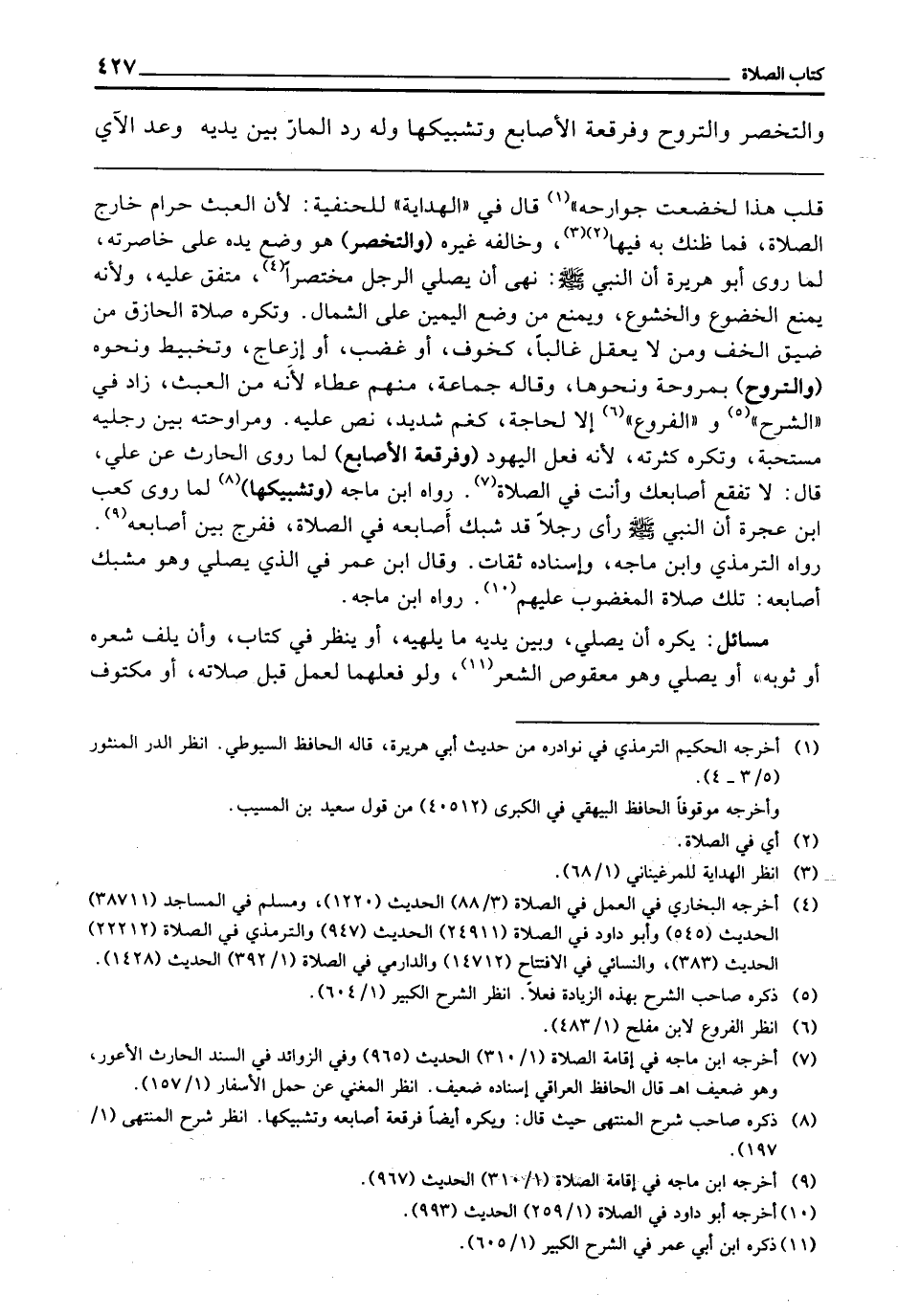 ـــــــــــــــــــــــــــــQقَلْبُ هَذَا لَخَضَعَتْ جَوَارِحُهُ» قَالَ فِي " الْهِدَايَةِ " لِلْحَنَفِيَّةِ، لِأَنَّ الْعَبَثَ حَرَامٌ خَارِجَ الصَّلَاةِ فَمَا ظَنُّكَ بِهِ فِيهَا، وَخَالَفَهُ غَيْرُهُ (وَالتَّخَصُّرُ) هُوَ وَضْعُ يَدِهِ عَلَى خَاصِرَتِهِ، لِمَا رَوَى أَبُو هُرَيْرَةَ «أَنَّ النَّبِيَّ - صَلَّى اللَّهُ عَلَيْهِ وَسَلَّمَ - نَهَى أَنْ يُصَلِّيَ الرَّجُلُ مُخْتَصِرًا» مُتَّفَقٌ عَلَيْهِ، وَلِأَنَّهُ يَمْنَعُ الْخُضُوعَ وَالْخُشُوعَ، وَيَمْنَعُ مِنْ وَضْعِ الْيَمِينِ عَلَى الشِّمَالِ، وَتُكْرَهُ صَلَاةُ الْحَازِقِ مِنْ ضِيقِ الْخُفِّ، وَمَنْ لَا يَعْقِلُ غَالِبًا، كَخَوْفٍ أَوْ غَضَبٍ أَوْ إِزْعَاجٍ، وَتَخْبِيطٍ، وَنَحْوِهِ (وَالتَّرَوُّحِ) بِمِرْوَحَةٍ، وَنَحْوِهَا، وَقَالَهُ جَمَاعَةٌ مِنْهُمْ عَطَاءٌ، لِأَنَّهُ مِنَ الْعَبَثِ، زَادَ فِي " الشَّرْحِ " و" الْفُرُوعِ " إِلَّا لِحَاجَةٍ كَغَمٍّ شَدِيدٍ، نُصَّ عَلَيْهِ، وَمُرَاوَحَتُهُ بَيْنَ رِجْلَيْهِ مُسْتَحَبَّةٌ، وَتُكْرَهُ كَثْرَتُهُ، لِأَنَّهُ فِعْلُ الْيَهُودِ (وَفَرْقَعَةُ الْأَصَابِعِ) لِمَا رَوَى الْحَارِثُ عَنْ عَلِيٍّ قَالَ: لَا تُفقِّعْ أَصَابِعَكَ، وَأَنْتَ فِي الصَّلَاةِ رَوَاهُ ابْنُ مَاجَهْ. (وَتَشْبِيكُهَا) لِمَا رَوَى كَعْبُ بْنُ عُجْرَةَ «أَنَّ النَّبِيَّ - صَلَّى اللَّهُ عَلَيْهِ وَسَلَّمَ - رَأَى رَجُلًا قَدْ شَبَّكَ أَصَابِعَهُ فِي الصَّلَاةِ، فَفَرَّجَ بَيْنَ أَصَابِعِهِ» رَوَاهُ التِّرْمِذِيُّ، وَابْنُ مَاجَهْ، وَإِسْنَادُهُ ثِقَاتٌ، وَقَالَ ابْنُ عُمَرَ فِي الَّذِي يُصَلِّي، وَهُوَ مُشَبِّكٌ أَصَابِعَهُ: تِلْكَ صَلَاةُ الْمَغْضُوبِ عَلَيْهِمْ. رَوَاهُ ابْنُ مَاجَهْ.