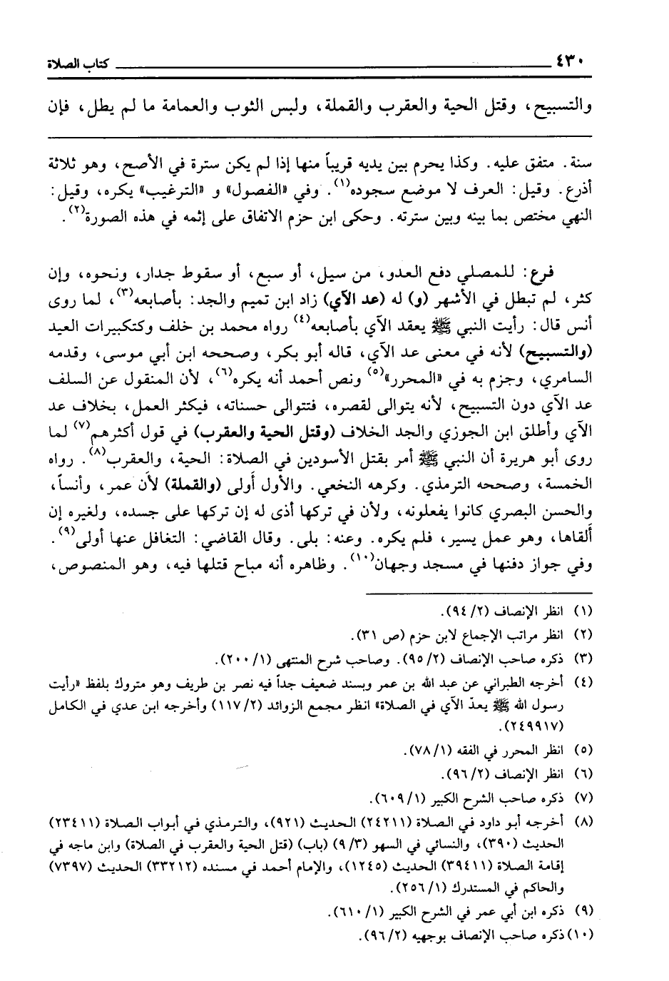فَرْعٌ: لِلْمُصَلِّي دَفْعُ الْعَدُوِّ مِنْ سَيْلٍ أَوْ سَبُعٍ أَوْ سُقُوطِ جِدَارٍ، وَنَحْوِهِ، وَإِنْ كَثُرَ لَمْ تَبْطُلْ فِي الْأَشْهَرِ (و) لَهُ (عَدُّ الْآيِ) زَادَ ابْنُ تَمِيمٍ وَالْجَدُّ: بِأَصَابِعِهِ، لِمَا رَوَى أَنَسٌ قَالَ: «رَأَيْتُ النَّبِيَّ - صَلَّى اللَّهُ عَلَيْهِ وَسَلَّمَ - يَعْقِدُ الْآيَ بِأَصَابِعِهِ» رَوَاهُ مُحَمَّدُ بْنُ خَلَفٍ، وَكَتَكْبِيرَاتِ الْعِيدِ (وَالتَّسْبِيحِ) لِأَنَّهُ فِي مَعْنَى عَدِّ الْآيِ، قَالَهُ أَبُو بَكْرٍ، وَصَحَّحَهُ ابْنُ أَبِي مُوسَى، وقدمه السَّامِرِيُّ، وَجَزَمَ بِهِ فِي " الْمُحَرَّرِ " وَنَصَّ أَحْمَدُ أَنَّهُ يُكْرَهُ، لِأَنَّ الْمَنْقُولَ عَنِ السَّلَفِ عَدُّ الْآيِ دُونَ التَّسْبِيحِ، لِأَنَّهُ يَتَوَالَى لِقَصْرِهِ فَتَتَوَالَى حَسَنَاتُهُ، فَيَكْثُرُ الْعَمَلُ، بِخِلَافِ عَدِّ الْآيِ، وَأَطْلَقَ ابْنُ الْجَوْزِيِّ وَالْجَدُّ الْخِلَافَ (وَقَتْلُ الْحَيَّةِ، وَالْعَقْرَبِ) فِي قَوْلِ أَكْثَرِهِمْ لِمَا رَوَى أَبُو هُرَيْرَةَ «أَنَّ النَّبِيَّ - صَلَّى اللَّهُ عَلَيْهِ وَسَلَّمَ - أَمَرَ بِقَتْلِ الْأَسْوَدَيْنِ فِي الصَّلَاةِ الْحَيَّةِ وَالْعَقْرَبِ» رَوَاهُ الْخَمْسَةُ، وَصَحَّحَهُ التِّرْمِذِيُّ، وَكَرِهَهُ النَّخَعِيُّ، وَالْأَوَّلُ أَوْلَى (وَالْقَمْلَةِ) لِأَنَّ عُمَرَ، وَأَنَسًا، وَالْحَسَنَ الْبَصْرِيَّ كَانُوا يَفْعَلُونَهُ، وَلِأَنَّ فِي تَرْكِهَا أَذًى لَهُ إِنْ تَرَكَهَا عَلَى جَسَدِهِ، وَلِغَيْرِهِ إِنْ أَلْقَاهَا، وَهُوَ عَمَلٌ يَسِيرٌ، فَلَمْ يُكْرَهْ، وَعَنْهُ: بَلَى، وَقَالَ الْقَاضِي التَّغَافُلُ عَنْهَا أَوْلَى، وَفِي جَوَازِ دَفْنِهَا فِي مَسْجِدٍ وَجْهَانِ، وَظَاهِرُهُ أَنَّهُ مُبَاحٌ قَتْلُهَا فِيهِ، وَهُوَ الْمَنْصُوصُ،
