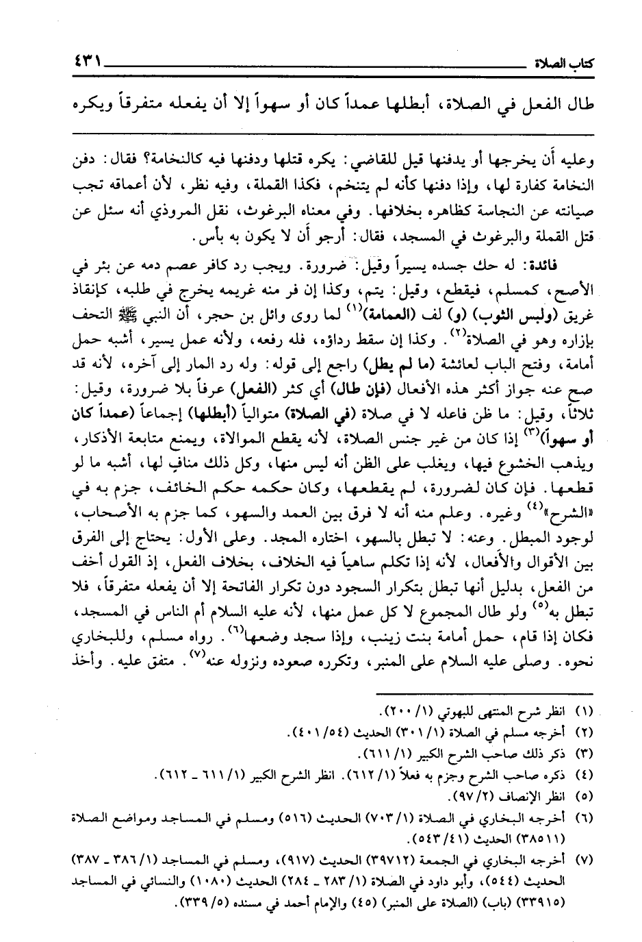 فَائِدَةٌ: لَهُ حَكُّ جَسَدِهِ يَسِيرًا، وَقِيلَ: ضَرُورَةً، وَيَجِبُ رَدُّ كَافِرٍ عَصَمَ دَمَهُ عَنْ بِئْرٍ فِي الْأَصَحِّ، كَمُسْلِمٍ، فَيَقْطَعُ، وَقِيلَ: يُتِمُّ، وَكَذَا إِنْ فَرَّ مِنْهُ غَرِيمُهُ يَخْرُجُ فِي طَلَبِهِ، كَإِنْقَاذِ غَرِيقٍ (وَلُبْسُ الثَّوْبِ) (و) لَفُّ (الْعِمَامَةِ) لِمَا رَوَى وَائِلُ بْنُ حُجْرٍ «أَنَّ النَّبِيَّ - صَلَّى اللَّهُ عَلَيْهِ وَسَلَّمَ - الْتَحَفَ بِإِزَارِهِ، وَهُوَ فِي الصَّلَاةِ» ، وَكَذَا إِنْ سَقَطَ رِدَاؤُهُ فَلَهُ رَفْعُهُ وَلِأَنَّهُ عَمَلٌ يَسِيرٌ أَشْبَهَ حَمْلَ أُمَامَةَ، وَفَتْحَ الْبَابِ لِعَائِشَةَ (مَا لَمْ يَطُلْ) رَاجِعٌ إِلَى قَوْلِهِ: وَلَهُ رَدُّ الْمَارّ إِلَى آخِرِهِ، لِأَنَّهُ قَدْ صَحَّ عَنْهُ جَوَازُ أَكْثَرِ هَذِهِ الْأَفْعَالِ (فَإِنْ طَالَ) أَيْ: كَثُرَ (الْفِعْلُ) عُرْفًا بِلَا ضَرُورَةٍ، وَقِيلَ: ثَلَاثًا، وَقِيلَ: مَا ظَنَّ فَاعِلُهُ لَا فِي صَلَاةٍ (فِي الصَّلَاةِ) مُتَوَالِيًا (أَبْطَلَهَا) إِجْمَاعًا (عَمْدًا كَانَ أَوْ سَهْوًا) إِذَا كَانَ مِنْ غَيْرِ جِنْسِ الصَّلَاةِ، لِأَنَّهُ يَقْطَعُ الْمُوَالَاةَ، وَيَمْنَعُ مُتَابَعَةَ الْأَذْكَارِ، وَيُذْهِبُ الْخُشُوعَ فِيهَا، وَيَغْلِبُ عَلَى الظَّنِّ أَنَّهُ لَيْسَ مِنْهَا، وَكُلُّ ذَلِكَ مُنَافٍ لَهَا، أَشْبَهَ مَا لَوْ قَطَعَهَا، فَإِنْ كَانَ لِضَرُورَةٍ لَمْ يَقْطَعْهَا، وَكَانَ حُكْمُهُ حُكْمَ الْخَائِفِ، جَزَمَ بِهِ فِي " الشَّرْحِ " وَغَيْرِهِ، وَعُلِمَ مِنْهُ أَنَّهُ لَا فَرْقَ بَيْنَ الْعَمْدِ وَالسَّهْوِ، كَمَا جَزَمَ بِهِ الْأَصْحَابُ لِوُجُودِ الْمُبْطِلِ، وَعَنْهُ: لَا تَبْطُلُ بِالسَّهْوِ، اخْتَارَهُ الْمَجْدُ، وَعَلَى الْأَوَّلِ: يَحْتَاجُ إِلَى الْفَرْقِ بَيْنَ الْأَقْوَالِ وَالْأَفْعَالِ، لِأَنَّهُ إِذَا تَكَلَّمَ سَاهِيًا فِيهِ الْخِلَافُ، بِخِلَافِ الْفِعْلِ إِذِ الْقَوْلُ أَخَفُّ مِنَ الْفِعْلِ، بِدَلِيلِ أَنَّهَا تَبْطُلُ بِتَكْرَارِ السُّجُودِ دُونَ تَكْرَارِ الْفَاتِحَةِ، إِلَّا أَنْ يَفْعَلَهُ مُتَفَرِّقًا فَلَا تَبْطُلُ بِهِ، وَلَوْ طَالَ الْمَجْمُوعُ لَا كُلُّ عَمَلٍ مِنْهَا، «لِأَنَّهُ - عَلَيْهِ السَّلَامُ - أَمَّ النَّاسَ فِي الْمَسْجِدِ، فَكَانَ إِذَا قَامَ حَمَلَ أُمَامَةَ بِنْتَ زَيْنَبَ، وَإِذَا سَجَدَ وَضَعَهَا» رَوَاهُ مُسْلِمٌ، وَلِلْبُخَارِيِّ نَحْوُهُ وَصَلَّى - عَلَيْهِ السَّلَامُ - عَلَى الْمِنْبَرِ، وَتَكَرُّرُهُ صُعُودُهُ، وَنُزُولُهُ عَنْهُ مُتَّفَقٌ عَلَيْهِ، وَأَخْذُ