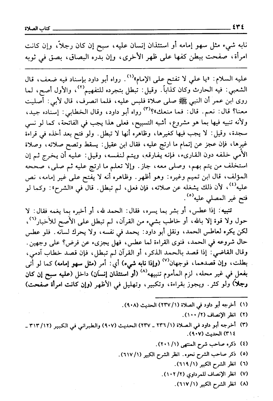 رَوَاهُ أَبُو دَاوُدَ بِإِسْنَادٍ فِيهِ ضَعْفٌ، قَالَ الشَّعْبِيُّ: فِيهِ الْحَارِثُ، وَكَانَ كَذَّابًا، وَقِيلَ: تَبْطُلُ بِتَجَرُّدِهِ لِلتَّفْهِيمِ، وَالْأَوَّلُ: أَصَحُّ لِمَا «رَوَى ابْنُ عُمَرَ أَنَّ النَّبِيَّ - صَلَّى اللَّهُ عَلَيْهِ وَسَلَّمَ - صَلَّى صَلَاةً فَلُبِّسَ عَلَيْهِ، فَلَمَّا انْصَرَفَ قَالَ لِأَبِي: أَصَلَّيْتَ مَعَنَا؛ قَالَ: نَعَمْ، قَالَ فَمَا مَنَعَكَ؛» رَوَاهُ أَبُو دَاوُدَ، وَقَالَ الْخَطَّابِيُّ: إِسْنَادُهُ جَيِّدٌ، وَلِأَنَّهُ تَنْبِيهٌ فِيهَا بِمَا هُوَ مَشْرُوعٌ، أَشْبَهَ التَّسْبِيحَ، فَعَلَى هَذَا يَجِبُ فِي الْفَاتِحَةِ، كَمَا لَوْ نَسِيَ سَجْدَةً، وَقِيلَ: لَا يَجِبُ فِيهَا كَغَيْرِهَا، وَظَاهِرُهُ أَنَّهَا لَا تَبْطُلُ، وَلَوْ فَتَحَ بَعْدَ أَخْذِهِ فِي قِرَاءَةِ غَيْرِهَا، فَإِنْ عَجَزَ عَنْ إِتْمَامِ مَا أُرْتِجَ عَلَيْهِ، فَقَالَ ابْنُ عَقِيلٍ: يَسْقُطُ، وَتَصِحُّ صَلَاتُهُ، وَصَلَاةُ الْأُمِّيِّ خَلْفَهُ دُونَ الْقَارِئِ، فَإِنَّهُ يُفَارِقُهُ، وَيُتِمُّ لِنَفْسِهِ، وَقِيلَ: عَلَيْهِ أَنْ يَخْرُجَ، ثُمَّ إِنِ اسْتَخْلَفَ مَنْ يُتِمُّ بِهِمْ، وَصَلَّى مَعَهُ جَازَ، وَإِلَّا تَعَلَّمَ مَا أُرْتِجَ عَلَيْهِ، ثُمَّ صَلَّى، صَحَّحَهُ الْمُؤَلِّفُ، قَالَ ابْنُ تَمِيمٍ وَغَيْرُهُ: وَهُوَ أَظْهَرُ، وَظَاهِرُهُ أَنَّهُ لَا يَفْتَحُ عَلَى غَيْرِ إِمَامِهِ، نُصَّ عَلَيْهِ، لِأَنَّ ذَلِكَ يَشْغَلُهُ عَنْ صَلَاتِهِ، فَإِنْ فَعَلَ لَمْ تَبْطُلْ، قَالَ فِي " الشَّرْحِ ": وَكَمَا لَوْ فَتَحَ غَيْرُ الْمُصَلِّي عَلَيْهِ.