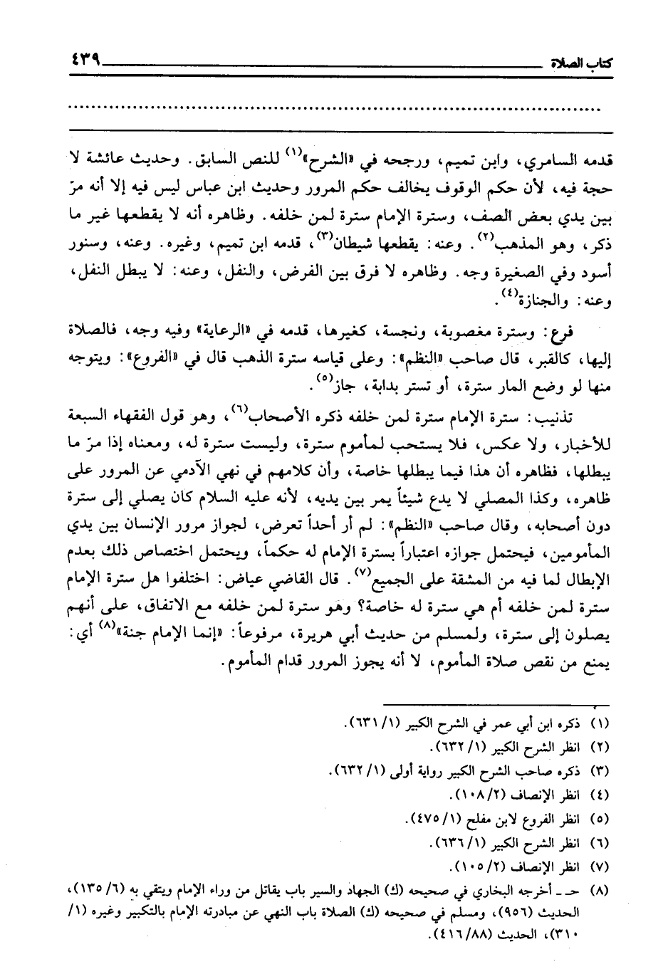 ـــــــــــــــــــــــــــــQقَدَّمَهُ السَّامِرِيُّ، وَابْنُ تَمِيمٍ، وَرَجَّحَهُ فِي " الشَّرْحِ " لِلنَّصِّ السَّابِقِ، وَحَدِيثُ عَائِشَةَ لَا حُجَّةَ فِيهِ، لِأَنَّ حُكْمَ الْوُقُوفِ يُخَالِفُ حُكْمَ الْمُرُورِ، وَحَدِيثُ ابْنِ عَبَّاسٍ لَيْسَ فِيهِ إِلَّا أَنَّهُ مَرَّ بَيْنَ يَدَيْ بَعْضِ الصَّفِّ، وَسُتْرَةُ الْإِمَامِ سُتْرَةٌ لِمَنْ خَلْفَهُ، وَظَاهِرُهُ أَنَّهُ لَا يَقْطَعُهَا غَيْرُ مَا ذُكِرَ، وَهُوَ الْمَذْهَبُ، وَعَنْهُ: يَقْطَعُهَا شَيْطَانٌ، قَدَّمَهُ ابْنُ تَمِيمٍ وَغَيْرُهُ، وَعَنْهُ: وَسِنَّوْرٌ أَسْوَدُ، وَفِي الصَّغِيرَةِ وَجْهٌ، وَظَاهِرُهُ لَا فَرْقَ بَيْنَ الْفَرْضِ وَالنَّفْلِ، وَعَنْهُ: لَا يَبْطُلُ النَّفْلُ، وَعَنْهُ: وَالْجِنَازَةُ.