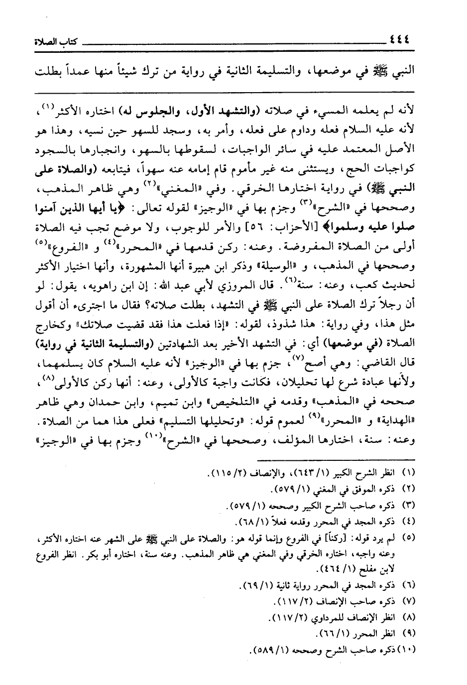 النَّبِيِّ - صَلَّى اللَّهُ عَلَيْهِ وَسَلَّمَ - فِي مَوْضِعِهَا، وَالتَّسْلِيمَةُ الثَّانِيَةُ فِي رِوَايَةِ مَنْ تَرَكَ شَيْئًا مِنْهَا عَمْدًا بَطَلَتْ