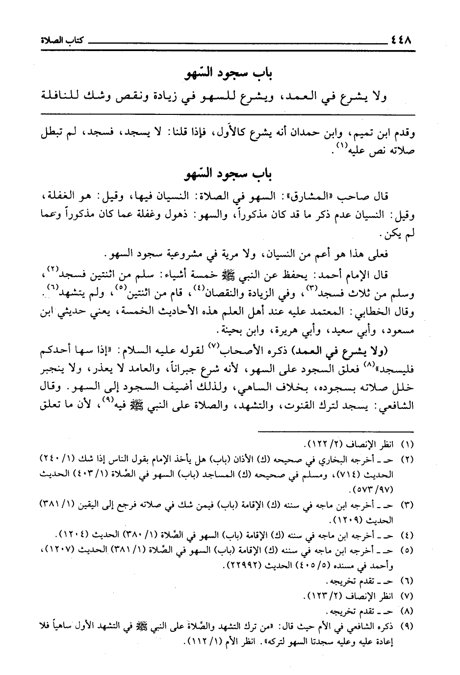 قَالَ الْإِمَامُ أَحْمَدُ: يُحْفَظُ عَنِ النَّبِيِّ - صَلَّى اللَّهُ عَلَيْهِ وَسَلَّمَ - خَمْسَةُ أَشْيَاءَ: سَلَّمَ مِنِ اثْنَتَيْنِ فَسَجَدَ، وَسَلَّمَ مِنْ ثَلَاثٍ فَسَجَدَ، وَفِي الزِّيَادَةِ وَالنُّقْصَانِ. قَامَ مِنِ اثْنَتَيْنِ، وَلَمْ يَتَشَهَّدْ. وَقَالَ الْخَطَّابِيُّ: الْمُعْتَمَدُ عَلَيْهِ عِنْدَ أَهْلِ الْعِلْمِ هَذِهِ الْأَحَادِيثُ الْخَمْسَةُ يَعْنِي حَدِيثَيِ ابْنِ مَسْعُودٍ، وَأَبِي سَعِيدٍ، وَأَبِي هُرَيْرَةَ، وَابْنِ بُحَيْنَةَ.