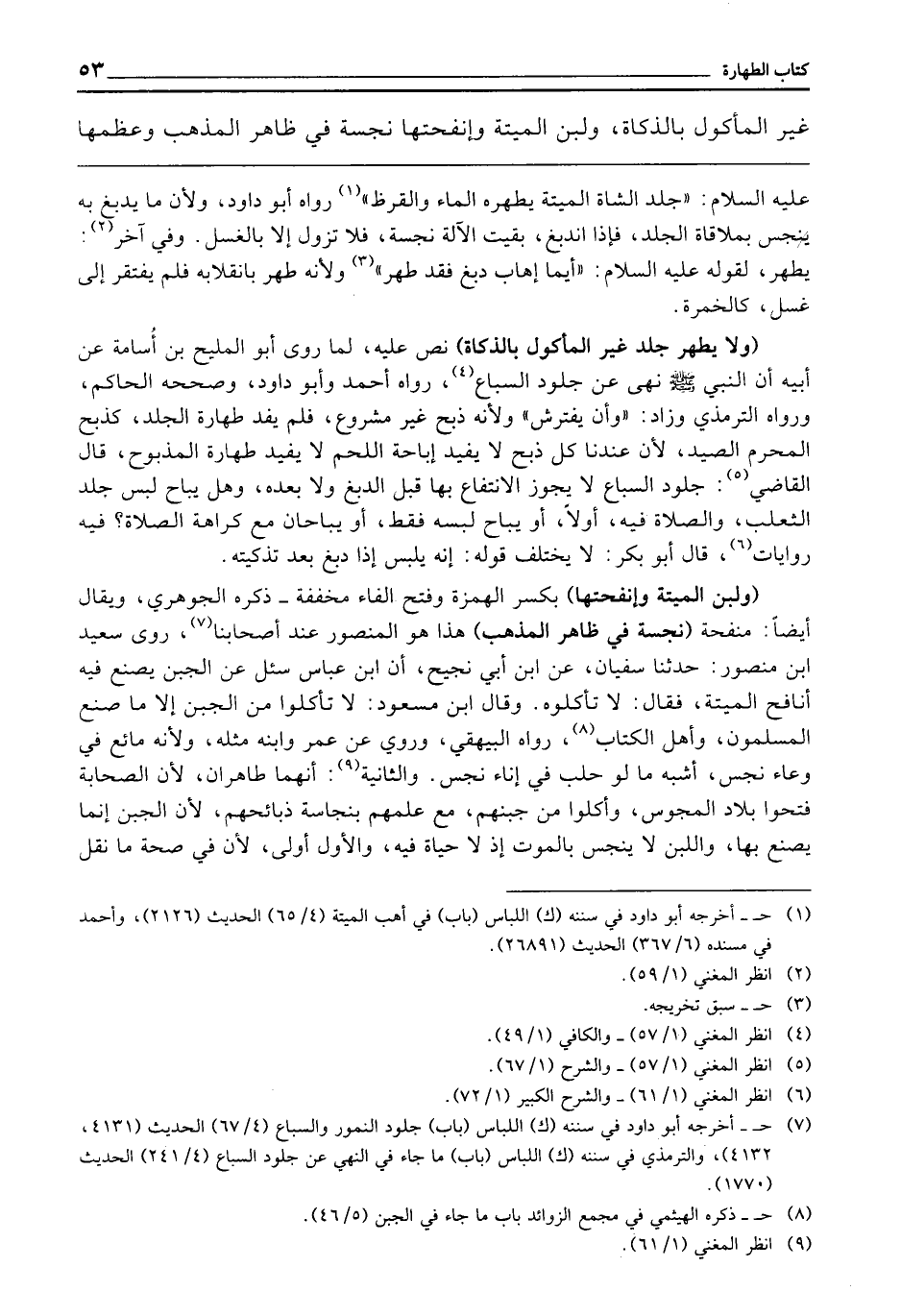 ـــــــــــــــــــــــــــــQ- عَلَيْهِ السَّلَامُ -: «جِلْدُ الشَّاةِ الْمَيْتَةِ يُطَهِّرُهُ الْمَاءُ وَالْقَرَظُ» رَوَاهُ أَبُو دَاوُدَ.