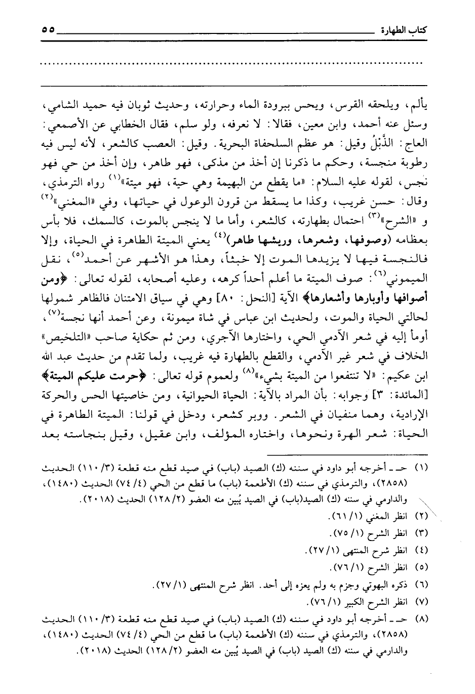 ـــــــــــــــــــــــــــــQيَأْلَمُ، وَيَلْحَقُهُ الْقَرْسُ، وَيُحِسُّ بِبُرُودَةِ الْمَاءِ وَحَرَارَتِهِ، وَحَدِيثُ ثَوْبَانَ فِيهِ حُمَيْدٌ الشَّامِيُّ، وَسُئِلَ عَنْهُ أَحْمَدُ، وَابْنُ مَعِينٍ فَقَالَا: لَا نَعْرِفُهُ، وَلَوْ سَلِمَ، فَقَالَ الْخَطَّابِيُّ، عَنِ الْأَصْمَعِيِّ: الْعَاجُ الذَّبْلُ، وَقِيلَ: هُوَ عَظْمُ السُّلَحْفَاةِ الْبَحْرِيَّةِ، وَقِيلَ: الْعَصَبُ كَالشَّعَرِ، لِأَنَّهُ لَيْسَ فِيهِ رُطُوبَةٌ مُنَجِّسَةٌ، وَحُكْمُ مَا ذَكَرْنَا إِنْ أُخِذَ مِنْ مُذَكًّى فَهُوَ طَاهِرٌ، وَإِنْ أُخِذَ مِنْ حَيٍّ فَهُوَ نَجِسٌ، لِقَوْلِهِ - عَلَيْهِ السَّلَامُ -: «مَا يُقْطَعُ مِنَ الْبَهِيمَةِ وَهِيَ حَيَّةٌ فَهُوَ مَيْتَةٌ» رَوَاهُ التِّرْمِذِيُّ، وَقَالَ: حَسَنٌ غَرِيبٌ، وَكَذَا مَا يَسْقُطُ مِنْ قُرُونِ الْوُعُولِ فِي حَيَاتِهَا، وَفِي " الْمُغْنِي "، و" الشَّرْحِ " احْتِمَالٌ بِطَهَارَتِهِ كَالشَّعَرِ، وَأَمَّا مَا لَا يَنْجُسُ بِالْمَوْتِ كَالسَّمَكِ فَلَا بَأْسَ بِعِظَامِهِ.