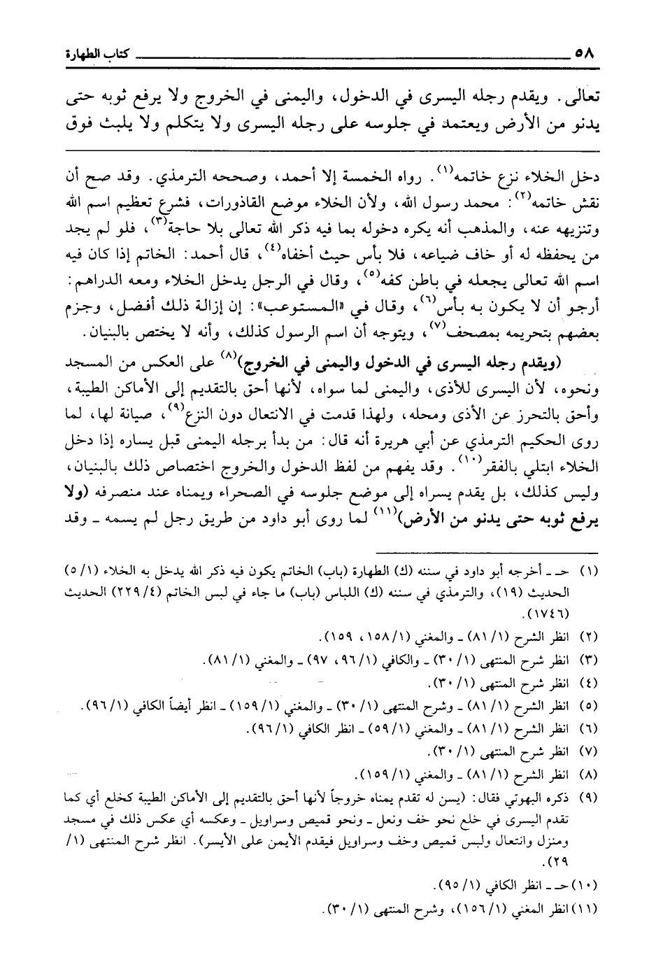 ـــــــــــــــــــــــــــــQدَخَلَ الْخَلَاءَ نَزَعَ خَاتَمَهُ» رَوَاهُ الْخَمْسَةُ إِلَّا أَحْمَدُ، وَصَحَّحَهُ التِّرْمِذِيُّ، وَقَدْ صَحَّ أَنَّ نَقْشَ خَاتَمِهِ: مُحَمَّدٌ رَسُولُ اللَّهِ، وَلِأَنَّ الْخَلَاءَ مَوْضِعُ الْقَاذُورَاتِ، فَشُرِعَ تَعْظِيمُ اسْمِ اللَّهِ، وَتَنْزِيهُهُ عَنْهُ، وَالْمَذْهَبُ: أَنَّهُ يُكْرَهُ دُخُولُهُ بِمَا فِيهِ ذِكْرُ اللَّهِ تَعَالَى بِلَا حَاجَةٍ، فَلَوْ لَمْ يَجِدْ مَنْ يَحْفَظُهُ لَهُ أَوْ خَافَ ضَيَاعَهُ فَلَا بَأْسَ حَيْثُ أَخْفَاهُ، قَالَ أَحْمَدُ: الْخَاتَمُ إِذَا كَانَ فِيهِ اسْمُ اللَّهِ تَعَالَى يَجْعَلُهُ فِي بَاطِنِ كَفِّهِ، وَقَالَ فِي الرَّجُلِ يَدْخُلُ الْخَلَاءَ، وَمَعَهُ الدَّرَاهِمُ: أَرْجُو أَنْ لَا يَكُونَ بِهِ بَأْسٌ، وَقَالَ فِي " الْمُسْتَوْعِبِ ": إِنَّ إِزَالَةَ ذَلِكَ أَفْضَلُ، وَجَزَمَ بَعْضُهُمْ بِتَحْرِيمِهِ بِمُصْحَفٍ، وَيَتَوَجَّهُ أَنَّ اسْمَ الرَّسُولِ كَذَلِكَ، وَأَنَّهُ لَا يَخْتَصُّ بِالْبُنْيَانِ.