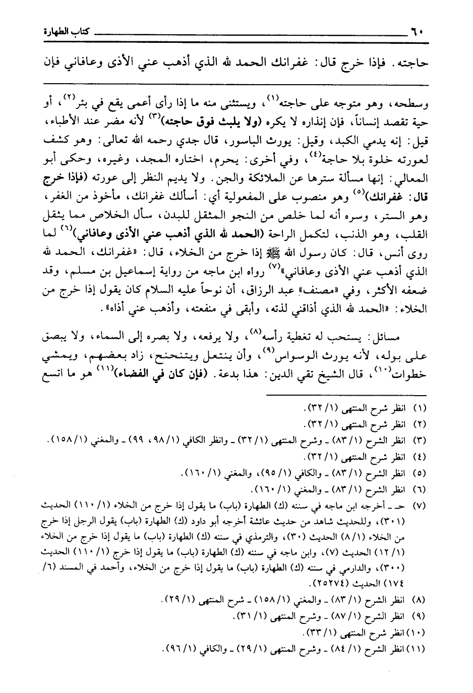 » مَسَائِلُ: يُسْتَحَبُّ لَهُ تَغْطِيَةُ رَأْسِهِ، وَلَا يَرْفَعُهُ، وَلَا بَصَرَهُ إِلَى السَّمَاءِ، وَلَا يَبْصُقُ عَلَى بَوْلِهِ، لِأَنَّهُ يُورِثُ الْوَسْوَاسَ، وَأَنْ يَنْتَعِلَ وَيَتَنَحْنَحَ، زَادَ بَعْضُهُمْ: وَيَمْشِيَ خُطُوَاتٍ، قَالَ الشَّيْخُ تَقِيُّ الدِّينِ: هَذَا بِدْعَةٌ (فَإِنْ كَانَ فِي الْفَضَاءِ) هُوَ مَا اتَّسَعَ