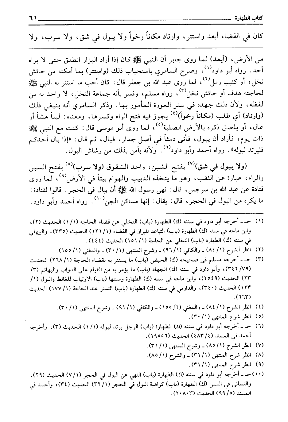 ـــــــــــــــــــــــــــــQمِنَ الْأَرْضِ (أَبْعَدَ) لِمَا رَوَى جَابِرٌ: «أَنَّ النَّبِيَّ - صَلَّى اللَّهُ عَلَيْهِ وَسَلَّمَ - كَانَ إِذَا أَرَادَ الْبَرَازَ انْطَلَقَ حَتَّى لَا يَرَاهُ أَحَدٌ» رَوَاهُ أَبُو دَاوُدَ، وَصَرَّحَ السَّامِرِيُّ بِاسْتِحْبَابِ ذَلِكَ (وَاسْتَتَرَ) بِمَا أَمْكَنَهُ مِنْ حَائِشِ نَخْلٍ، أَوْ كَثِيبِ رَمْلٍ، لِمَا رَوَى عَبْدُ اللَّهِ بْنُ جَعْفَرٍ قَالَ: «كَانَ أَحَبَّ مَا اسْتَتَرَ بِهِ النَّبِيُّ - صَلَّى اللَّهُ عَلَيْهِ وَسَلَّمَ - لِحَاجَتِهِ هَدَفٌ، أَوْ حَائِشُ نَخْلٍ» رَوَاهُ مُسْلِمٌ، وَفُسِّرَ بِأَنَّهُ جَمَاعَةُ النَّخْلِ لَا وَاحِدَ لَهُ مِنْ لَفْظِهِ، وَلِأَنَّ ذَلِكَ جُهْدُهُ فِي سَتْرِ الْعَوْرَةِ الْمَأْمُورِ بِهَا، وَذَكَرَ السَّامِرِيُّ أَنَّهُ يَنْبَغِي ذَلِكَ (وَارْتَادَ) أَيْ: طَلَبَ (مَكَانًا رَخْوًا) يَجُوزُ فِيهِ فَتْحُ الرَّاءِ وَكَسْرُهَا، وَمَعْنَاهُ: لَيِّنًا هَشًّا أَوْ عَالٍ، أَوْ يُلْصِقُ ذَكَرَهُ بِالْأَرْضِ الصُّلْبَةِ، لِمَا رَوَى أَبُو مُوسَى قَالَ: «كُنْتُ مَعَ النَّبِيِّ - صَلَّى اللَّهُ عَلَيْهِ وَسَلَّمَ - ذَاتَ يَوْمٍ، فَأَرَادَ أَنْ يَبُولَ، فَأَتَى دَمِثًا فِي أَصْلِ جِدَارٍ، فَبَالَ، ثُمَّ قَالَ: إِذَا بَالَ أَحَدُكُمْ فَلْيَرْتَدْ لِبَوْلِهِ» رَوَاهُ أَحْمَدُ، وَأَبُو دَاوُدَ، وَلِأَنَّهُ يَأْمَنُ بِذَلِكَ مِنْ رَشَاشِ الْبَوْلِ.