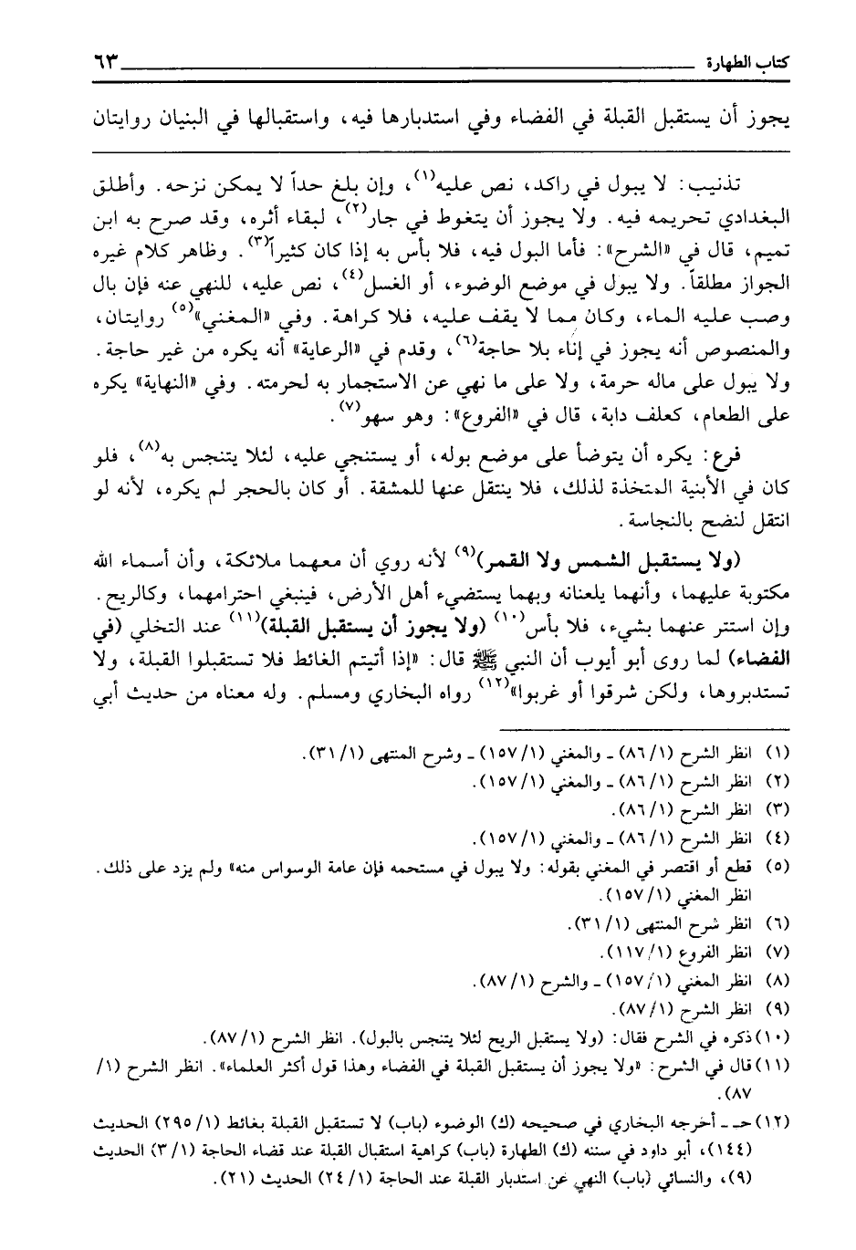 يَجُوزُ أَنْ يَسْتَقْبِلَ الْقِبْلَةَ فِي الْفَضَاءِ وَفِي اسْتِدْبَارِهَا فِيهِ، وَاسْتِقْبَالِهَا فِي الْبُنْيَانِ رِوَايَتَانِ.