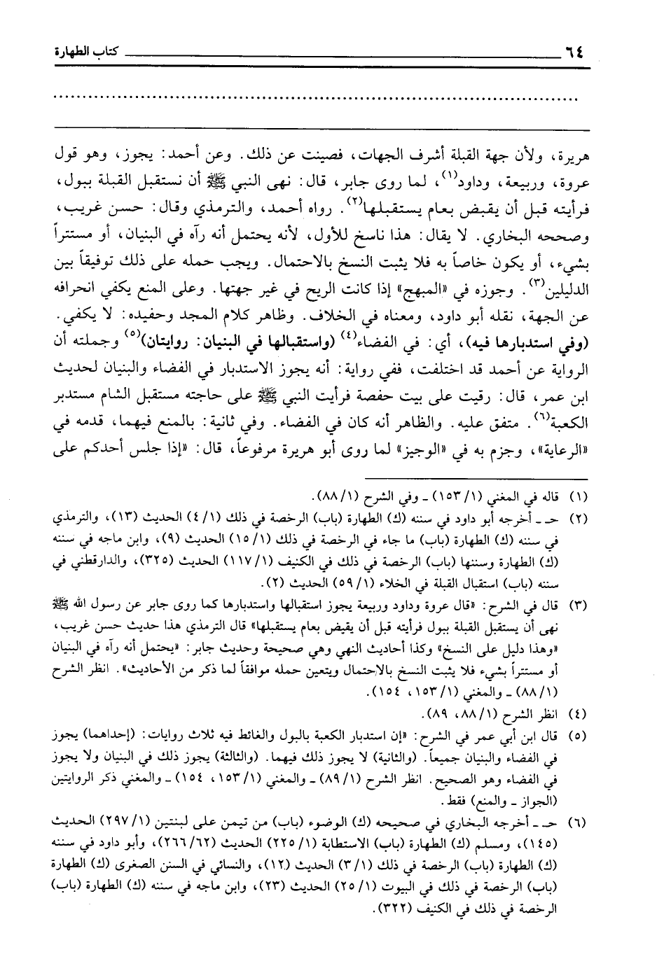 لَا يُقَالُ: هَذَا نَاسِخٌ لِلْأَوَّلِ، لِأَنَّهُ يُحْتَمَلُ أَنَّهُ رَآهُ فِي الْبُنْيَانِ، أَوْ مُسْتَتِرًا بِشَيْءٍ، أَوْ يَكُونُ خَاصًّا بِهِ، فَلَا يَثْبُتُ النَّسْخُ بِالِاحْتِمَالِ، وَيَجِبُ حَمْلُهُ عَلَى ذَلِكَ تَوْفِيقًا بَيْنَ الدَّلِيلَيْنِ، وَجَوَّزَهُ فِي " الْمُبْهِجِ " إِذَا كَانَتِ الرِّيحُ فِي غَيْرِ جِهَتِهَا، وَعَلَى الْمَنْعِ يَكْفِي انْحِرَافُهُ عَنِ الْجِهَةِ، نَقَلَهُ أَبُو دَاوُدَ، وَمَعْنَاهُ فِي الْخِلَافِ، وَظَاهِرُ كَلَامِ الْمَجْدِ وَحَفِيدِهِ: لَا يَكْفِي (وَفِي اسْتِدْبَارِهَا فِيهِ) أَيْ: فِي الْفَضَاءِ (وَاسْتِقْبَالِهَا فِي الْبُنْيَانِ: رِوَايَتَانِ) وَجُمْلَتُهُ أَنَّ الرِّوَايَةَ عَنْ أَحْمَدَ قَدِ اخْتَلَفَتْ، فَفِي رِوَايَةٍ: أَنَّهُ يَجُوزُ الِاسْتِدْبَارُ فِي الْفَضَاءِ وَالْبُنْيَانِ لِحَدِيثِ ابْنِ عُمَرَ، قَالَ: «رَقَيْتُ عَلَى بَيْتِ حَفْصَةَ فَرَأَيْتُ النَّبِيَّ - صَلَّى اللَّهُ عَلَيْهِ وَسَلَّمَ - عَلَى حَاجَتِهِ، مُسْتَقْبِلَ الشَّامِ، مُسْتَدْبِرَ الْكَعْبَةِ» مُتَّفَقٌ عَلَيْهِ، وَالظَّاهِرُ أَنَّهُ كَانَ فِي الْفَضَاءِ، وَفِي ثَانِيَةٍ: بِالْمَنْعِ فِيهِمَا، قَدَّمَهُ فِي " الرِّعَايَةِ "، وَجَزَمَ بِهِ فِي " الْوَجِيزِ " لِمَا رَوَى أَبُو هُرَيْرَةَ مَرْفُوعًا قَالَ: «إِذَا جَلَسَ أَحَدُكُمْ عَلَى