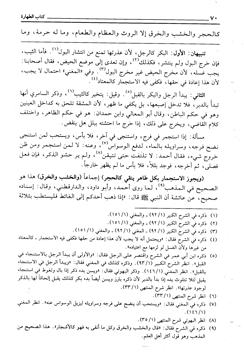 (وَيَجُوزُ الِاسْتِجْمَارُ بِكُلِّ طَاهِرٍ يُنَقِّي كَالْحَجَرِ) إِجْمَاعًا، (وَالْخَشَبِ، وَالْخِرَقِ) هَذَا هُوَ الصَّحِيحُ فِي الْمَذْهَبِ، لِمَا رَوَى أَحْمَدُ، وَأَبُو دَاوُدَ، وَالدَّارَقُطْنِيُّ، وَقَالَ: إِسْنَادُهُ صَحِيحٌ، عَنْ عَائِشَةَ أَنَّ النَّبِيَّ - صَلَّى اللَّهُ عَلَيْهِ وَسَلَّمَ - قَالَ: «إِذَا ذَهَبَ أَحَدُكُمْ إِلَى الْغَائِطِ، فَلْيَسْتَطِبْ بِثَلَاثَةِ